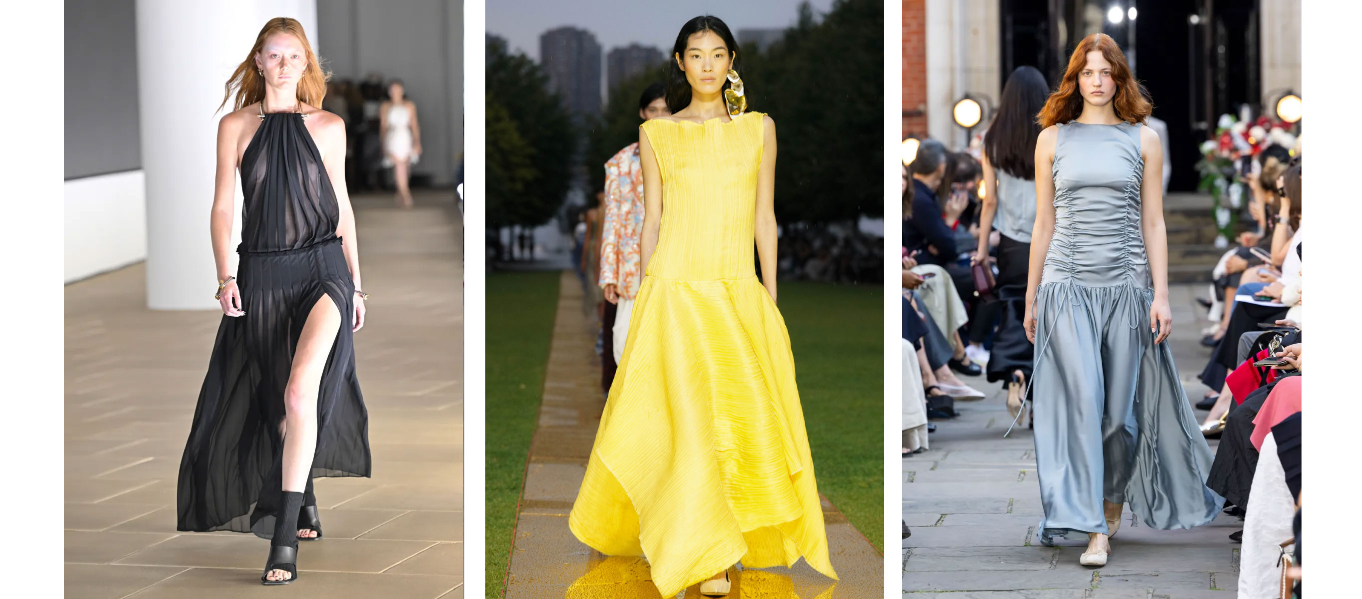 Доповнює серію повітряних суконь, які є незамінними влітку, також Dion Lee та корейський бренд Eudon Choi. Натомість у Prabal Gurung зробили ставку на поширену для суконь із заниженою талією максідовжину, акцентний жовтий колір і не менш акцентні сюрреалістичні сережки для одного вуха.