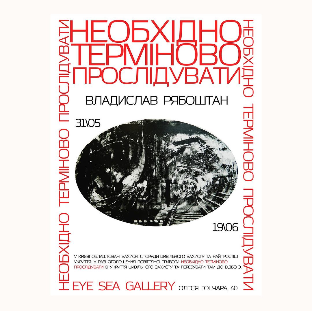 «Необхідно терміново прослідувати» — слова, які одразу асоціативно відсилають до сигналу повітряної тривоги й потреби перейти в безпечне місце. Серед таких укриттів — метро, куди на початку повномасштабного вторгнення люди приходили з документами, їжею, ковдрами й ночували на станціях. Сьогодні об'єкт продовжує слугувати прихистком для містян. Полотна Владислава Рябоштана, зокрема, досліджують це місце. «У них слова, відчуття й реалії сплелись у нервовий клубок», — йдеться в анонсі експозиції. «Витесались нові значення та сприйняття перероджених структур».