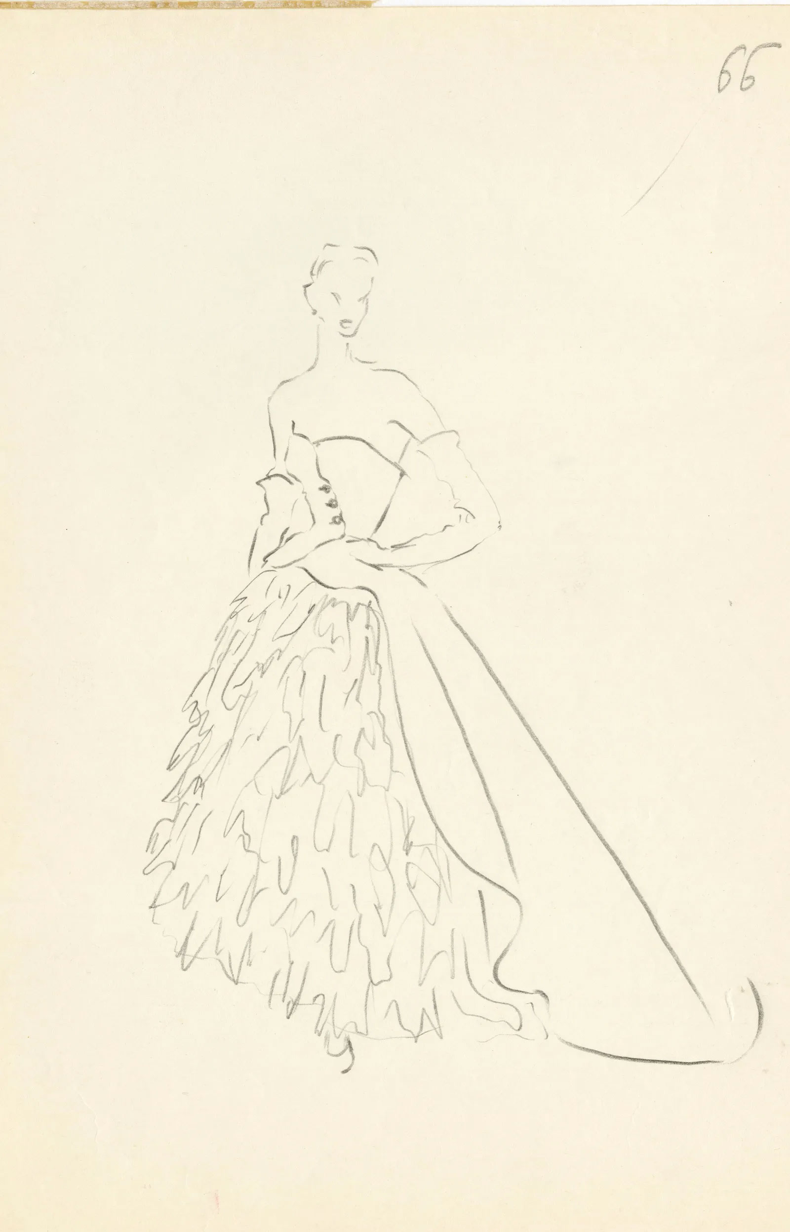 Сукня стала одним з образів високої моди, представленої Крістобалем в сезоні spring — 1951. На її створення дизайнера надихнув танець фламенко, широко поширений в його рідній Іспанії. Сукня найбільш відома за фотографією Річарда Аведона, на якій зображена одна з перших топ моделей Доріан Лі.