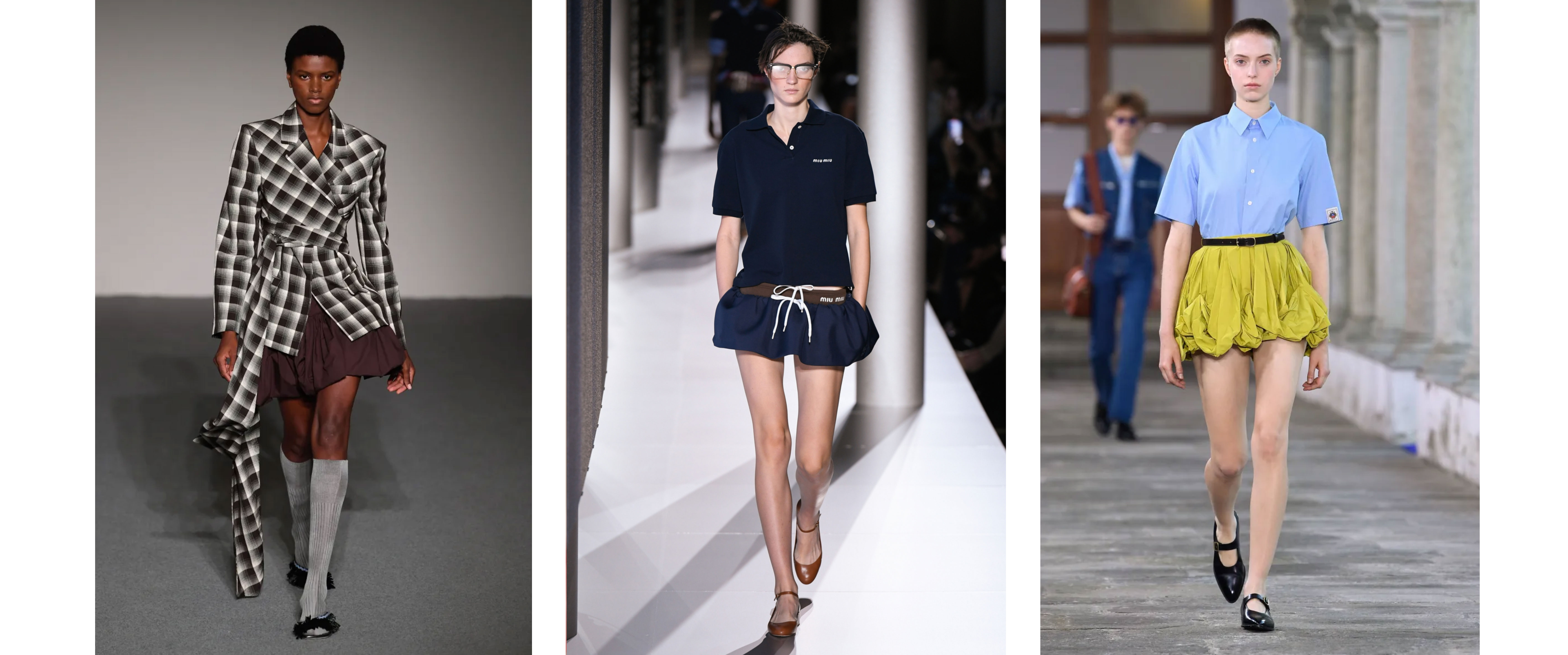 Натомість у Miu Miu вирішили транслювати більш розслаблений настрій із поєднанням короткої спідниці bubble, невимушено розстібнутого поло й гіковських окулярів. Продовжує плеяду образів, натхненних преппі, і MSGM. На показі бренду спідницю bubble доповнили картатий жакет із запахом, гольфи та босоніжки на плоскій підошві з бантами.