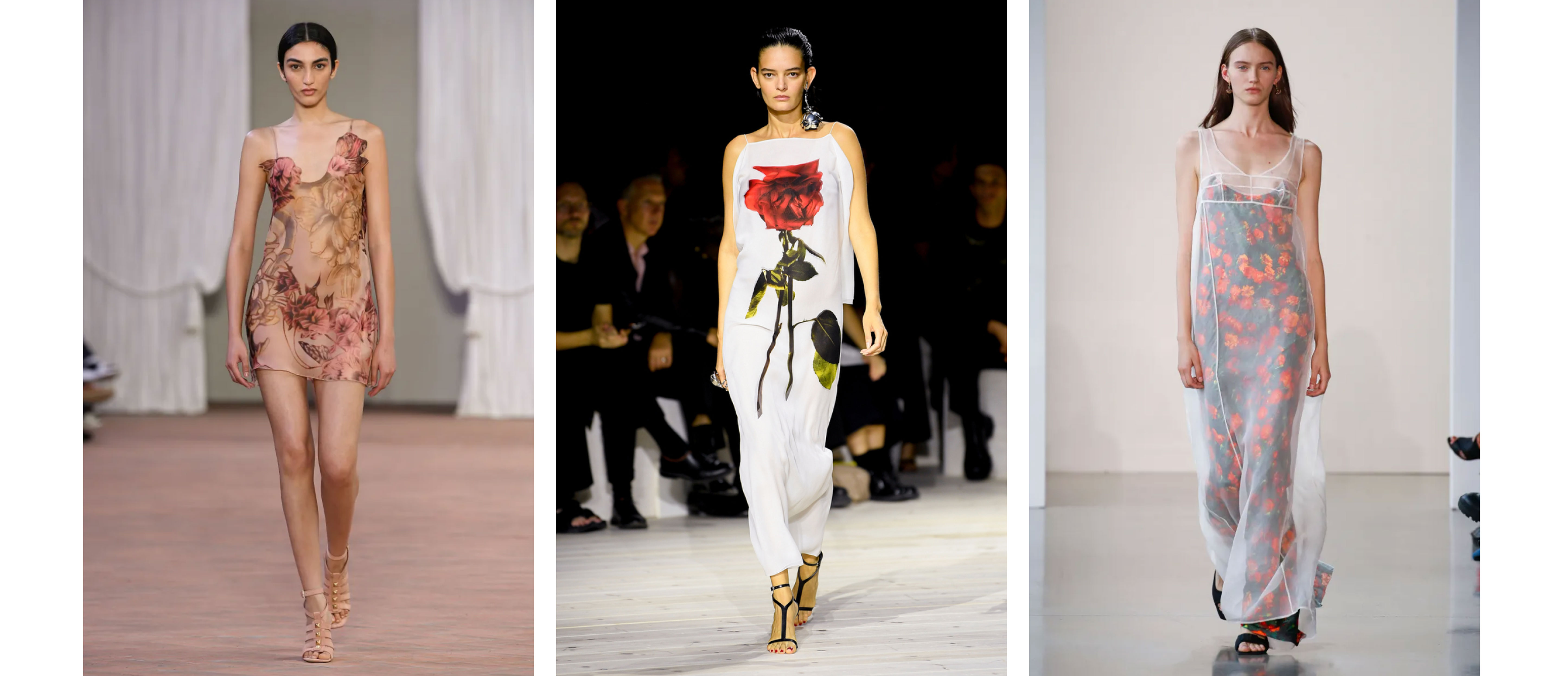 Хоч флористичні мотиви практично синонімічні з весняно-літнім сезоном, модні будинки та бренди не втомлюються їх переосмислювати та експериментувати з ними. Це ілюструє, зокрема, ніжна сукня Bevza з українськими чорнобривцями. А також — спокуслива мініопція від Alberta Ferretti й біла модель від Alexander McQueen, що прямолінійна й освіжна у своєму квітковому спрямуванні.