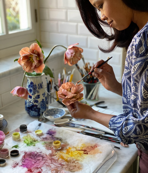 Відповідь проста і водночас дуже складна: трохи цукрової пудри, яєчний білок і загущувач створюють пасту, що є основою для безмежних можливостей ліплення. Щоб точно змоделювати цукрову квітку, потрібно вивчити її анатомічні частини. Так само як це колись робила натуралістка та наукова ілюстраторка Марія Сибілла Меріан у своїх новаторських малюнках метаморфоз комах у 1600-х роках. Цукрова паста дозволяє тонко, витончено та майже досконало передати кожну тичинку, пелюсточку та вигин стебла.