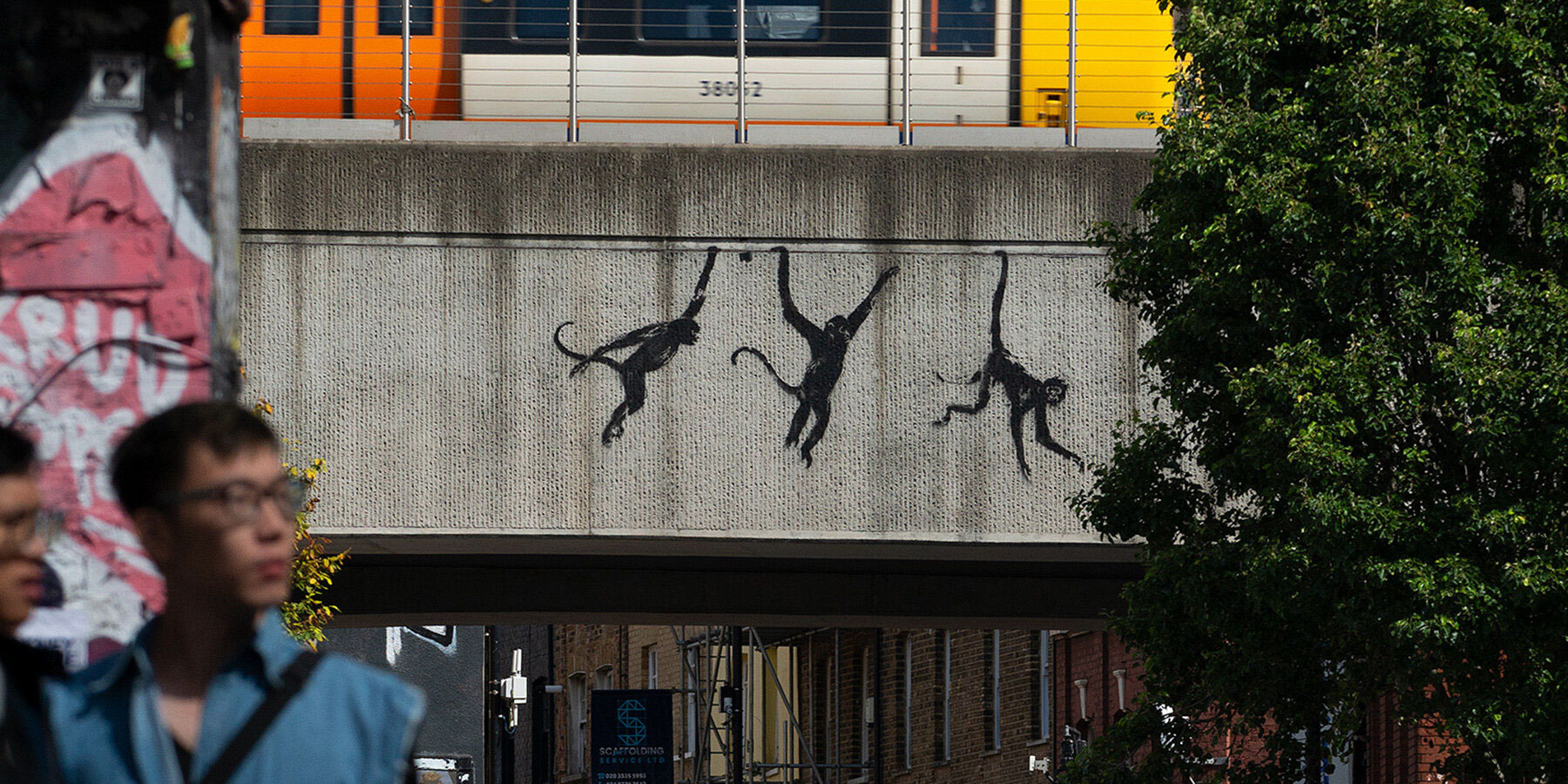 Однією з перших робіт художника, помічених на вулицях Лондона, став трафарет з трьох мавп, символізм яких відкритий для роздумів глядачів. У Мережі вже з’явилось декілька теорій, які пояснюють історію створення малюнку. Одні говорять, що мавпи мають нагадати жителям про людяність, водночас інші будують здогадки про ідею згуртованості та соціуму.