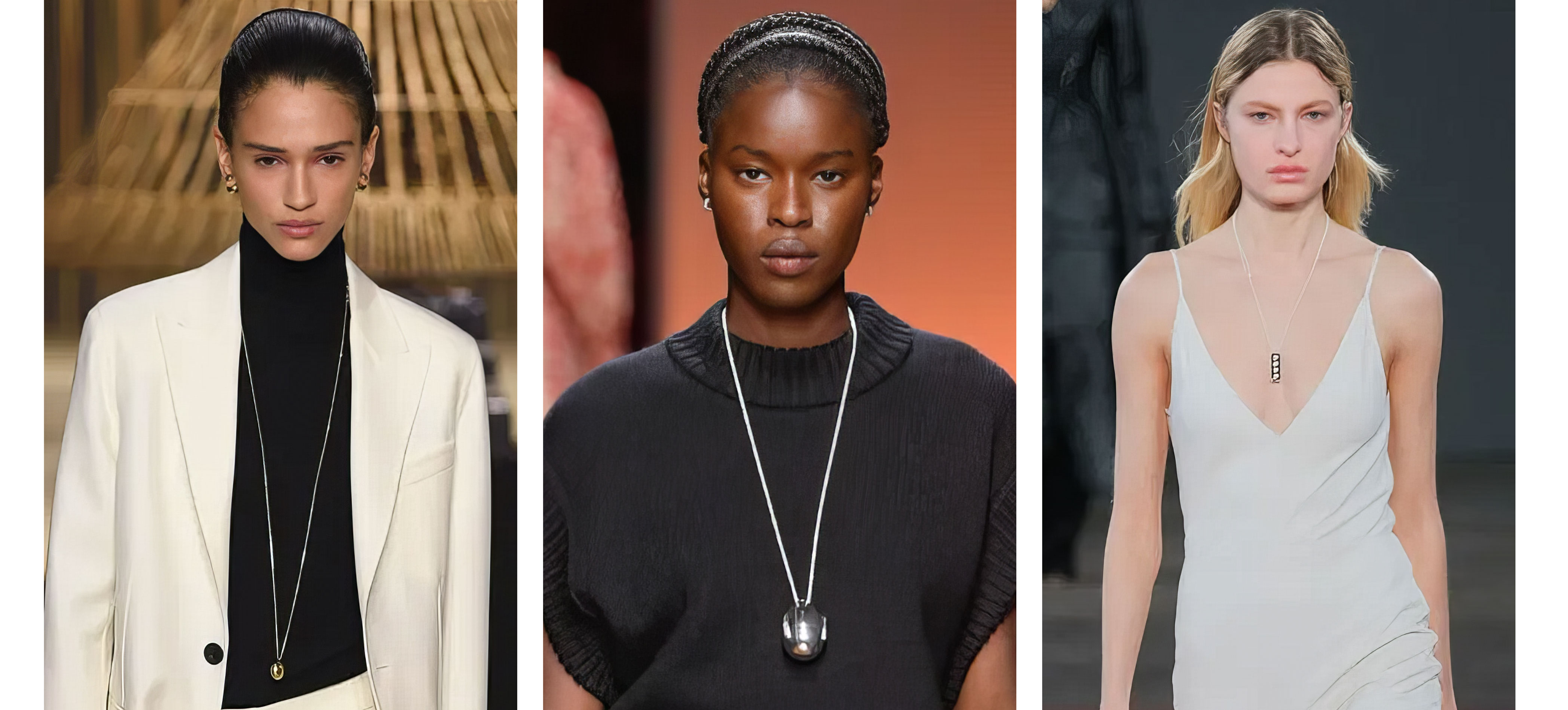Цього сезону модні бренди й будинки пропонують звернути увагу на довгі підвіски — невимушені та акцентні. Така прикраса додає продуманості, приміром, мінімалістичним образам і лаконічним фактурам. У Bottega Veneta нею доповнили ансамбль із чорним драпірованим топом, а Dior зробили ставку на комбінацію з білим костюмом та водолазкою. Заразом Gabriela Hearst додали довгу підвіску до білої сукні в білизняному стилі.