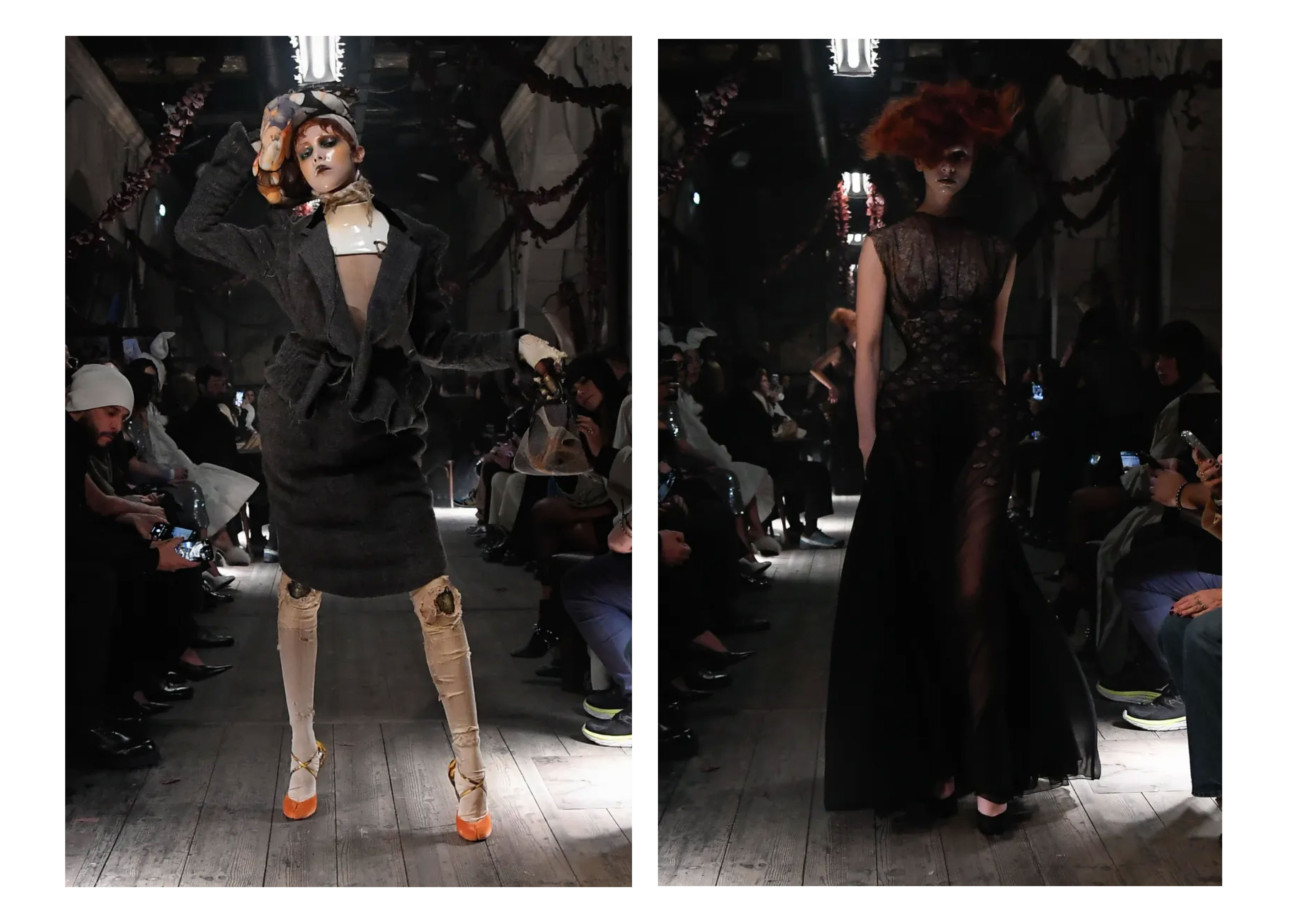 Один із найпам’ятніших цьогорічних показів — це кутюрне шоу Maison Margiela весна-літо 2024 за очільництва дизайнера Джона Гальяно. Під мостом Александра ΙΙΙ крокували химерні герої нічного Парижа. Їхні тіла обрамлювали тугі корсети, казкові капелюхи, деконструйовані жакети, прозорі та мереживні матеріали. Доповнювали цю нічну фантазію хаотичні начесані зачіски та віральний фарфоровий лялькоподібний макіяж від візажистки Пет Макграт.