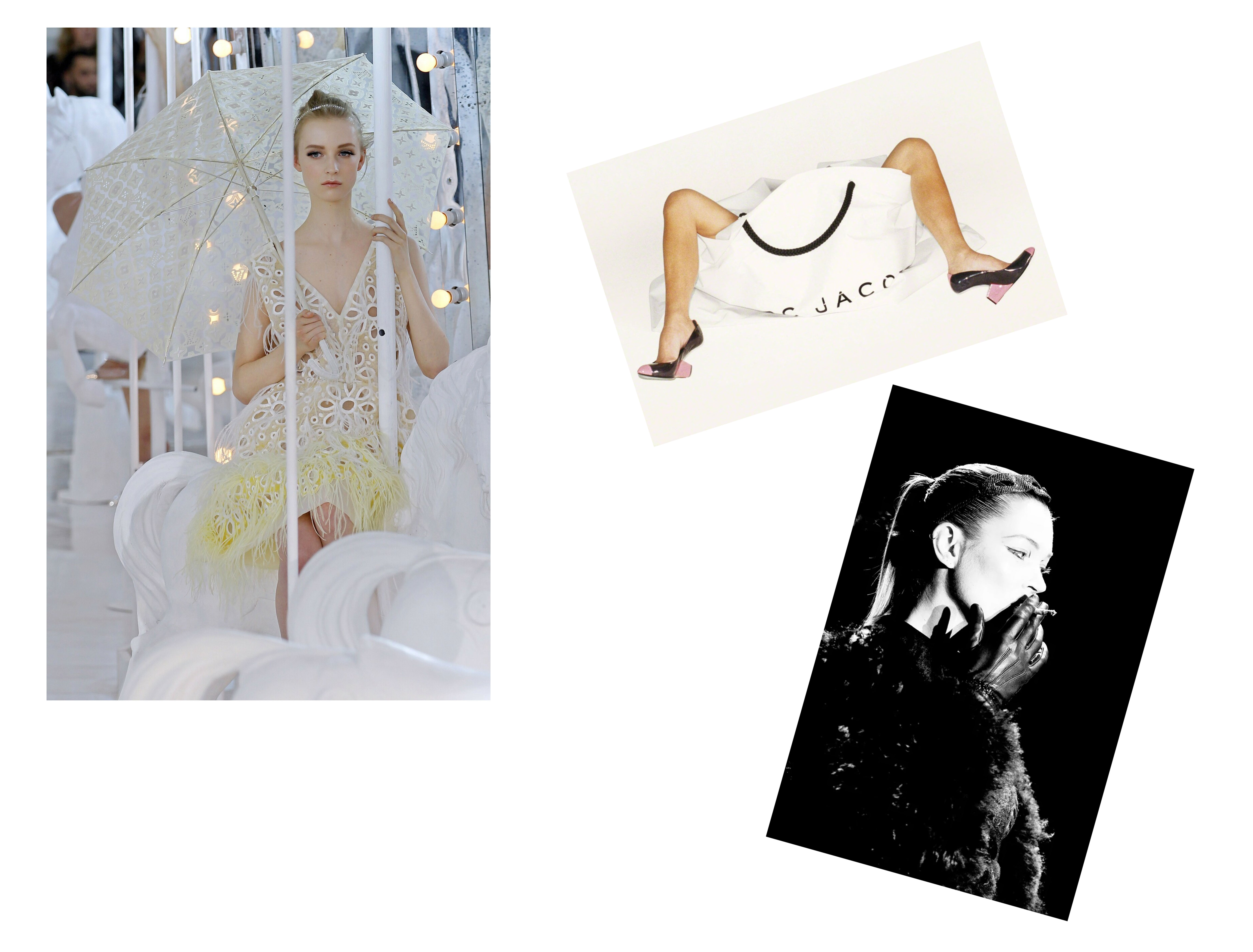 За годинниковою стрілкою: Марк Джейкобс для Louis Vuitton весна-літо 2012, Вікторія Бекхем для кампейну бренду Marc Jacobs, Кейт Мосс на показі колекції Марка Джейкобса для Louis Vuitton осінь-зима 2011/2012