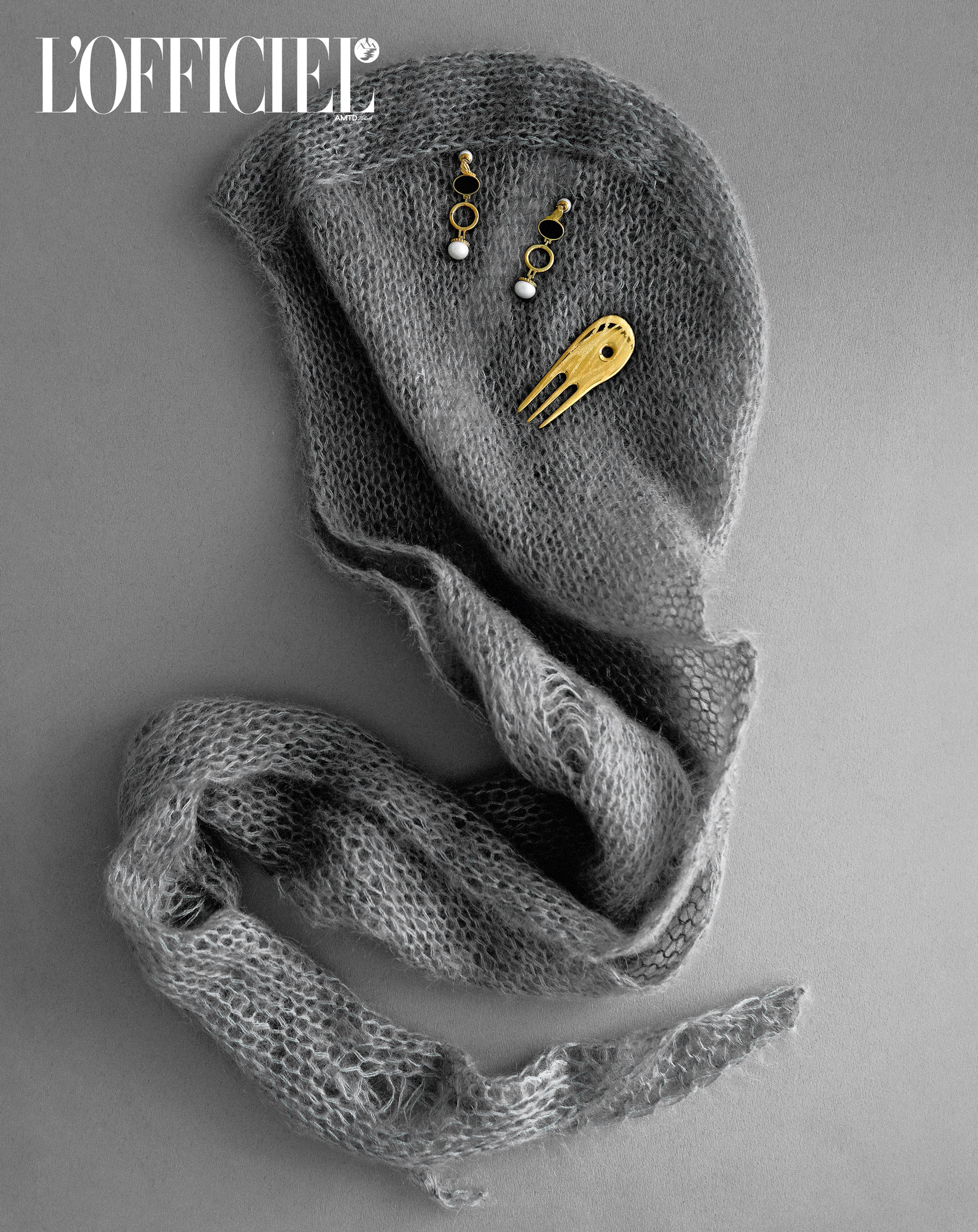 Шарф із каптуром, шовк та мохер, UNMERE. Cережки з натуральними перлинами та оніксом, GUNIA PROJECT. Гребінь-тризуб, латунь із золотим покриттям, SHTOR