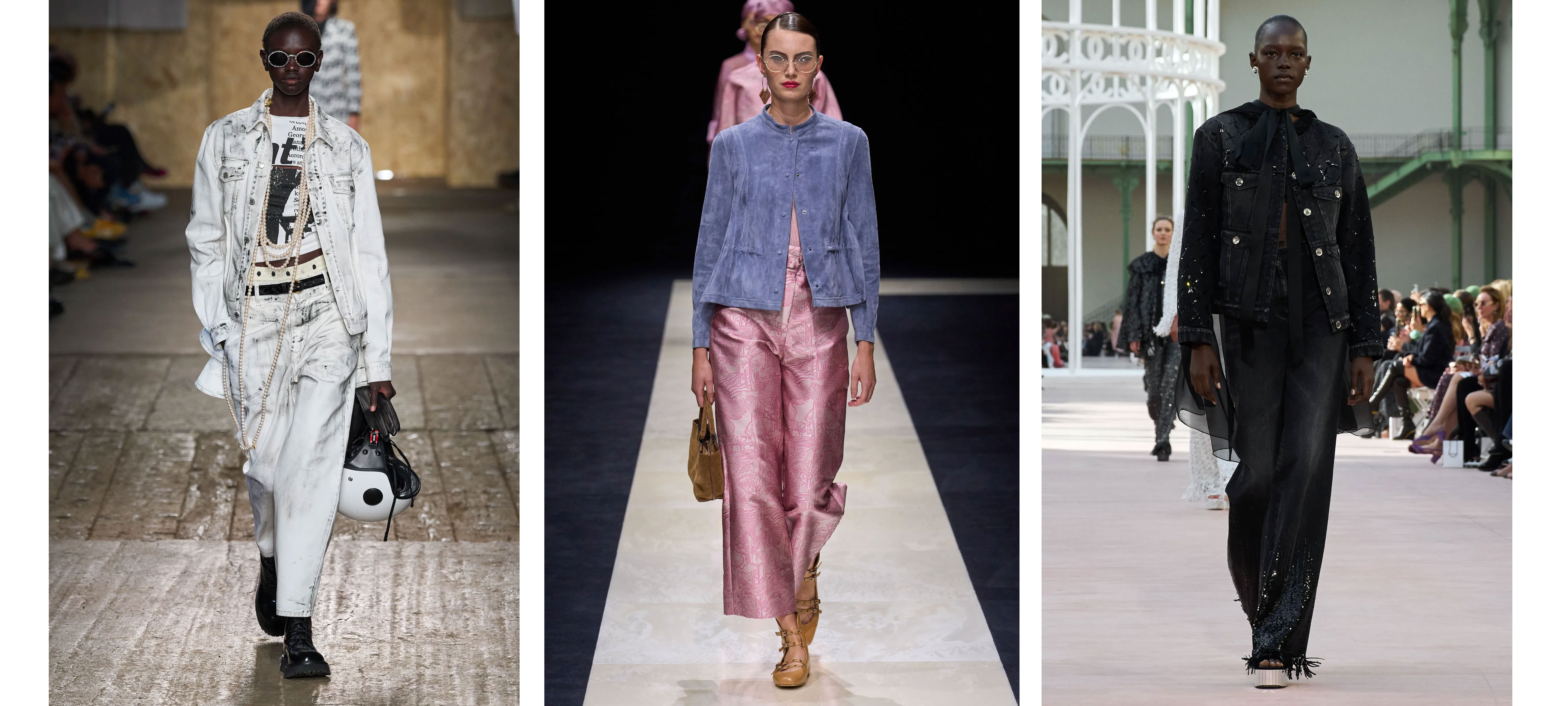 Немає поганого сезону для позачасових денімових курток, вважають дизайнери. Вкотре підтверджують це Chanel із чорною опцією з сяйливим декором, Moschino — з моделлю з ілюзійним ефектом, схожим на доторки до чорної фарби, а також Emporio Armani з елегантним ансамблем у супроводі шовкових штанів.