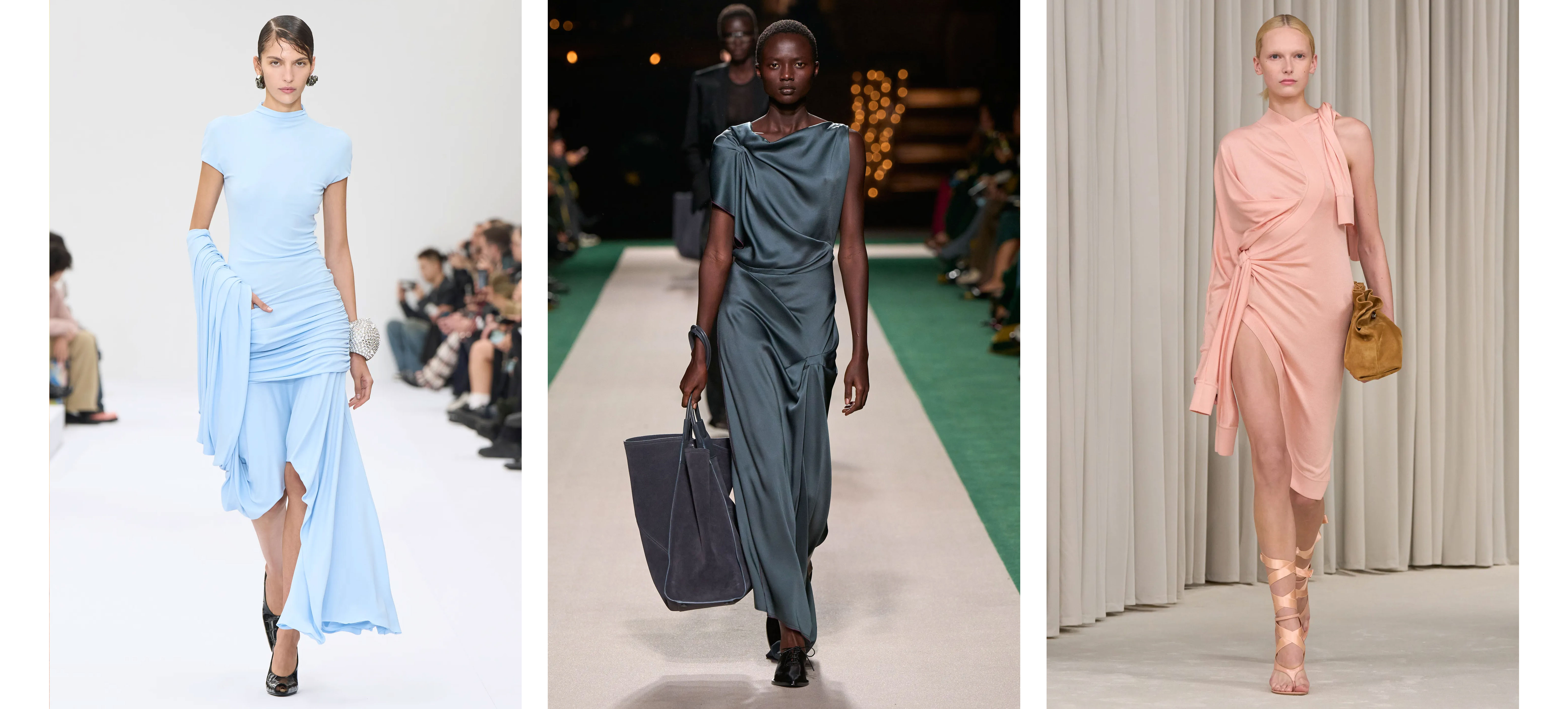 Драпіровані сукні — безпрограшний вибір, якщо ви прагнете інкапсулювати елегантність і вишуканість. Acne Studios представили її в небесно-блакитному відтінку, Ferragamo зробили ставку на трендовий пастельний рожевий, водночас Victoria Beckham експериментували з драпіруванням в зоні біля стегна та плечей.
