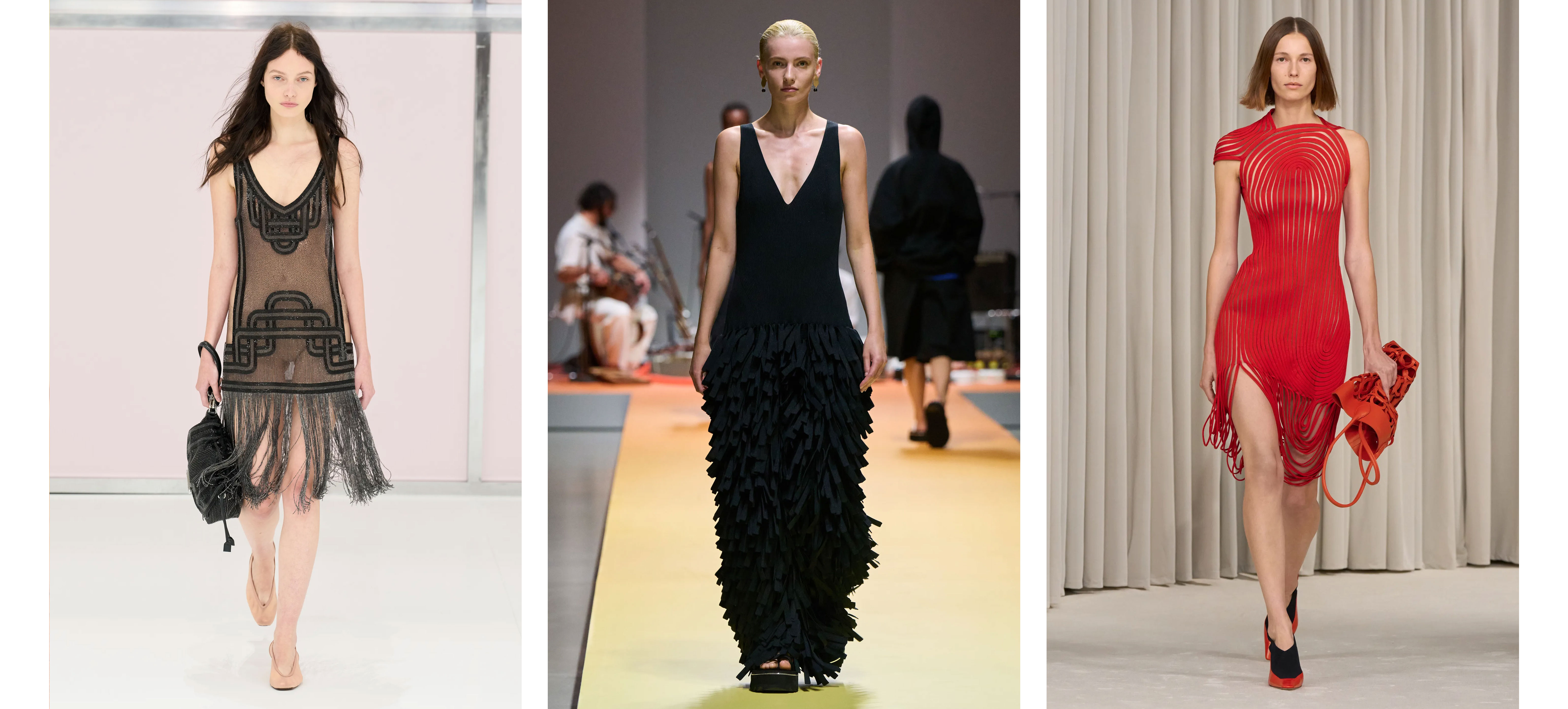 Якщо виокремлювати тренд, котрий вже кілька сезонів залишається фаворитом дизайнерів, — то це речі з торочками. CFCL продемонстрували витончену опцію з глибоким V-вирізом і короткими смужками, що рясно оздоблювали ансамбль, Ferragamo загравали з торочками, які «переходили» в сукню, а Fendi перенесли модниць в ревучі двадцяті із вбранням сучасних флеперок.