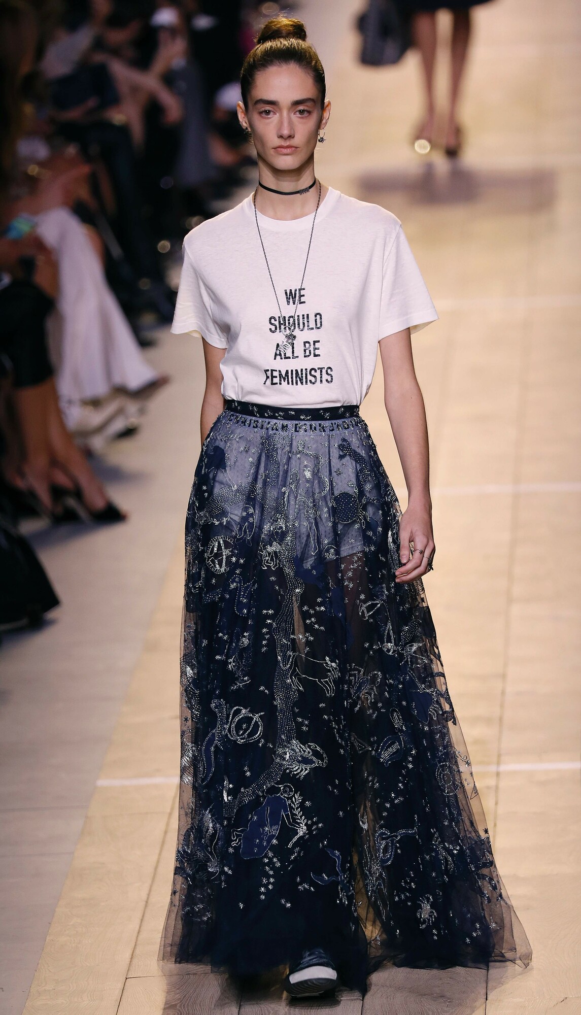 Марія Грація К’юрі — італійська дизайнерка, що стала першою жінкою на посаді креативної директорки Dior за його 70-літню історію. У межах своєї першої колекції для модного дому вона представила футболки з надписом «Ми всі повинні бути феміністками». Вони відсилали до книги з такою ж назвою, котра порушувала питання значення фемінізму в сучасності, від нігерійської письменниці Чімаманди Нґозі Адічі. Попри суперечливі реакції на такі футболки, вони стали символічними, впізнаваними речами — і як «особлива» відзнака успіху невдовзі поширилися у вигляді численних копій.