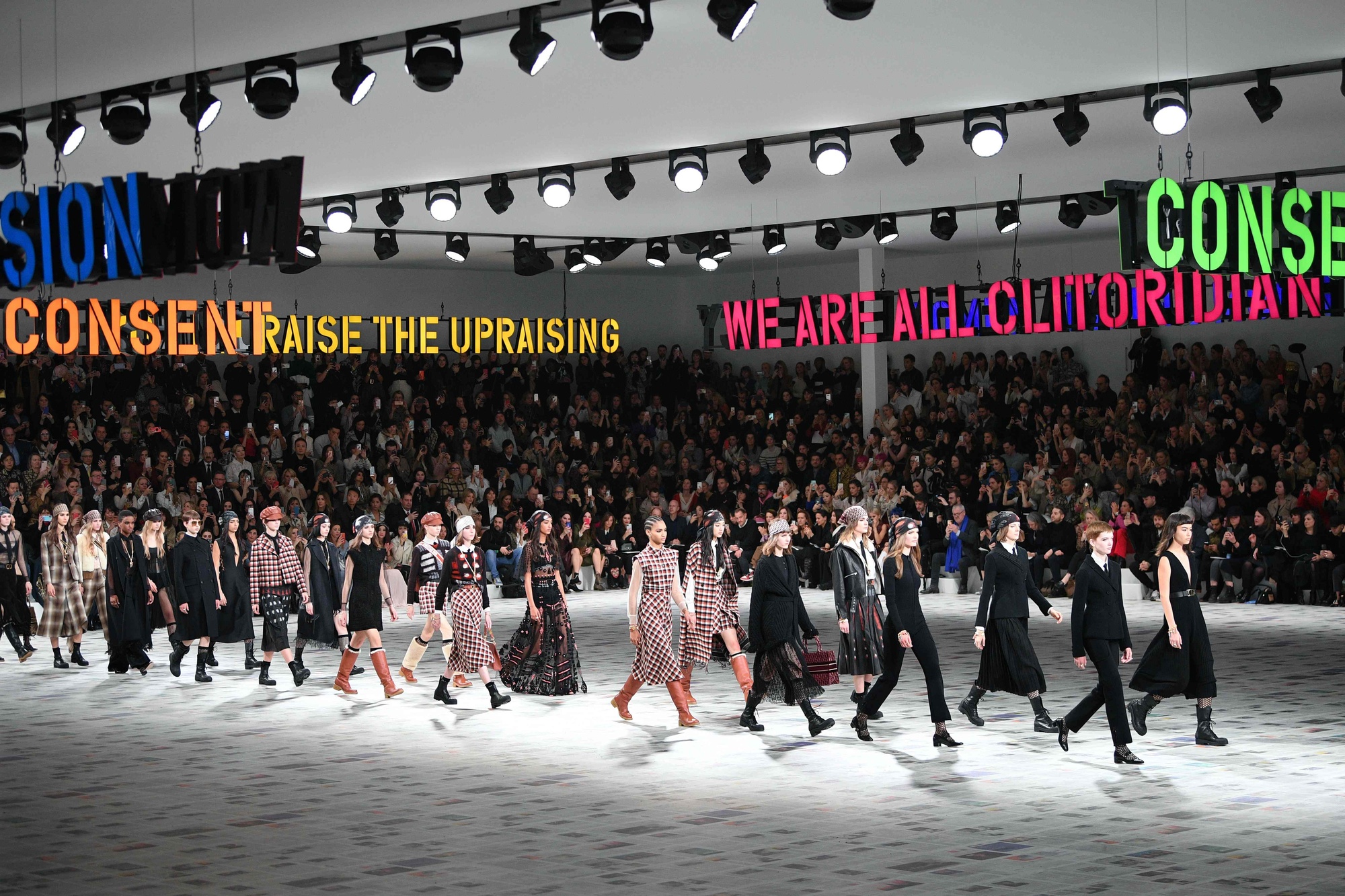 Показ Dior осінь-зима 2020/2021 проходив у час, коли розгорталася гучна судова справа проти голлівудського продюсера Гарві Вайнштейна — того року його визнали в сексуальному насильстві. Сценографію шоу склали маніфестаційні артроботи, які являли собою, зокрема надписи «Згода», створені мистецьким тандемом Claire Fontaine.