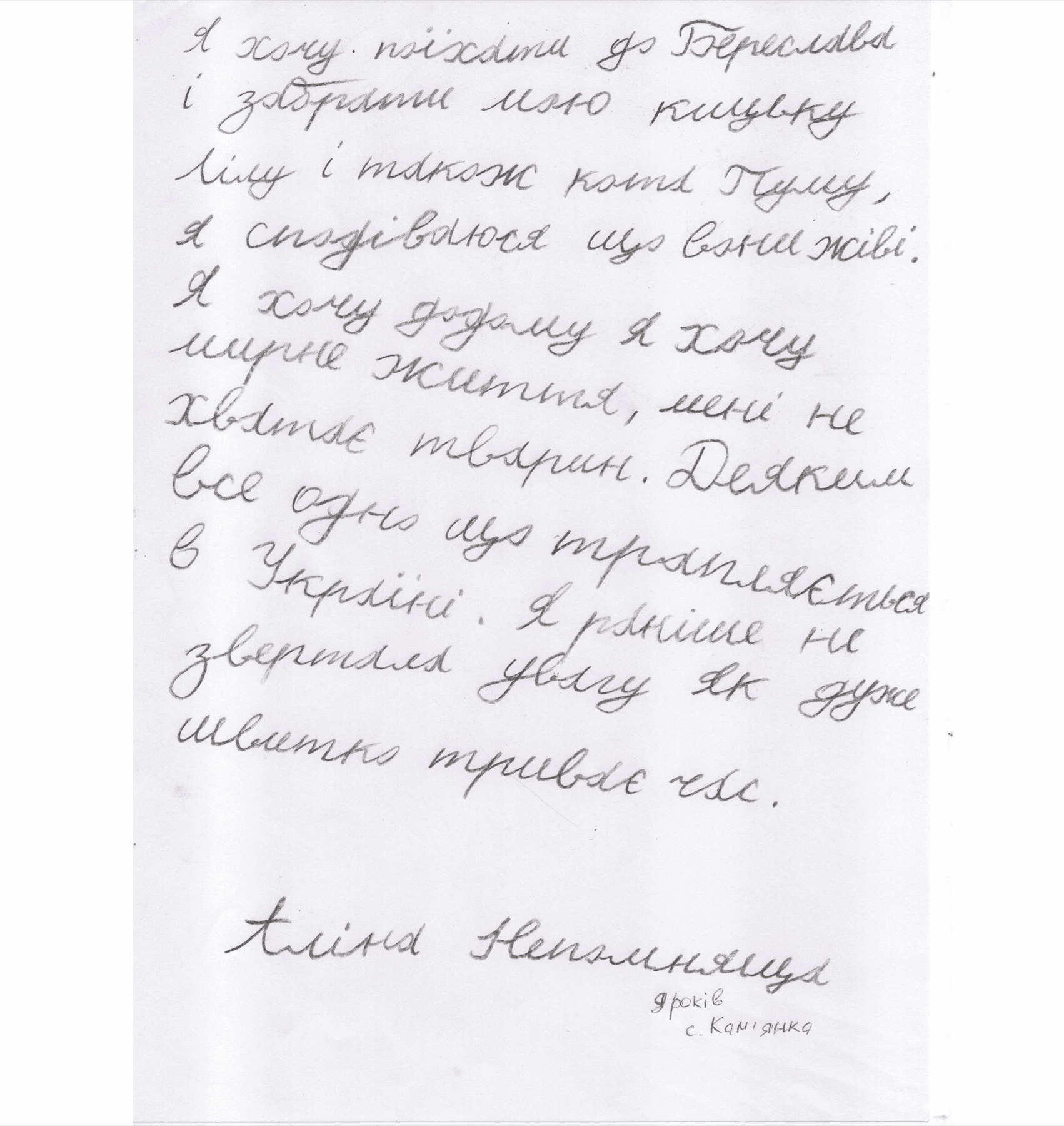 Кілька разів діти сприйняли це завдання як тему для есе. В одному з них Аліна з Херсонщини, розмірковує про те, як вона хоче потрапити додому, але не може цього зробити. Маленька дитина усвідомлює, що щось неможливе, — в перші рази в житті розуміє таку трагедію.