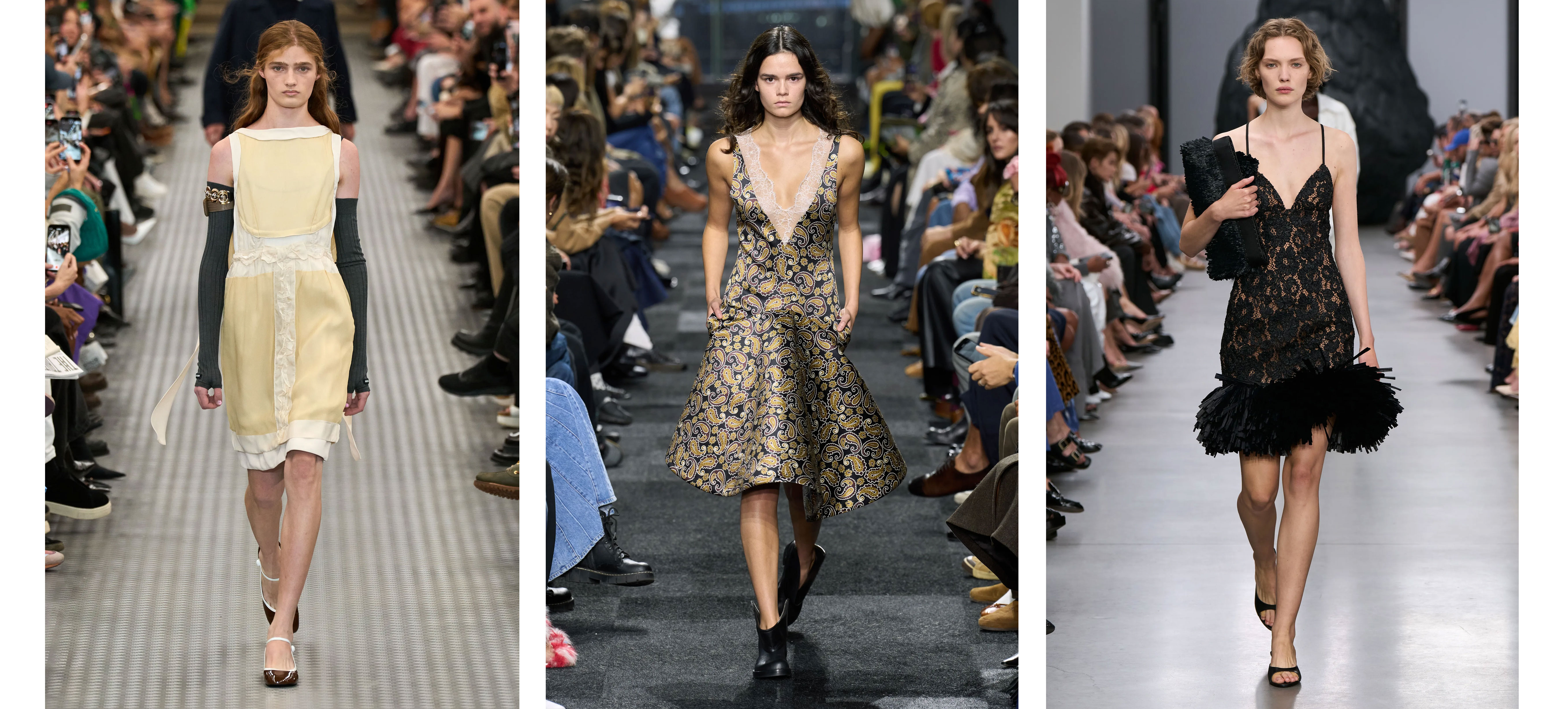 Ефектна мереживна сукня також з’явилася в Dries Van Noten, вирізняючись акцентним принтом і поєднанням із не менш ефектними блискучою сумкою та «зміїними» мюлями. Продовжує парад візуальної виразності образ Erdem — тут ніжність римується з гламурністю металіку. Що ж до Gucci, то Дім пропонує напівпрозору чорну мереживну сукню, скомбіновану з червоною лакованою сумкою й чоботами-лоферами.