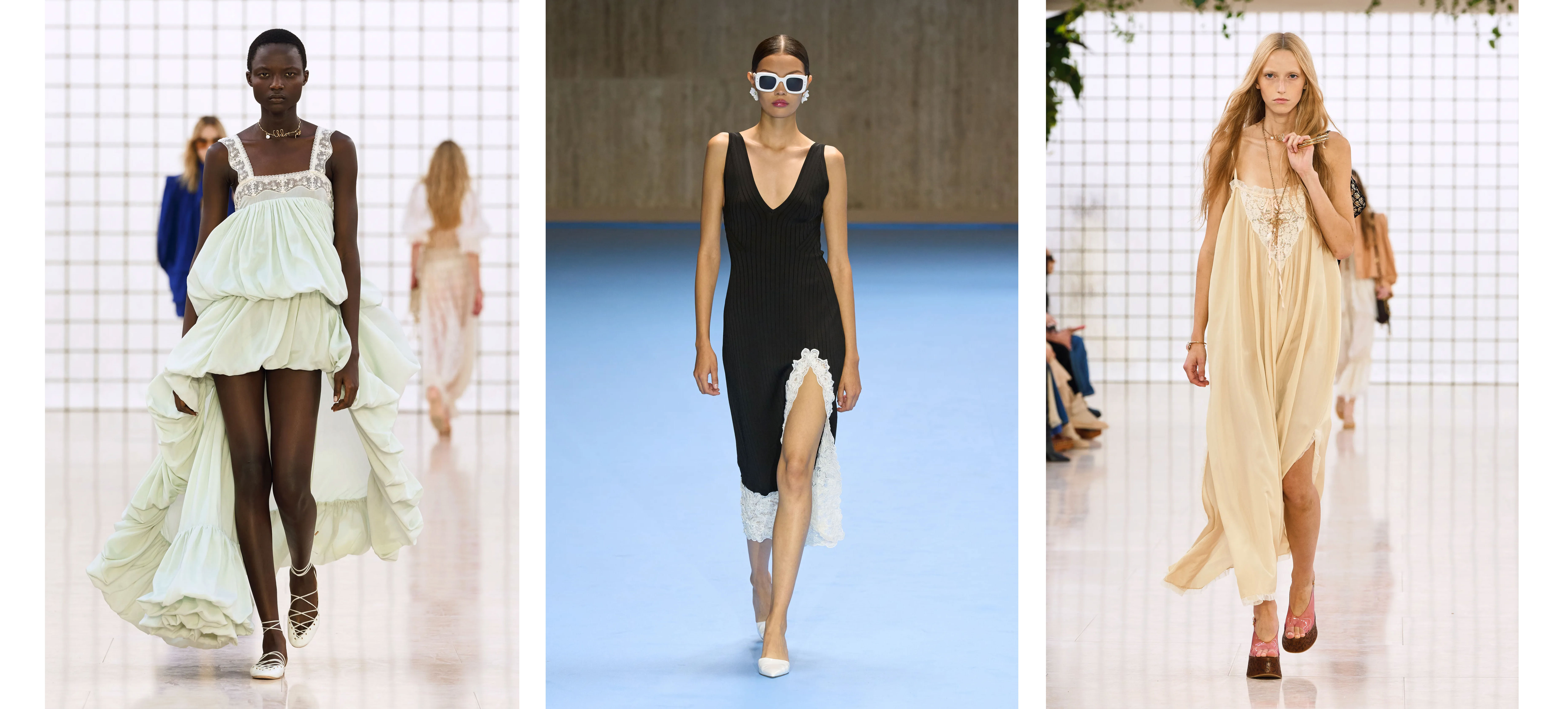 У Carolina Herrera, які зверталися до мінімалістичної чорно-білої теми, мереживна сукня характеризувалася невимушеною спокусливістю з високим розрізом на нозі. В захоплених волелюбною жіночністю Chloé у вбраннях стилю бохо-шик ставка була зроблена на легкість та струмливий ефект, і які, здавалося, були створені саме для променадів під легким вітром.