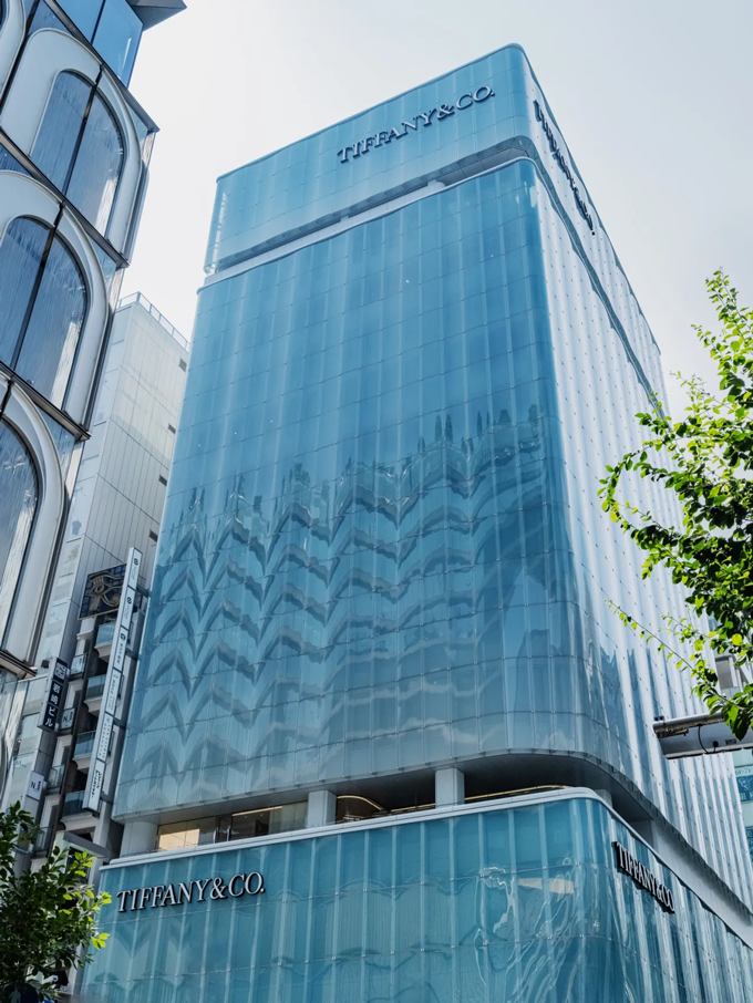 Архітектор Дзюн Аокі прагнув привнести до міського ландшафту елемент природи, створивши скляні панелі, що нагадують гілки квітучої гліцинії, які колишуться на вітру. Аби досягти знакового кольору Tiffany & Co. без зміни освітлення всередині, скло вкрили дрібними білими крапками, поверх яких нанесли сині. Незважаючи на те, що компанія не є власником будівлі, фасад також доповнює логотип Tiffany.