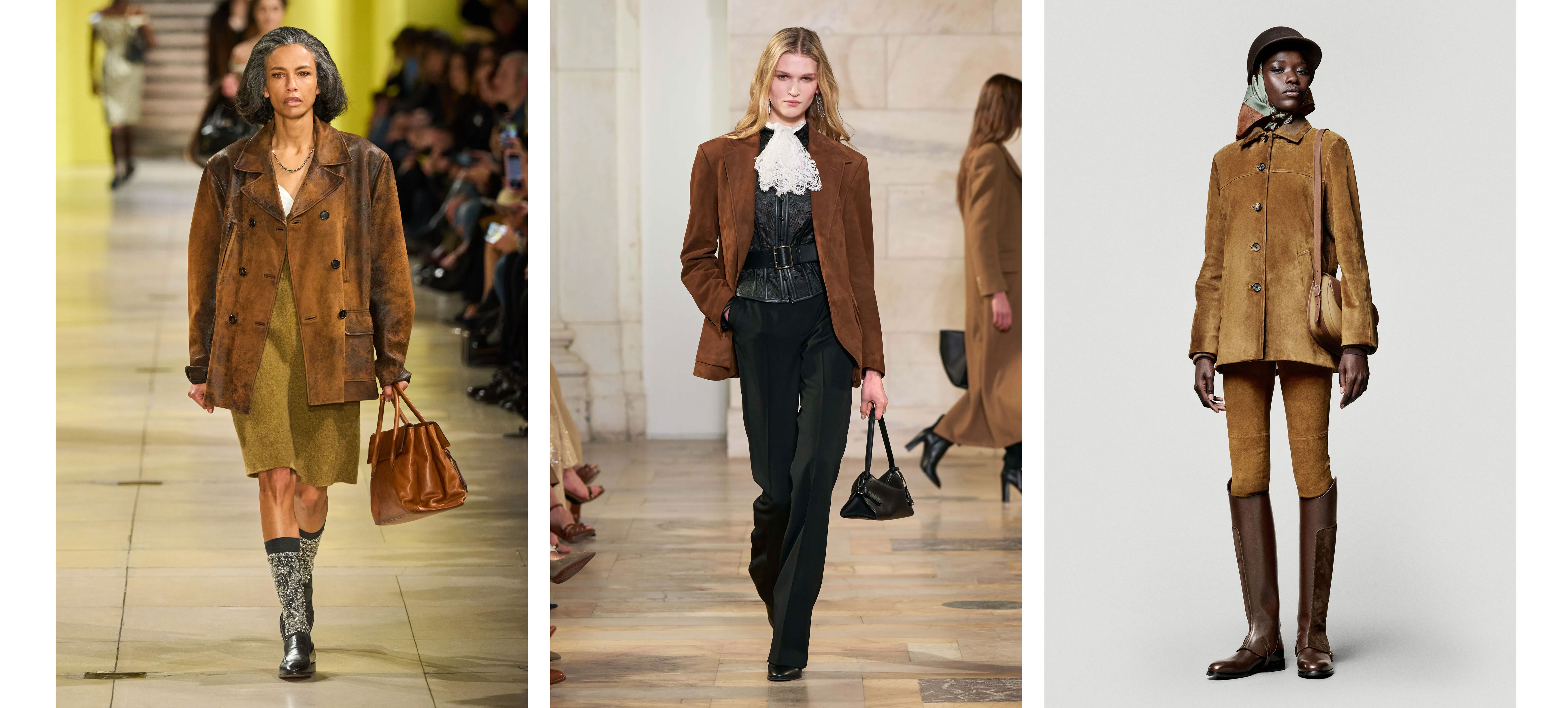 Не менш трендовим елементом гардеробу цього осіннього сезону стане замшева куртка. Найкраще матеріал поєднується з простими прямими силуетами, наприклад, робочою курткою з комірцем. Такий фасон на своїх подіумах у сезоні fall-winter — 2025 представляли Loro Paina, Ralph Lauren та інші модні Дома.