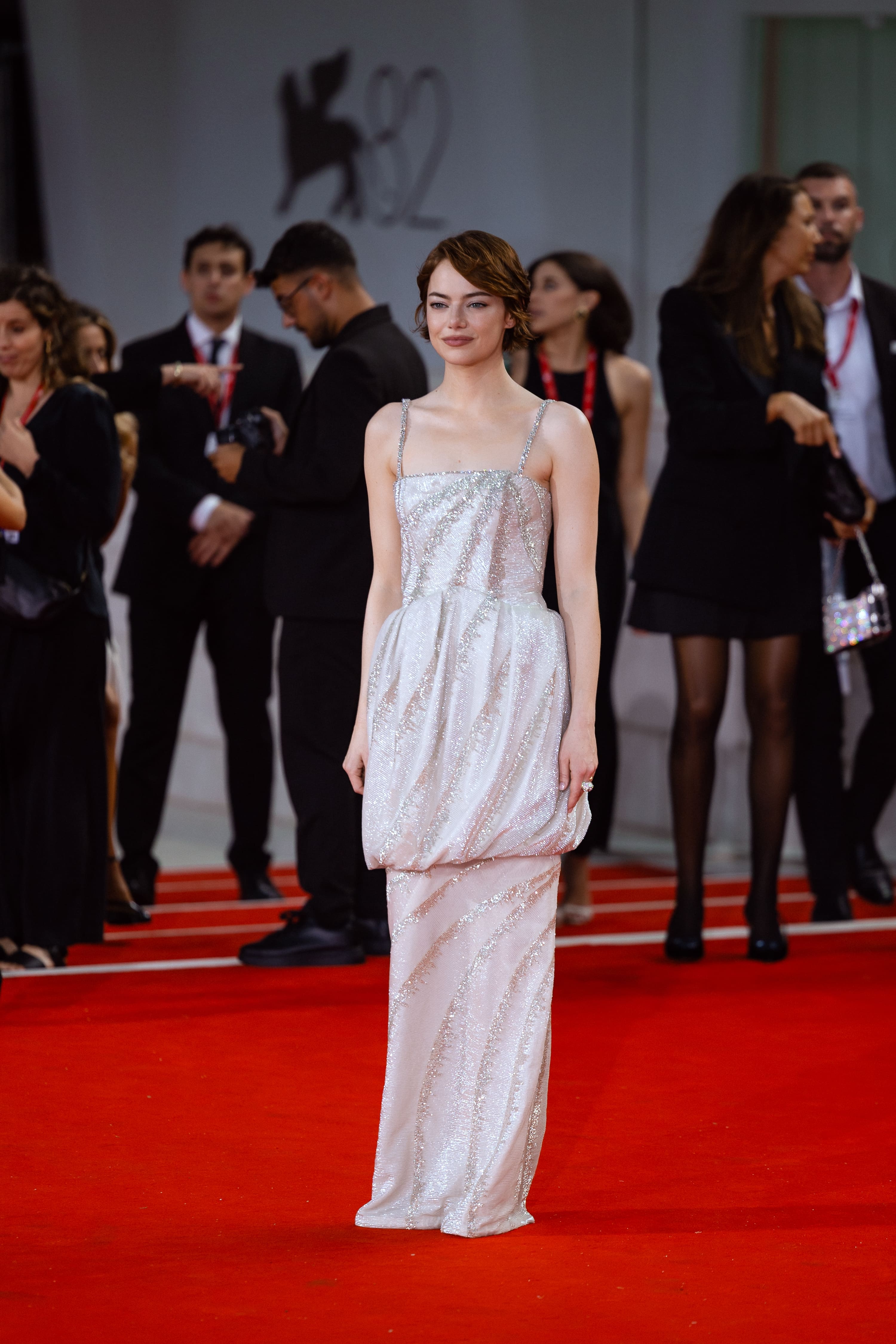 На прем'єрі «Бугонії» Емма Стоун ще раз підтвердила статус однієї з найстильніших акторок сучасності. Вона з'явилася у білій сукні максі від Louis Vuitton, розшитої срібним бісером. Ніжні бретельки, прикрашені камінням, та акцентна вставка, що нагадувала міні спідницю фасону «тюльпан», надали образу футуристичної вишуканості.