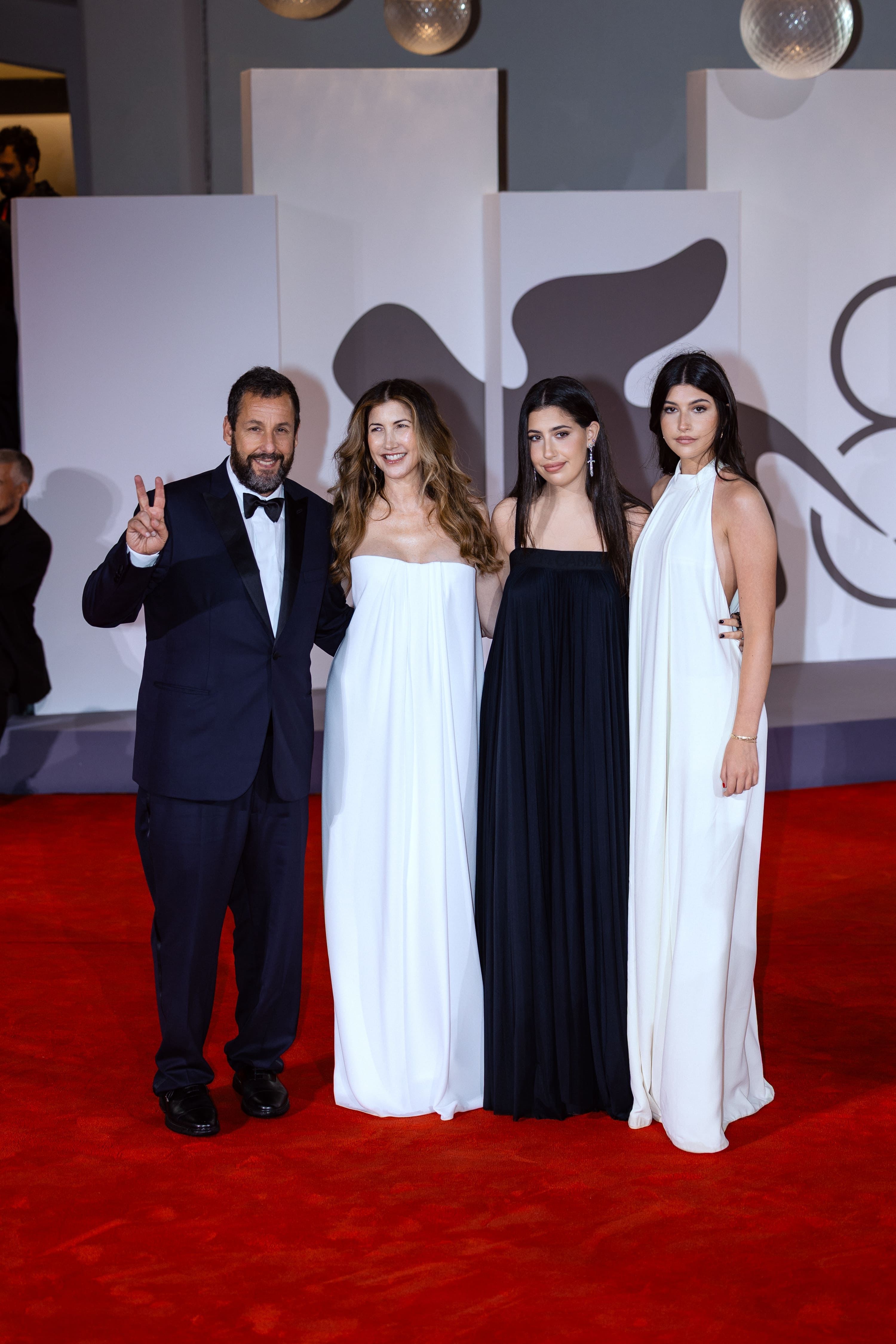 Адам Сендлер вийшов на тротуар із дружиною та двома доньками. Сам актор вібрав чорний смокінг із метеликом, а згодом з'явився у синьому костюмі. Його дружина вібрала молочно-біле максі плаття без бретелек.