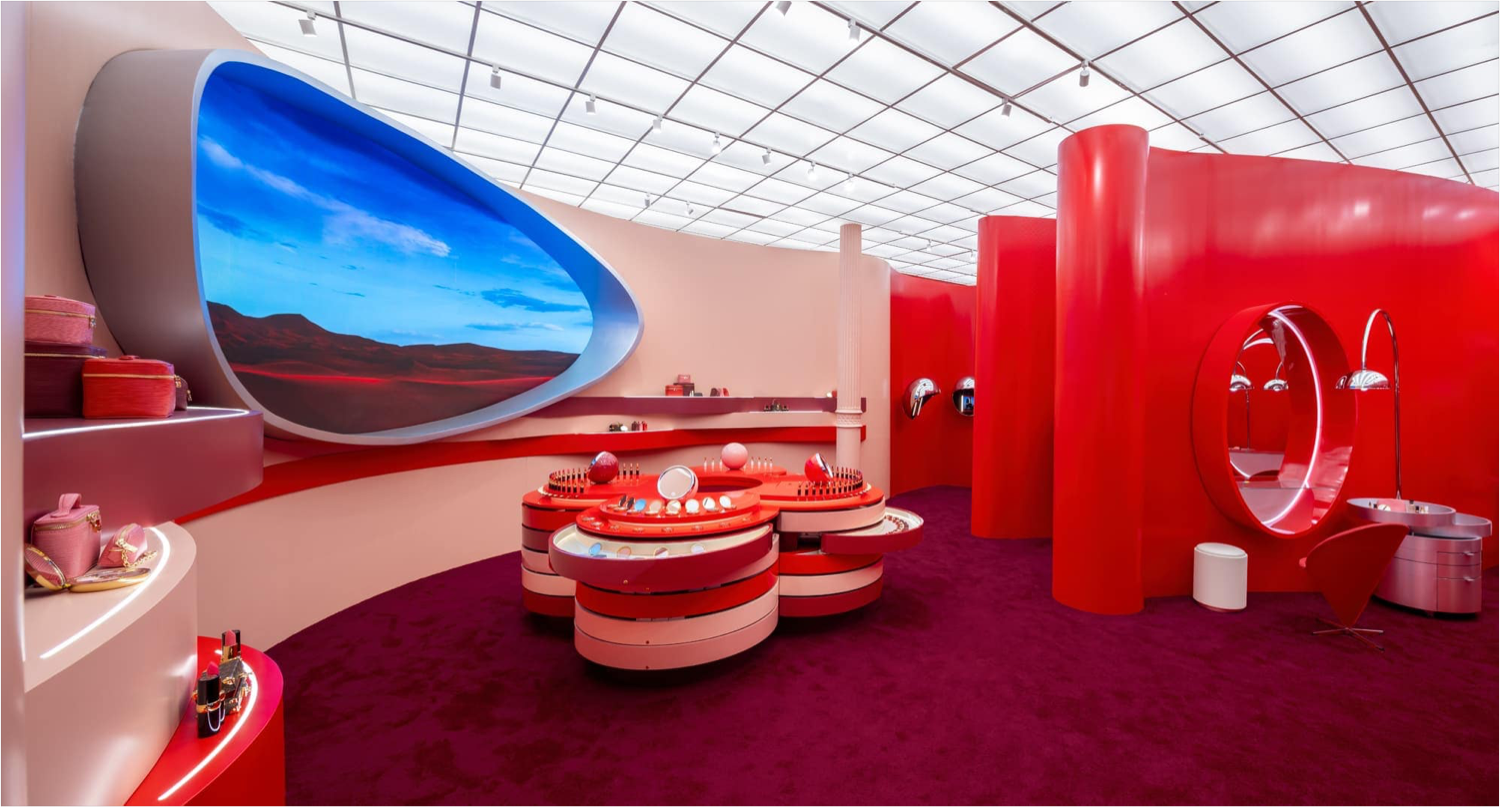 Інтер’єр поп-апу нагадує занурення у новий всесвіт Louis Vuitton. Насичені червоні відтінки, хвилясті полиці, дзеркальні сфери та органічні форми створюють атмосферу, в якій кожен елемент відображає дух колекції. Вхід оформлено у вигляді порталу з 48 цифрових екранів, що миттєво переносять гостей у світ La Beauté.