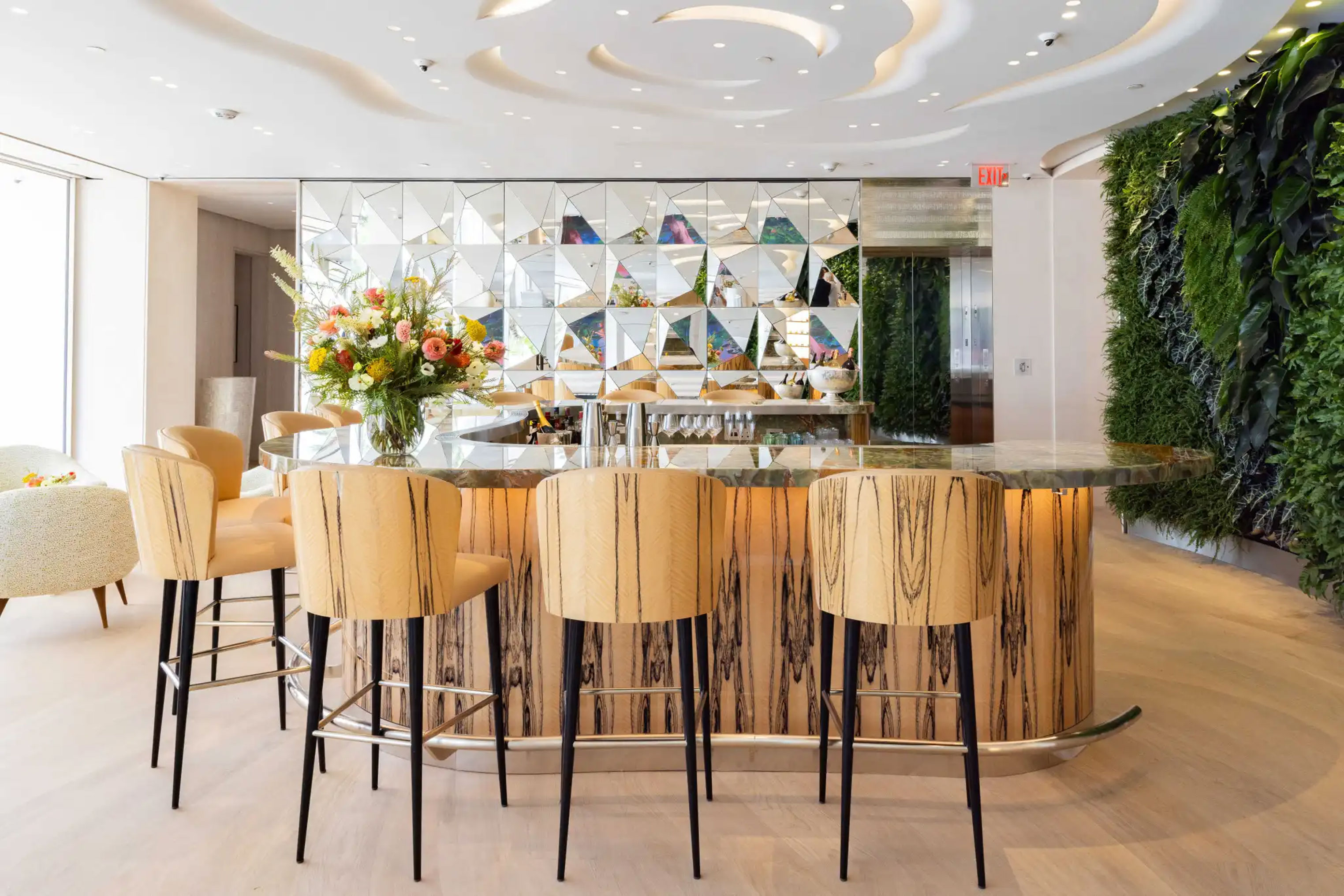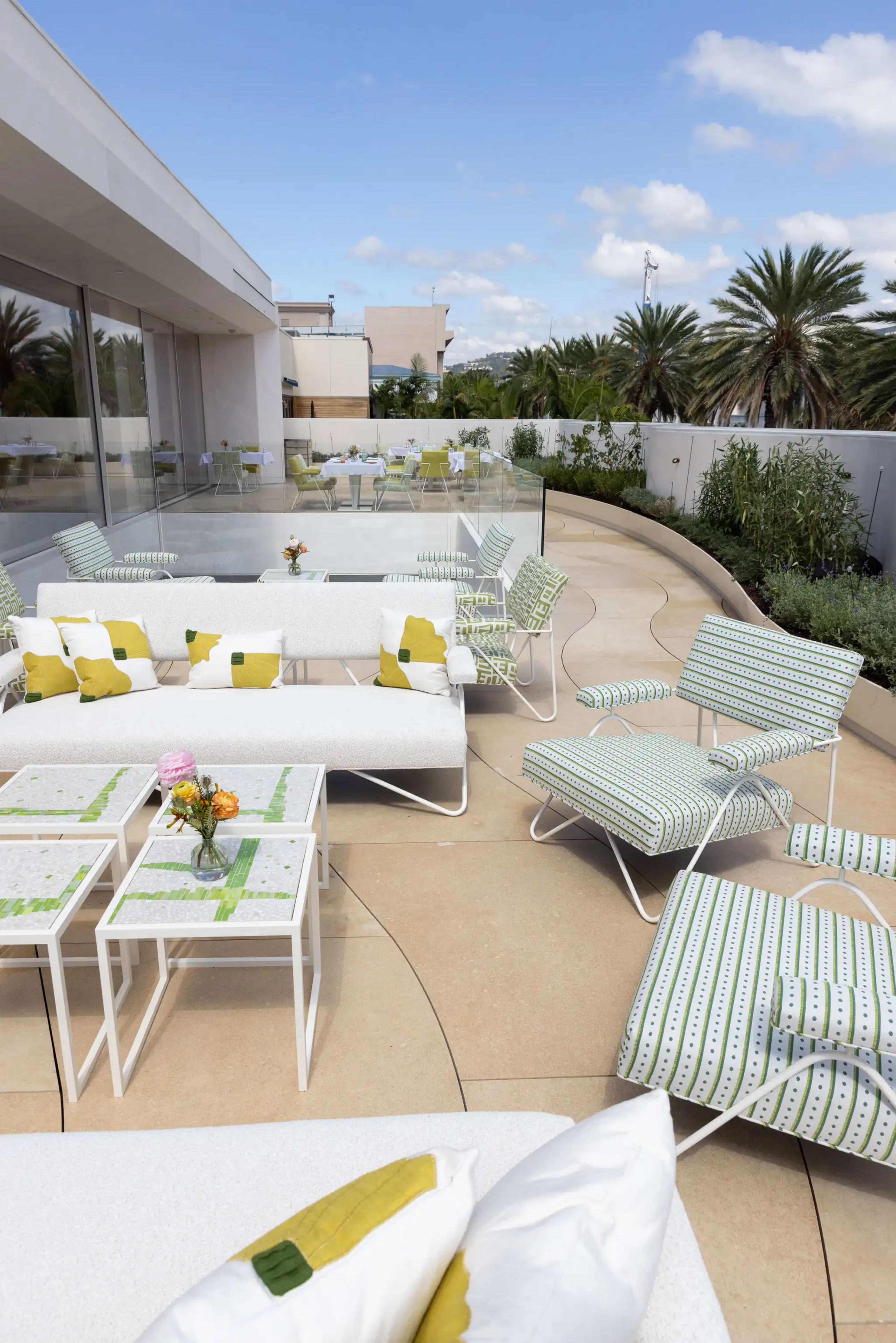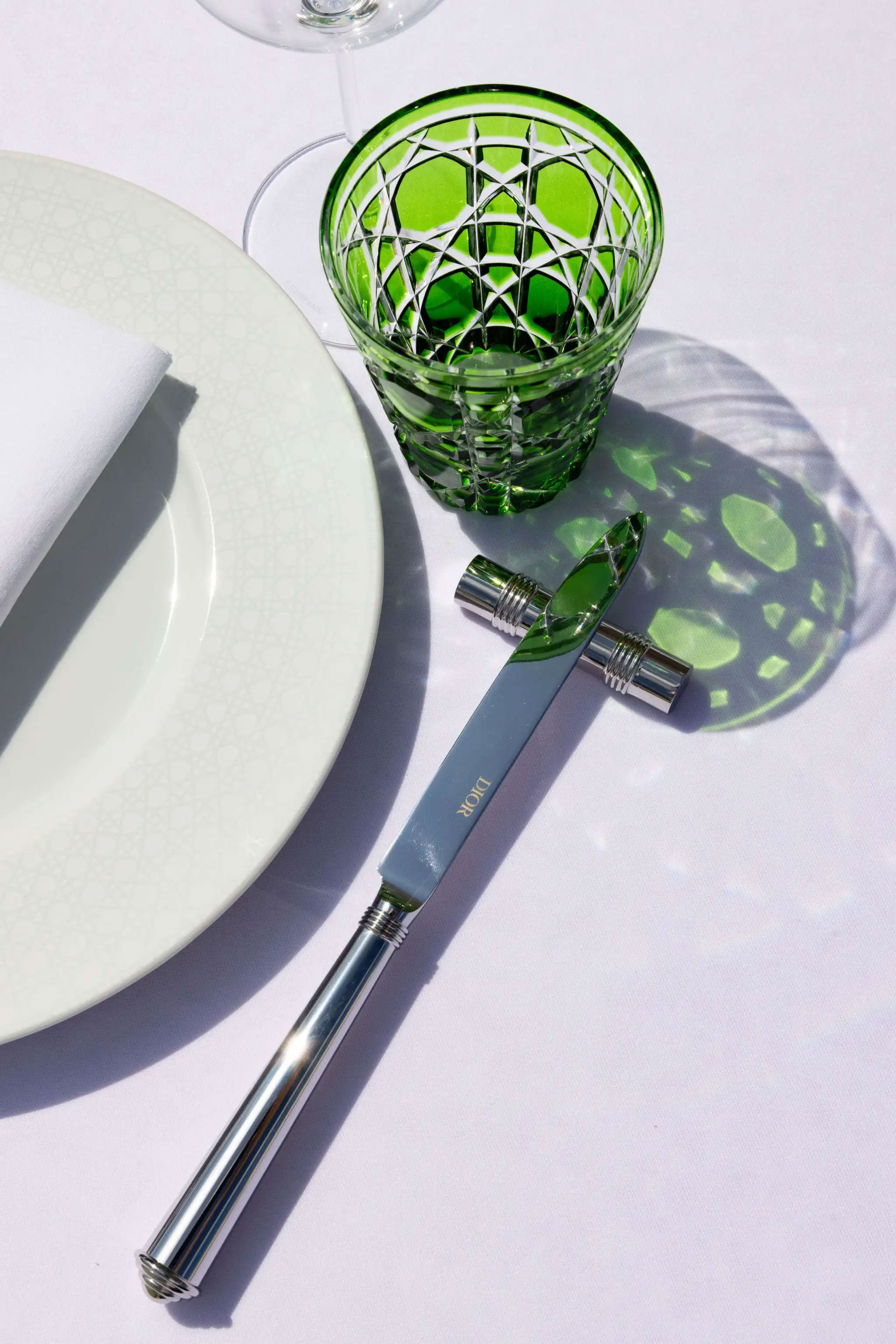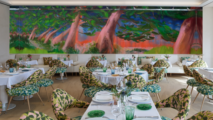 Інтер’єр вирізняється світлом і простором: панорамні вікна, мансардне освітлення та спеціальні колекції предметів для сервірування Dior, серед яких скло в абрикосовому відтінку з візерунками Cannage, Chevron і Stripes.