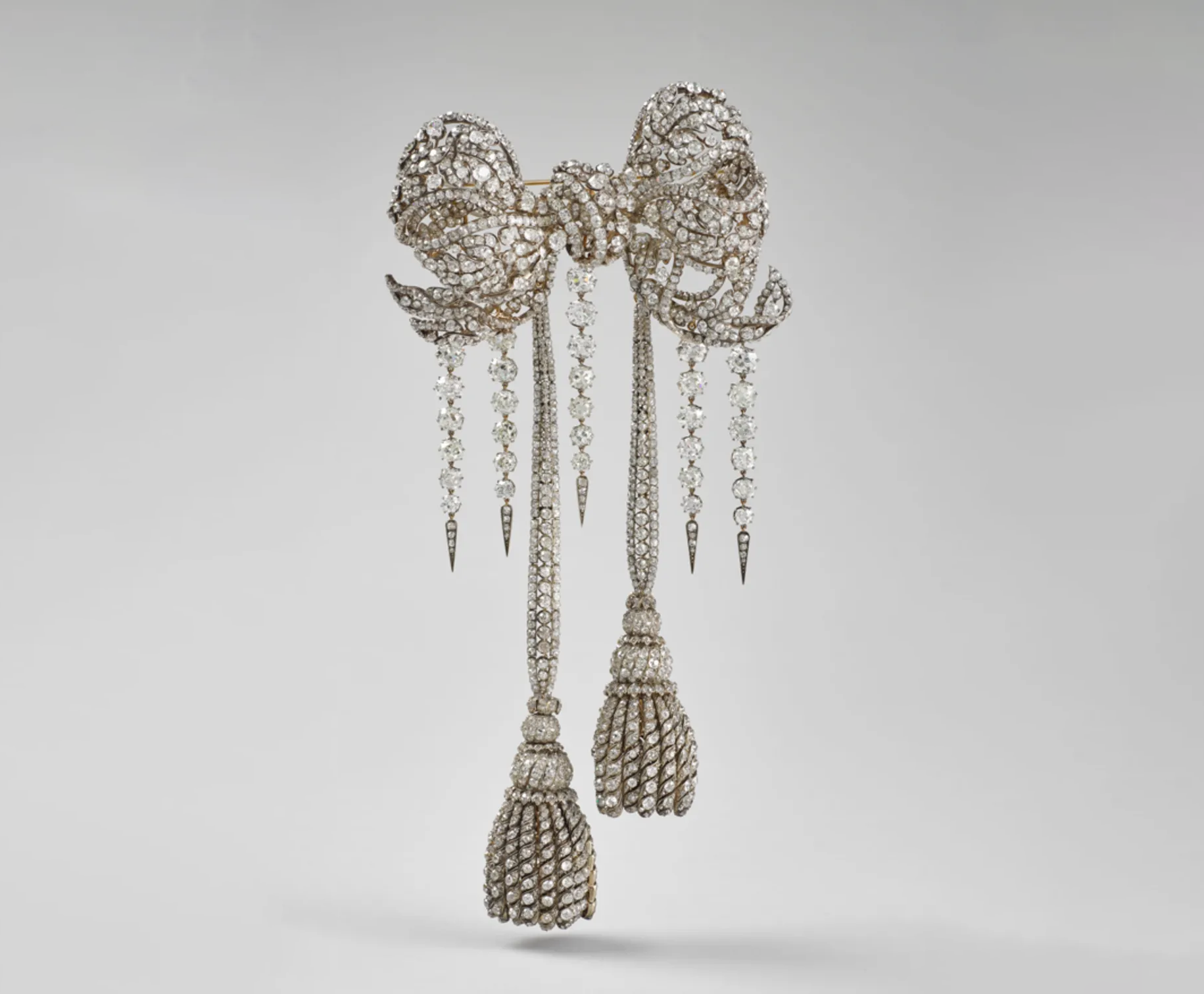 Брошка-бантик із срібла, золота та діамантів спочатку служила пряжкою до пишного діамантового поясу, що складався з приблизно 4000 каменів і був експонований на Всесвітній виставці 1855 року.  За свідченнями, саме цей пояс, виготовлений ювеліром Франсуа Крамер, імператриця Євгенія вдягла під час візиту королеви Вікторія до Версальського палацу в серпні 1855 року, а також у червні 1856 року — на церемонію хрещення принца Імперського. Згодом пояс був трансформований у брошку та доповнений діамантовими кистями – такий дизайн прикраси обрала сама імператриця.