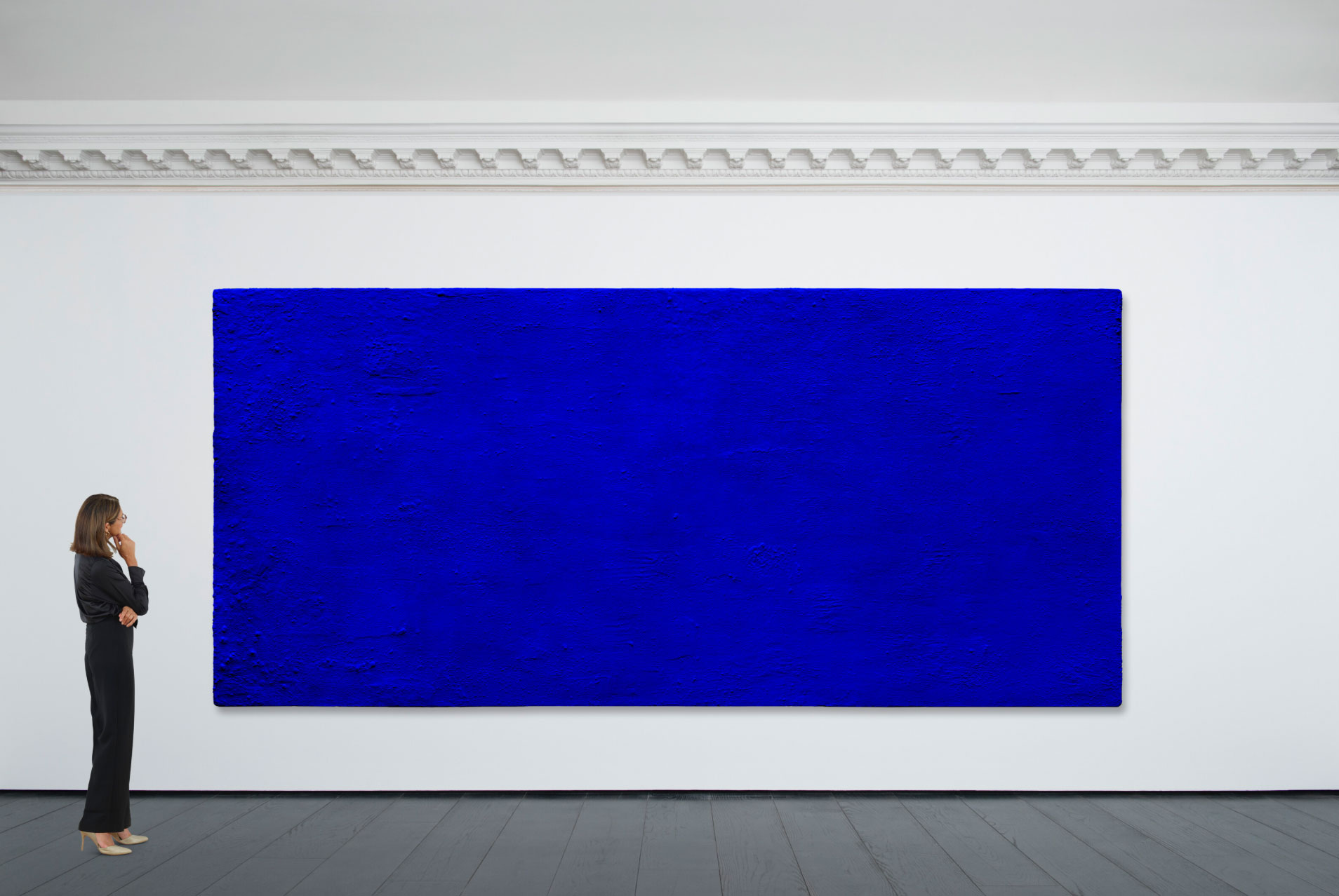 Монохромна картина заввишки два метри та завширшки понад чотири — це чиста синя стихія, написана у фірмовому відтінку художника International Klein Blue. Кляйн створив цей колір у співпраці з хіміками в середині 1950-х, прагнучи досягти максимальної насиченості пігменту, який здавався б живим. Саме цей відтінок став його підписом і його філософією.