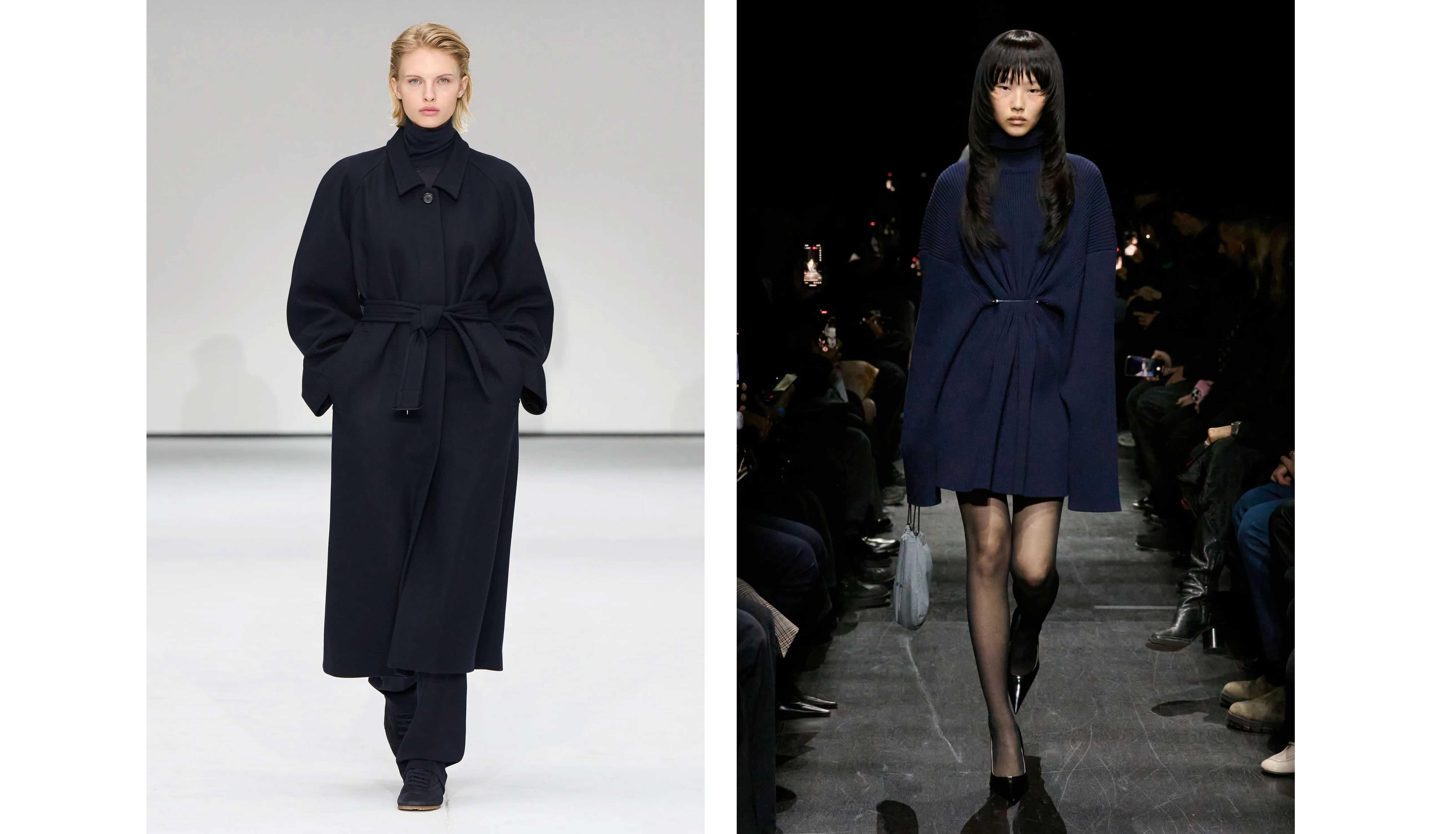 Темно-синій, який ще називають військово-синім, зустрічався в колекціях fall-winter — 2025-26 ледь не найчастіше. Домінував відтінок у категорії верхнього одягу — від пальт до дутих курток —, але зустрічався й у класичних комбінаціях, таких як трикотаж чи костюми.