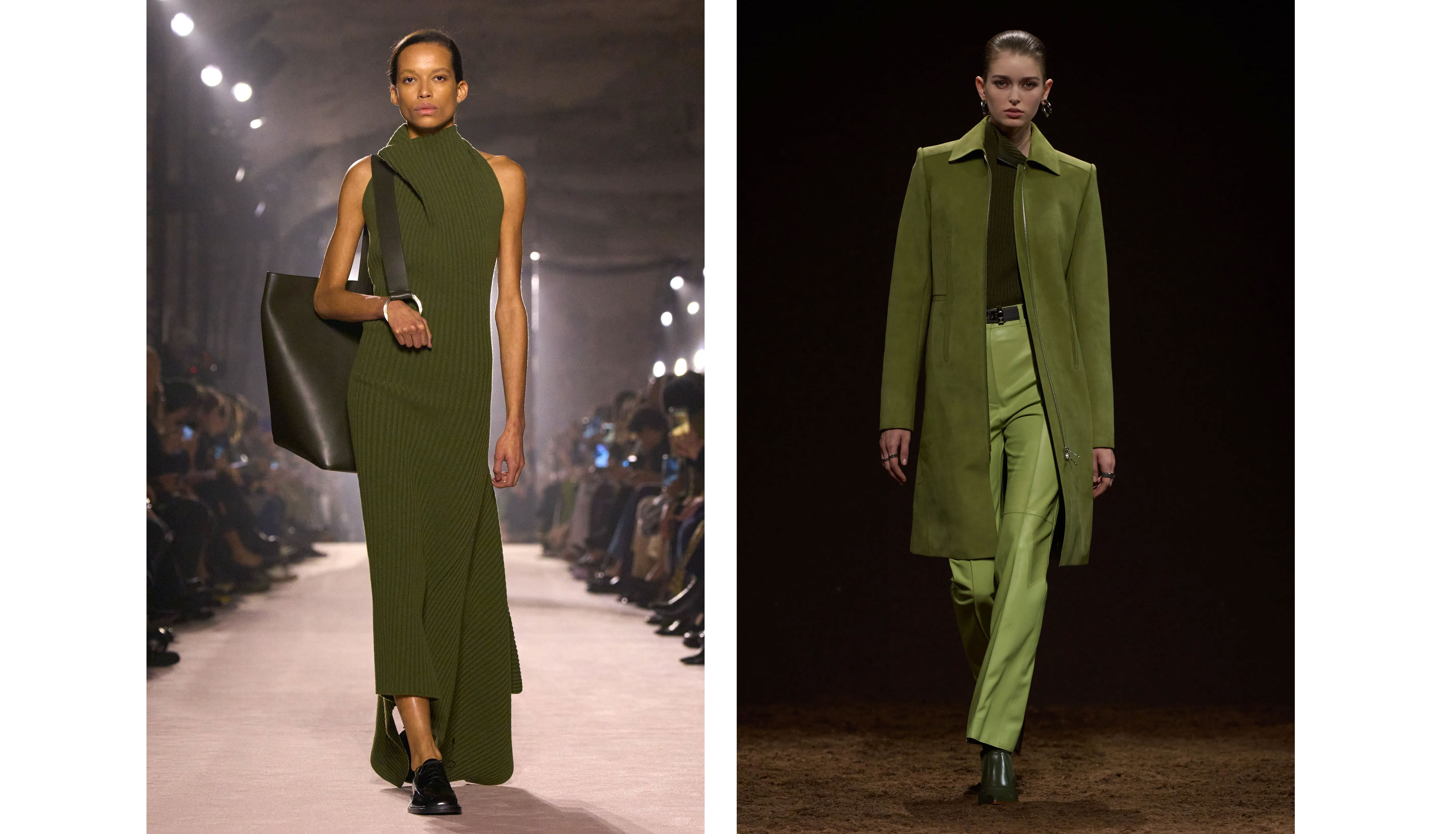 Якщо зелений і заспокоює, то завдяки оновленню гардеробу новими кольорами. В сезоні winter — 2025 найтрендовішим його відтінком є трав’янистий, проте інші, такі як лаймовий, фісташковий чи оливковий, теж зустрічалися на подіумах. Для референсів найсміливішим модницям — верхній одяг та шкіряні штани в відтінках зеленого в Hermes.