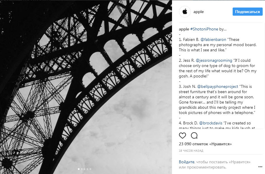 Корпорация Apple, наконец, завела аккаунт в социальной сети Instagram: самый старый пост был сделан 18 часов назад. Собственно, каждый из постов представляет собой альбом, демонстрирующий уникальные возможности камеры iPhone и сопровождаемый хештегом #ShotoniPhone. Все записи являются снимками обладателей смартфонов Apple - компания поощряет креатив в своих клиентах, - и, таким образом, каждый может быть опубликован в официальном Instagram компании. Достаточно лишь сделать качественный красивый снимок и подписать его #ShotoniPhone, а Apple будут использовать фото и видео подписчиков только с их разрешения.