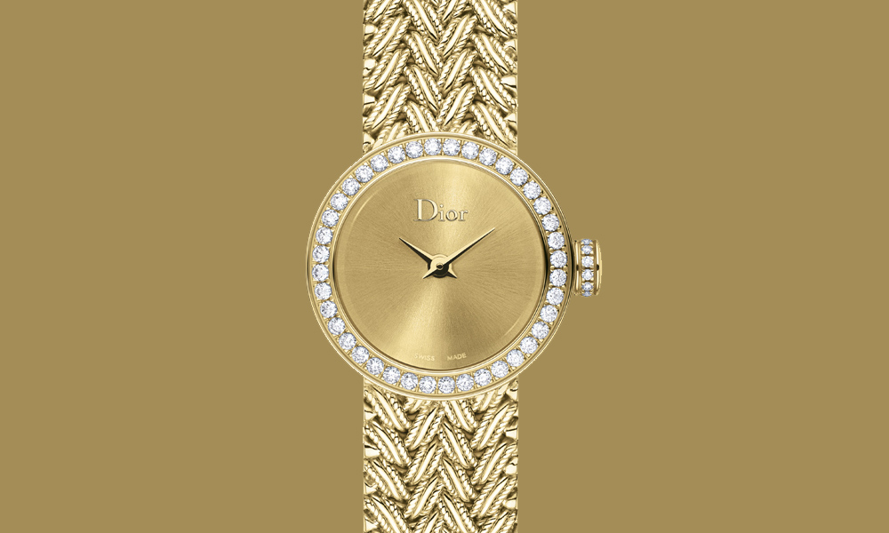 В честь 70-летнего юбилея Dior ювелирные мастера дома создали модель Dior Horlogerie - La Mini D de Dior Satine Tressée в корпусе из желтого золота с бриллиантами. Часы дополнены золотым браслетом польского плетения, имитирующим ткань букле, а золотой циферблат украшен гильоше “солнечные лучи”.