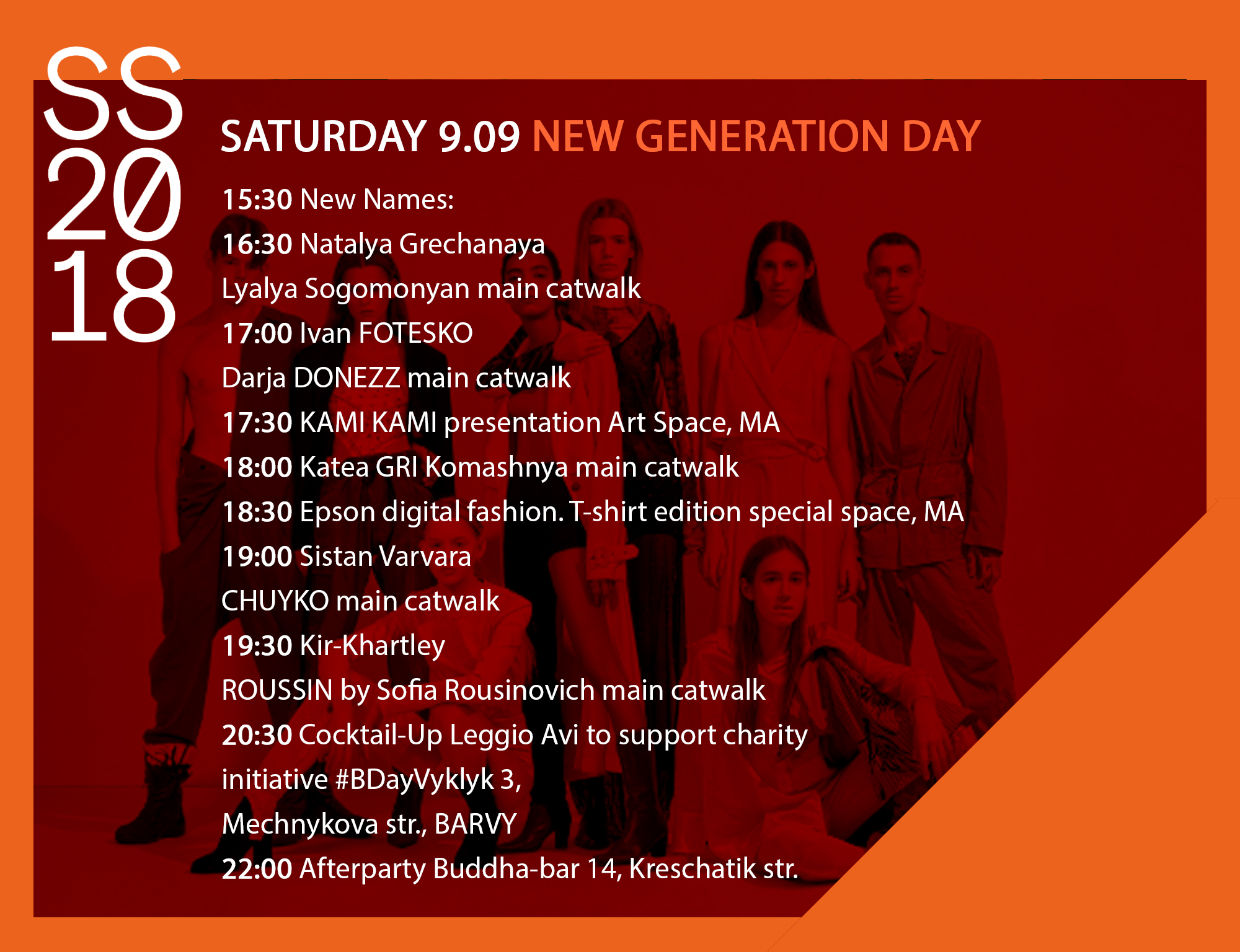 В этом году организаторы UFW объединили показы молодых дизайнеров в самостоятельную платформу New Generation Day, которая пройдет 9 сентября в Мыстецком Арсенале. Откроют день шоу 6 дизайнеров, впервые представляющих свои коллекции на большом подиуме, – New Names. Всего в этот день свои коллекции представят 16 брендов.