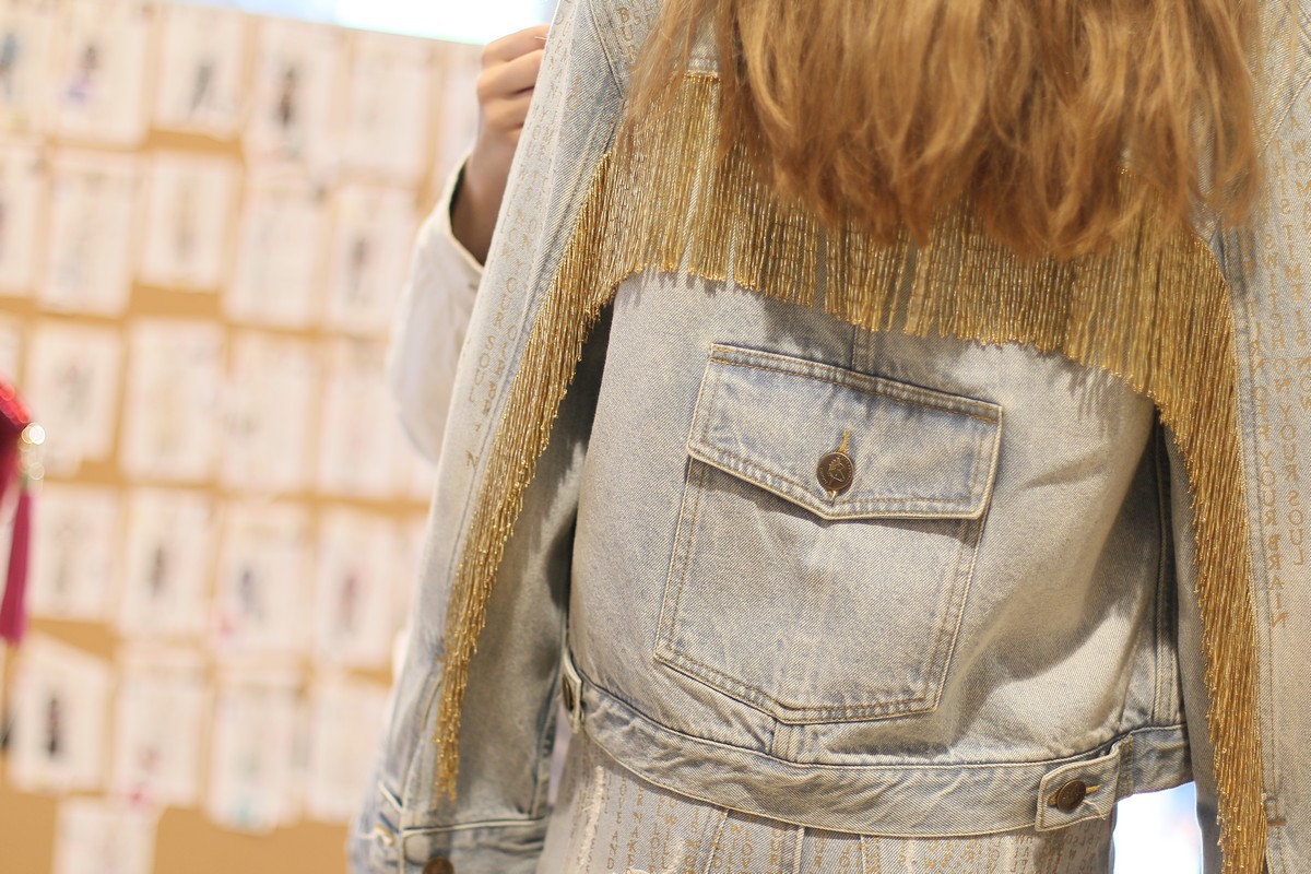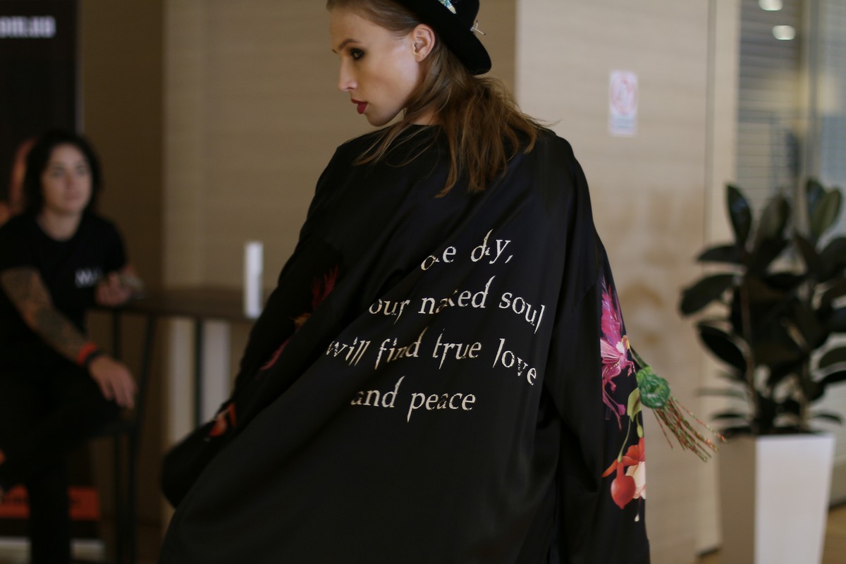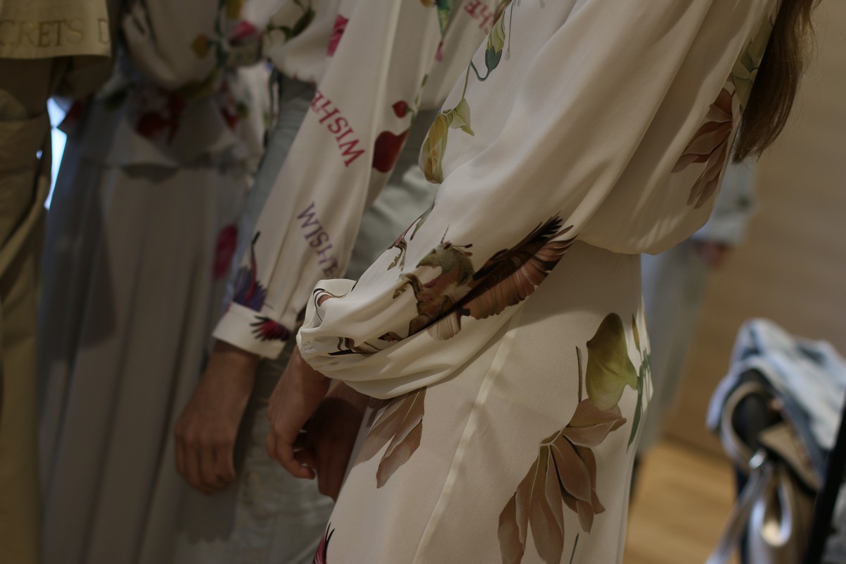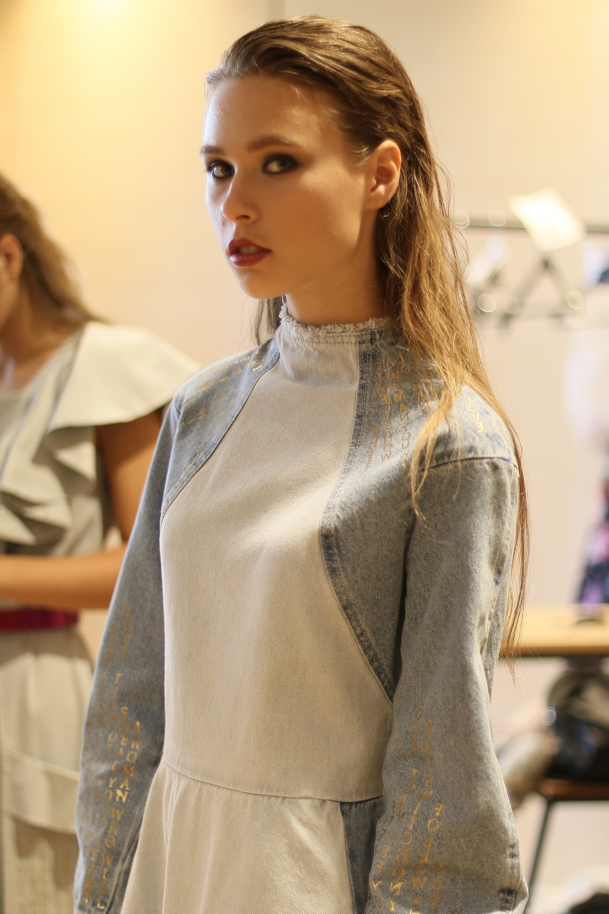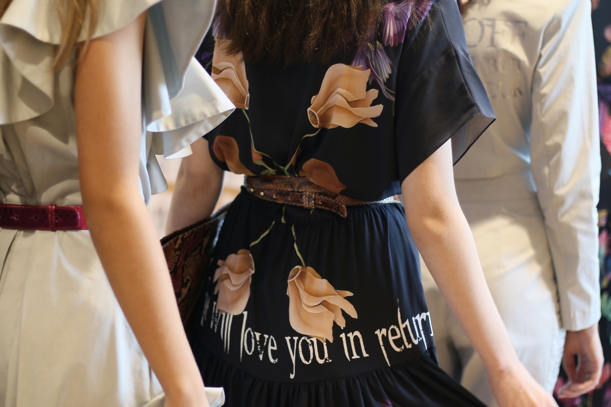 Дизайнер создала разные вариации платьев: от свободного кроя со струящейся тканью до строгих архитектурных силуэтов, которые словно рисовали фигуру. Также в коллекцию вошли костюмы из денима и трикотажа, которые были обрамлены золотой тесьмой. На некоторых образах мы могли наблюдать вышивку бисером. Отдельно стоит отметить флористические принты, а также четверостишие на некоторых платьях, которые дизайнер придумала сама: One day your naked heart will find true love and peace, and glory will return