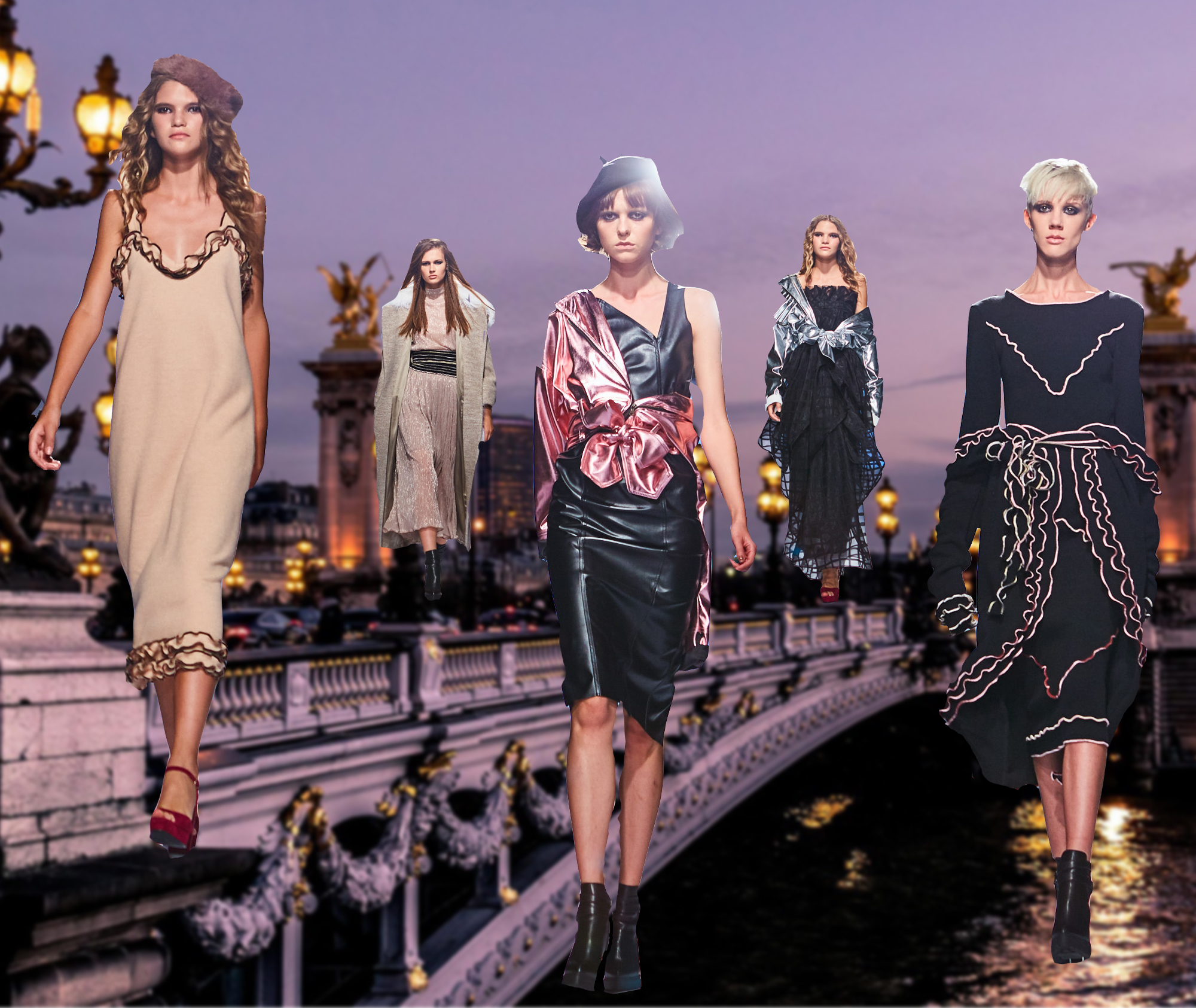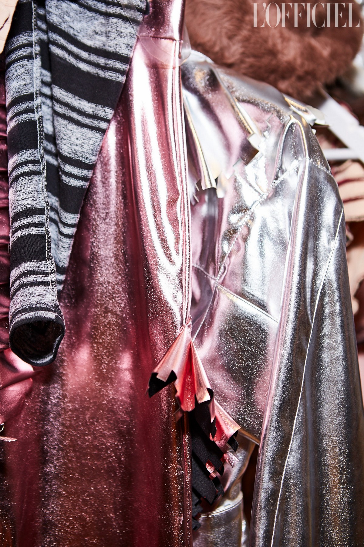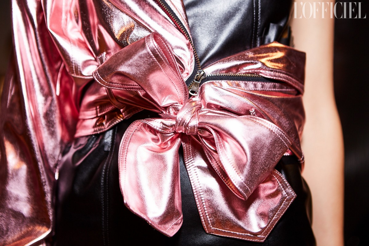 В коллекции собраны разнообразные ткани: мягкий трикотаж с фактурной отделкой, воздушная органза с люрексом, глянцевая экокожа, тафта и джерси. Цветовая палитра тоже многообразна: от всевозможных оттенков розового, бежевого и серого до глубокого винного, теплого кофейного и оливкового.