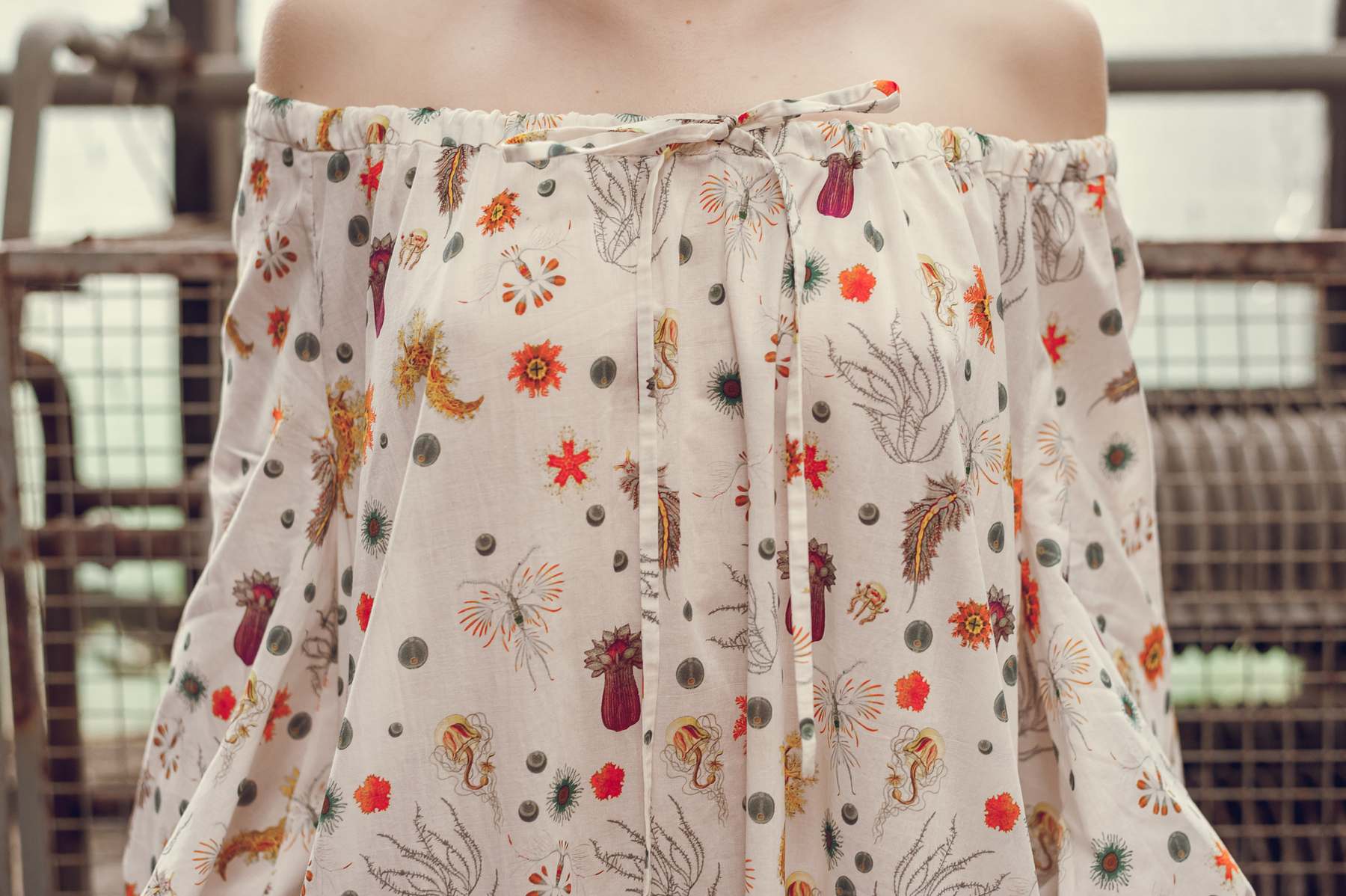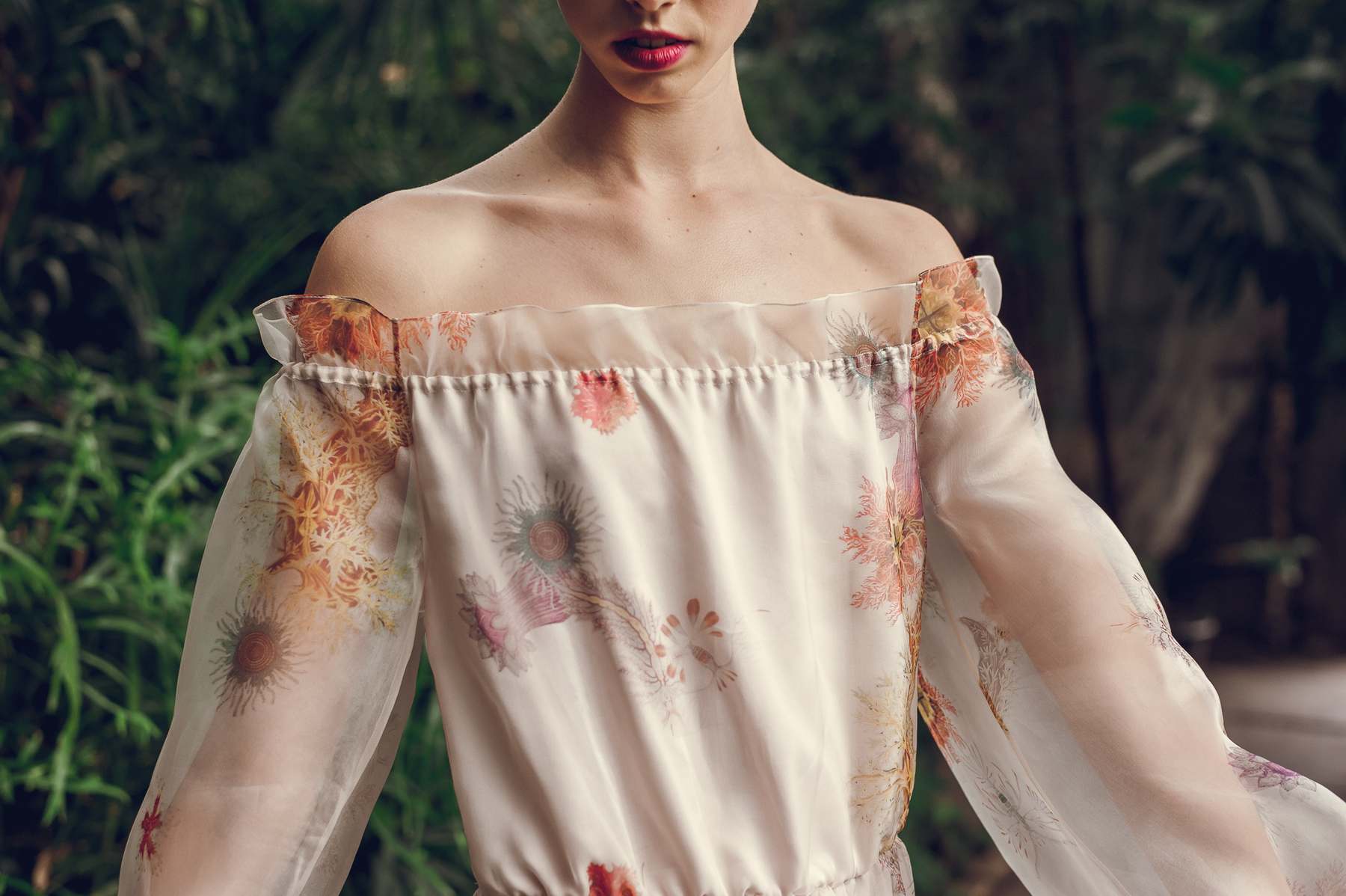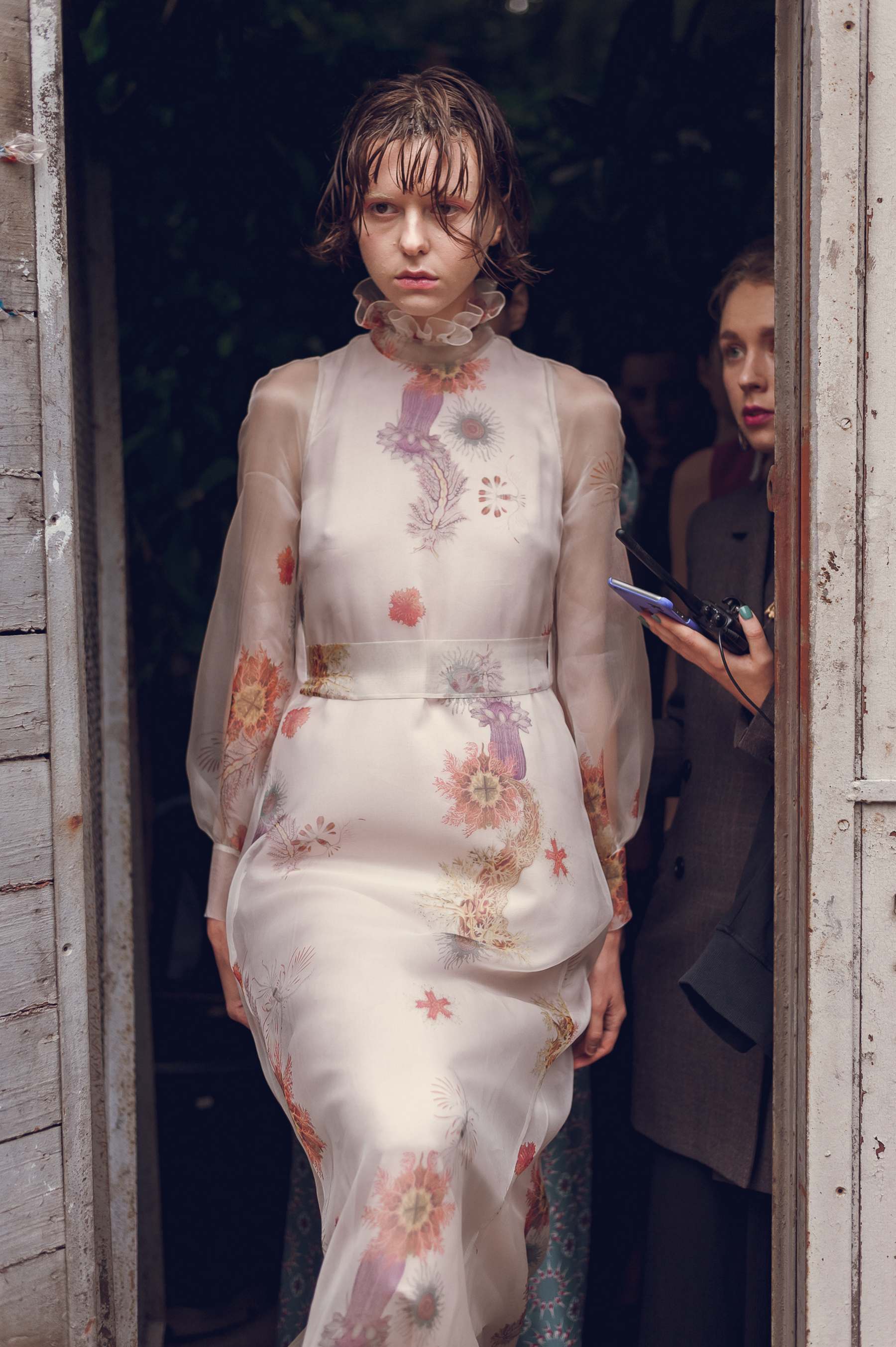 Море в коллекции было заметно в каждом выходе: в мягких переливах шелка и волнующихся драпировках органзы, в палитре – от нежно-розовых оттенков пены до всех вариаций цвета морской волны, разумеется, в принтах, повторявших очертания кораллов, водорослей и подводных растений. Ступали современные русалочки вовсе не по ножам: на их ногах красовались мюли с оборками, продолжая эстетику аксессуарной линии Lake Studio. Sirens вышла очень торжественной и нарядной: недаром дизайнеры уделили такое внимание деми-кутюрной линии, еще больше усложнив ручную вышивку, которой славится бренд, и добавив сложные приемы – например, печать на органзе – и изысканные материалы вроде шелка кади и органзы. Впервые в коллекции ready-to-wear появляется кружево, как нельзя более логичное и актуальное в подобной «морской» истории.