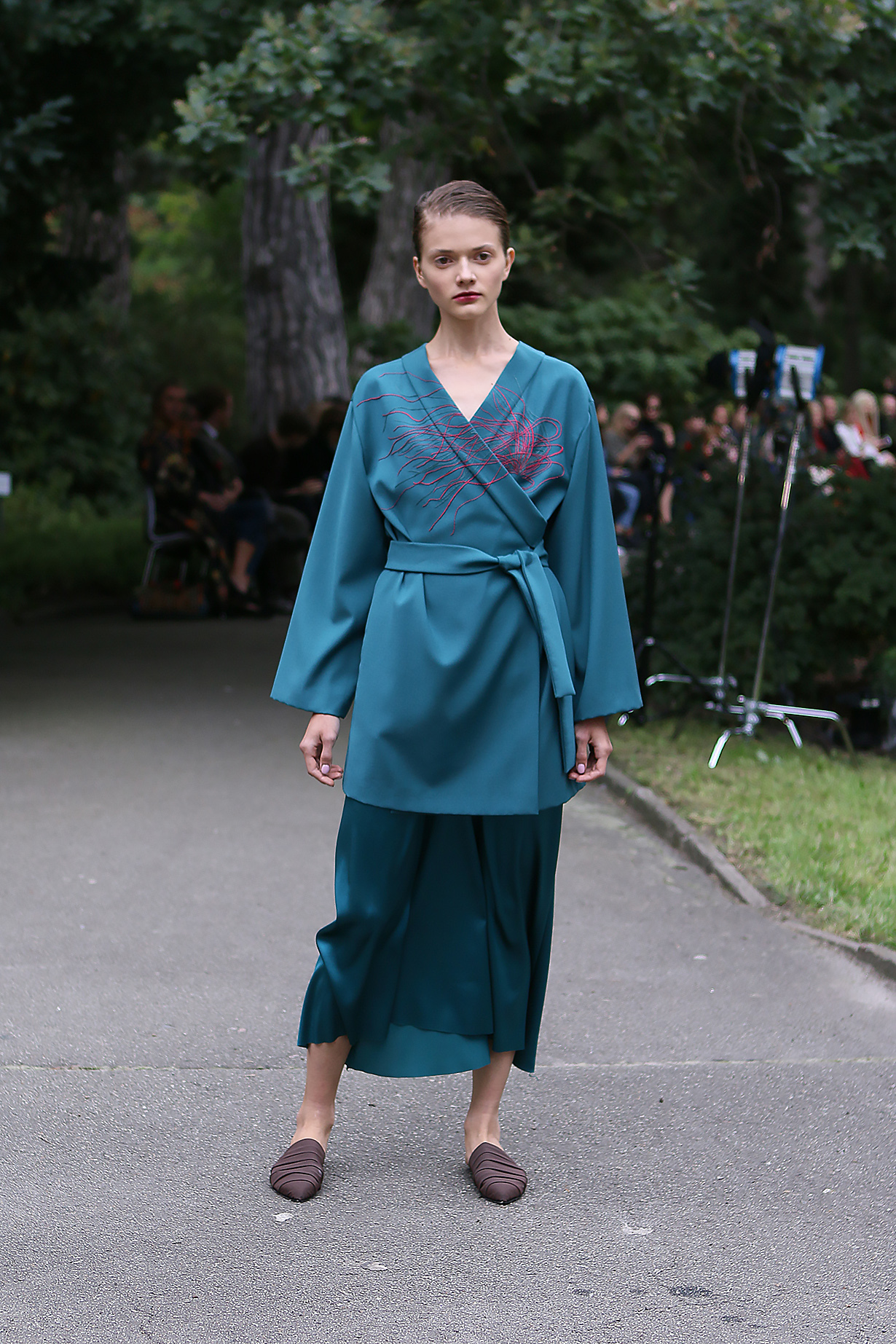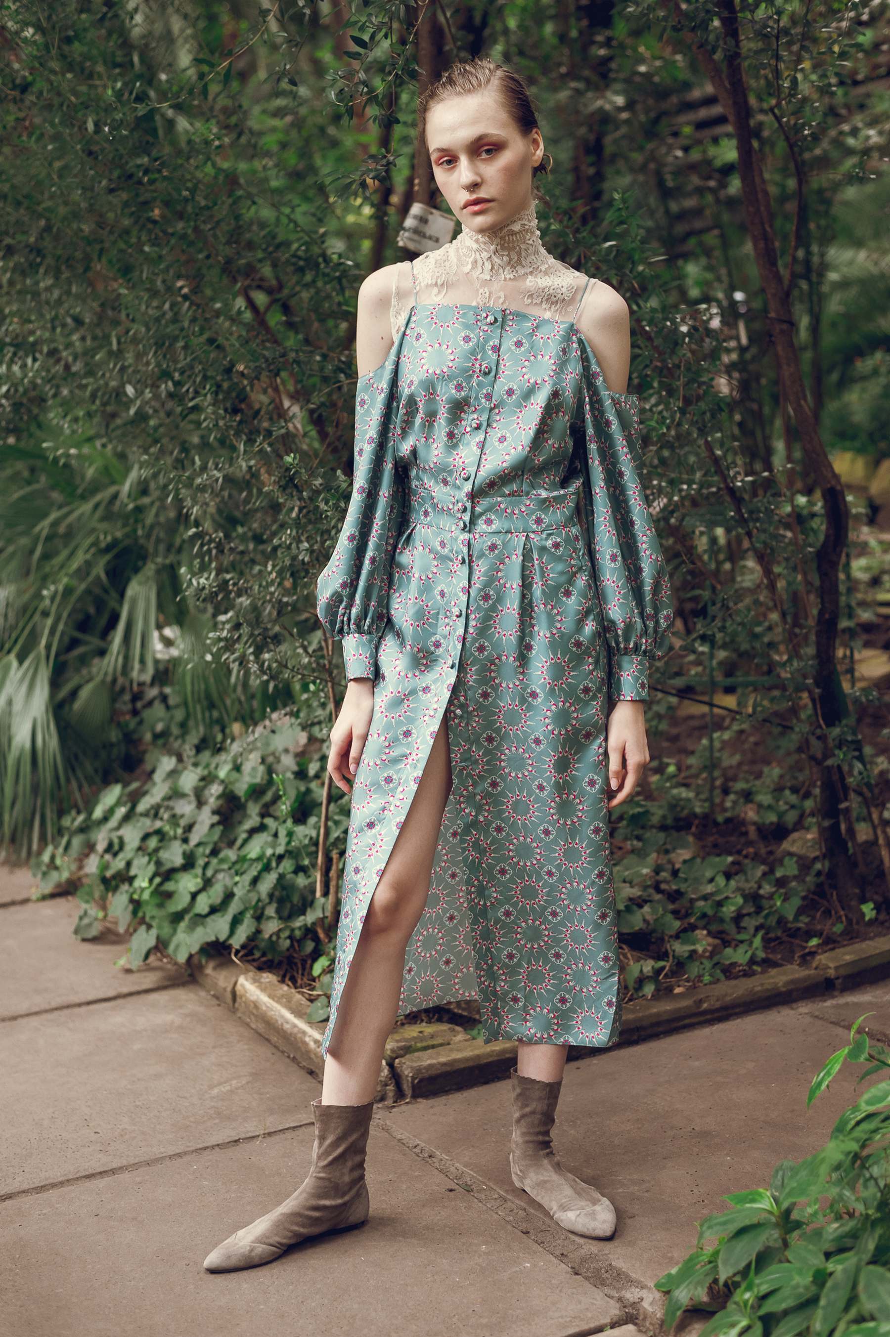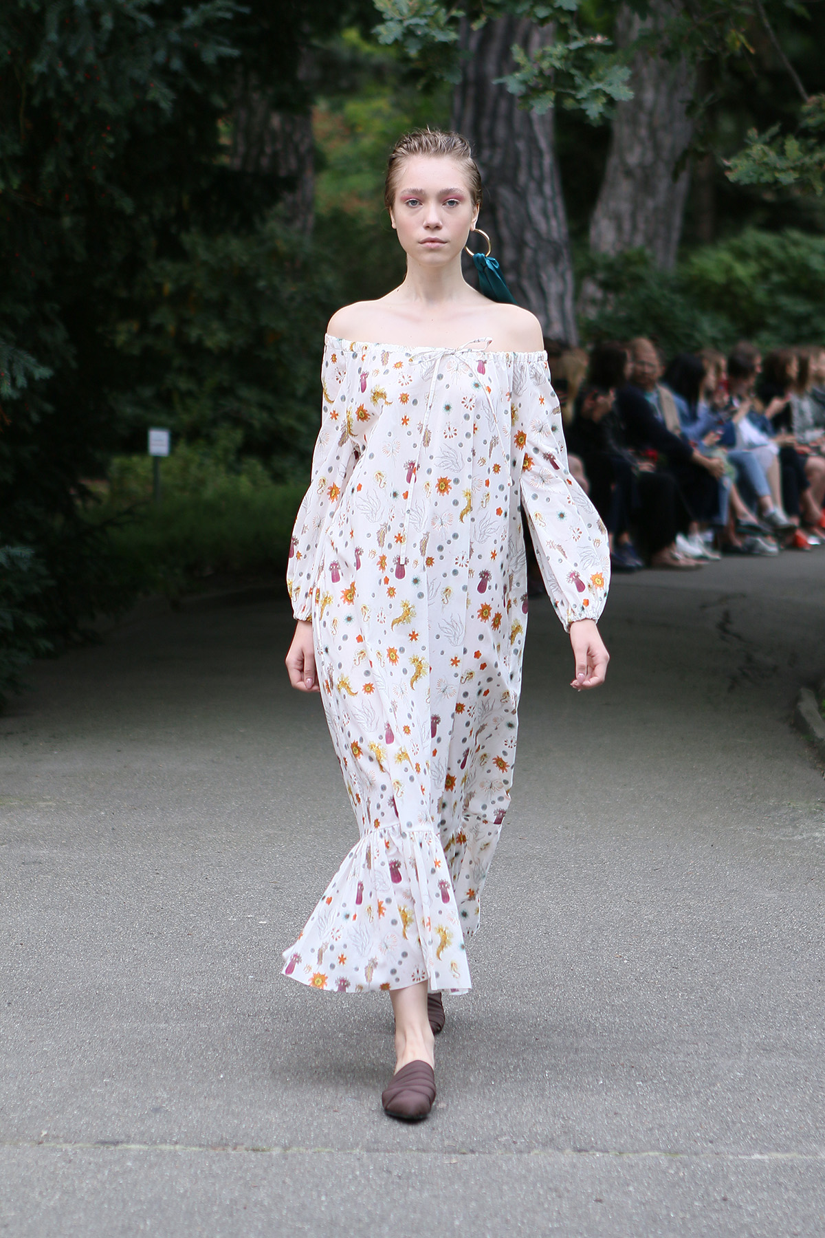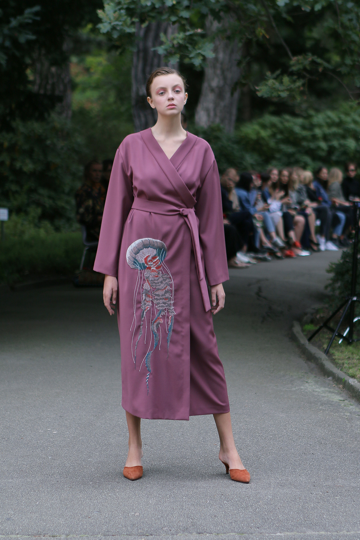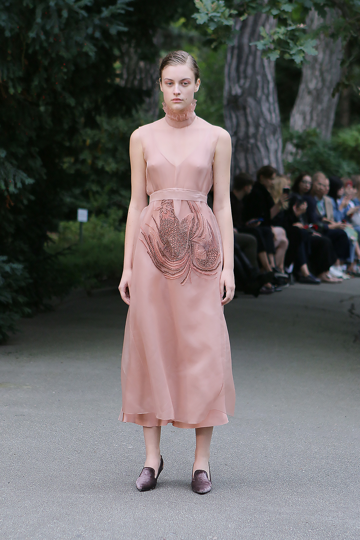 Показ проходил в научной части Ботанического сада имени Фомина; креативной команде бренда очень хотелось организовать шоу на открытом воздухе, и их не напугала даже потенциальная возможность дождя. Риск оказался совершенно оправдан: модели переодевались в оранжереях, а гости рассаживались вдоль дорожек, предварительно получив шанс прогуляться по тропинкам мимо уникальных растений удивительной красоты. Сопровождала показ живая музыка в исполнении группы New Brain Trio, которая довершала и без того волшебную атмосферу, – эти звуки, подобно тому самому пению сирен, очаровывали, манили и завораживали.