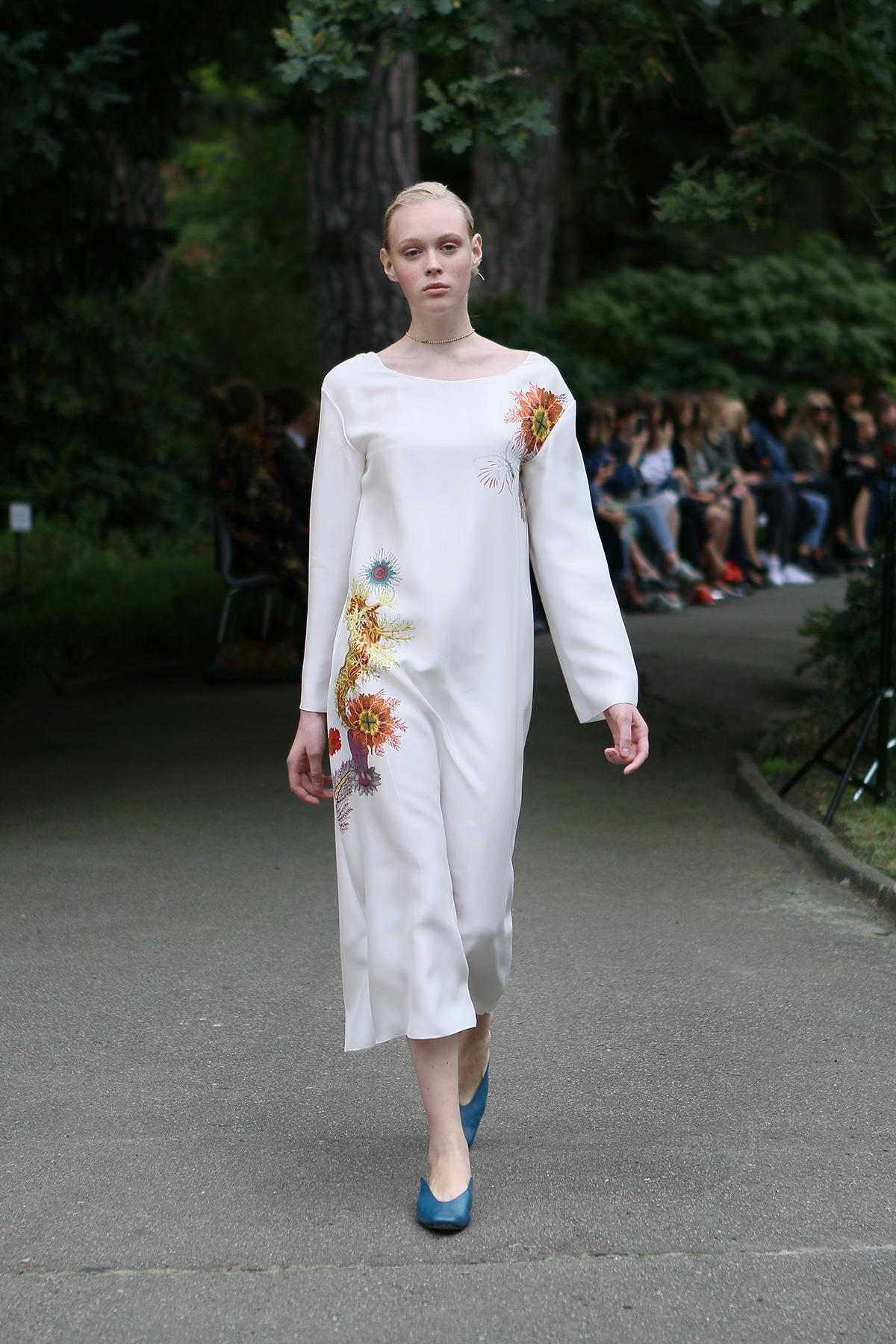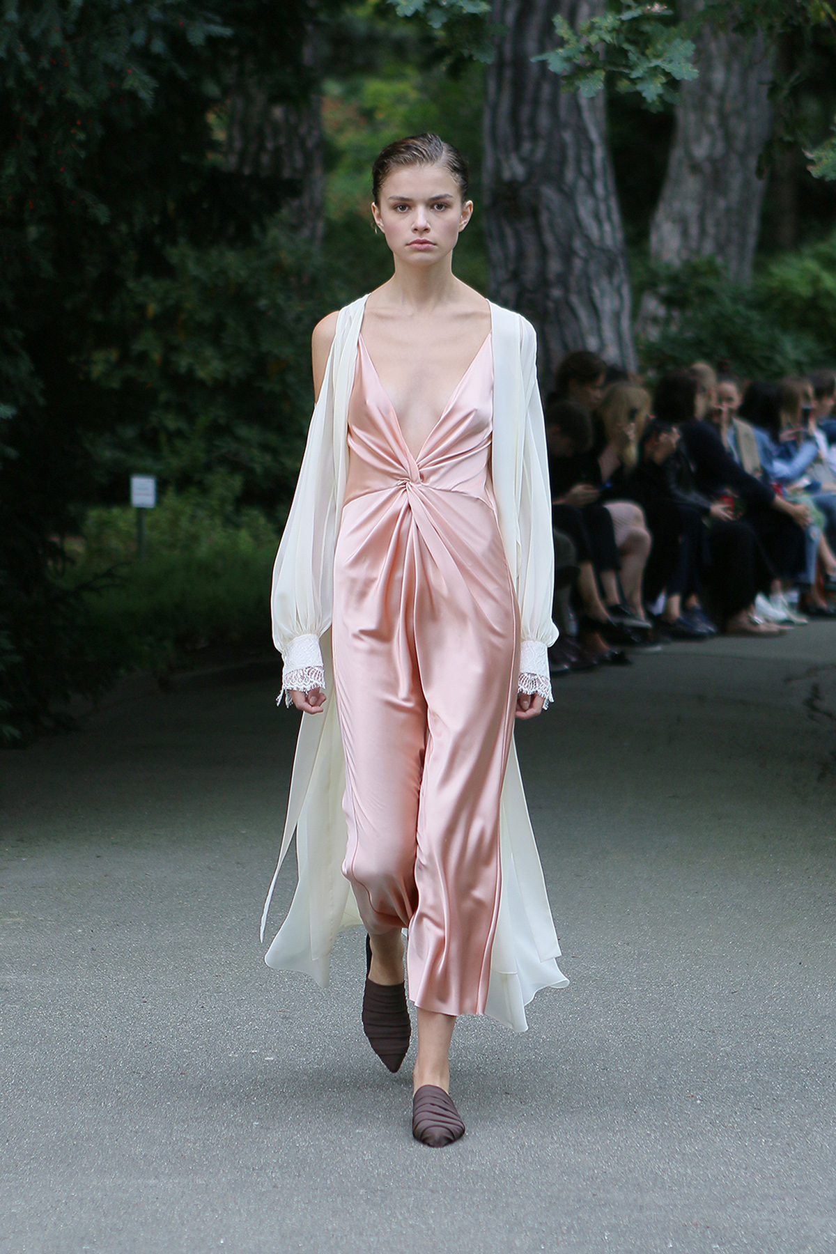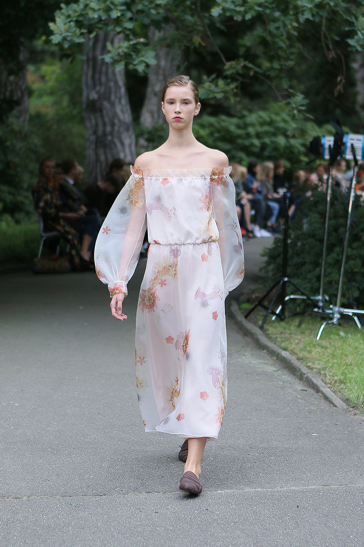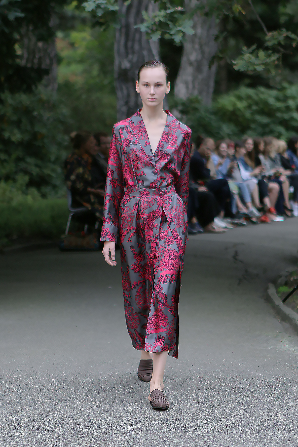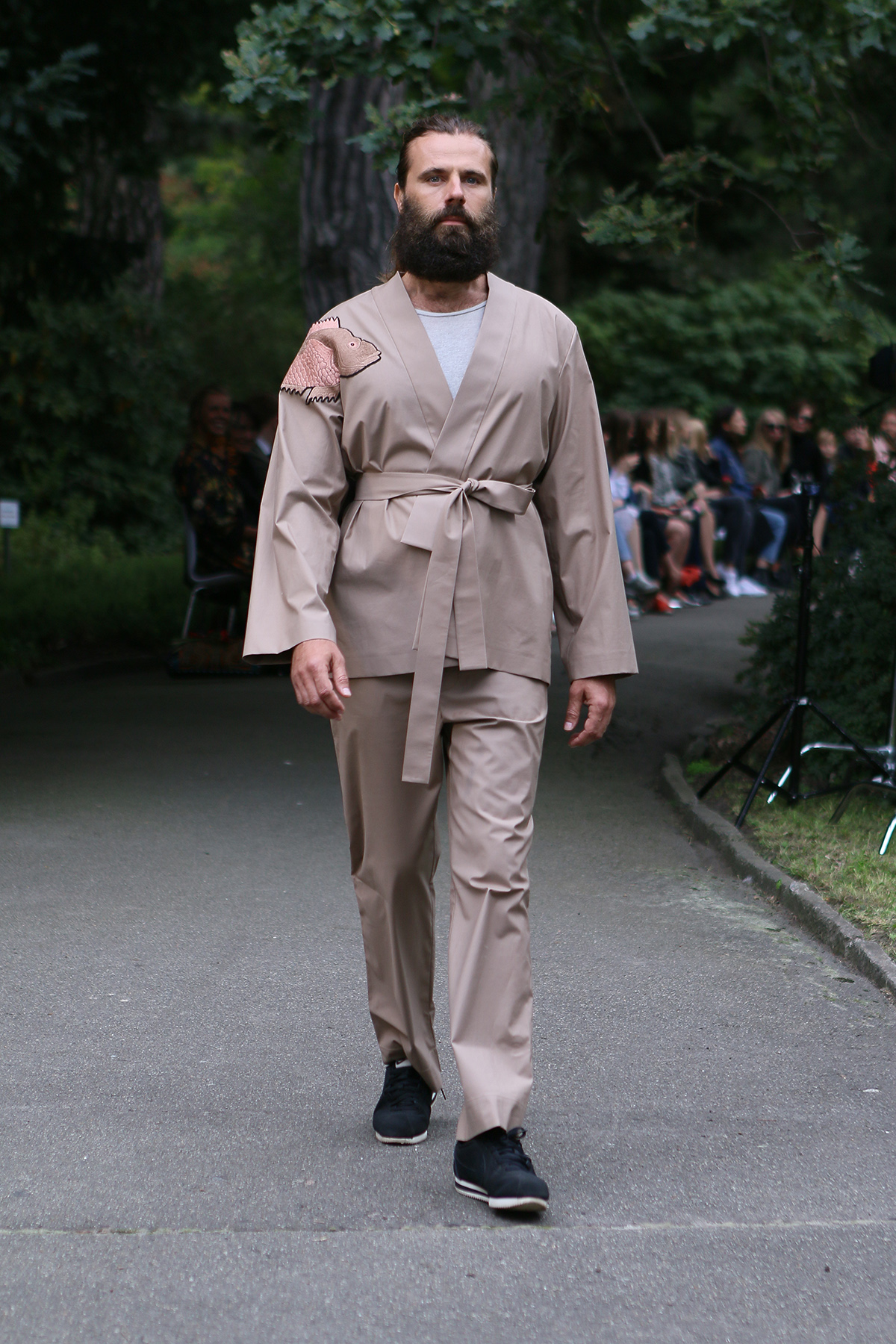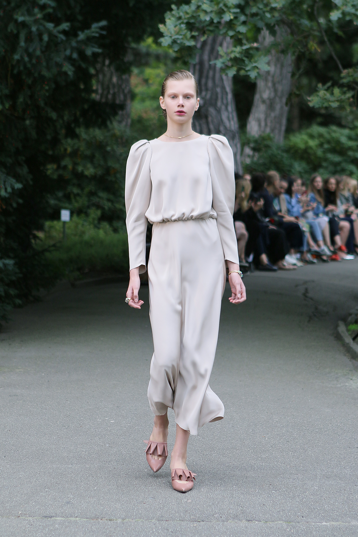 Показ проходил в научной части Ботанического сада имени Фомина; креативной команде бренда очень хотелось организовать шоу на открытом воздухе, и их не напугала даже потенциальная возможность дождя. Риск оказался совершенно оправдан: модели переодевались в оранжереях, а гости рассаживались вдоль дорожек, предварительно получив шанс прогуляться по тропинкам мимо уникальных растений удивительной красоты. Сопровождала показ живая музыка в исполнении группы New Brain Trio, которая довершала и без того волшебную атмосферу, – эти звуки, подобно тому самому пению сирен, очаровывали, манили и завораживали.