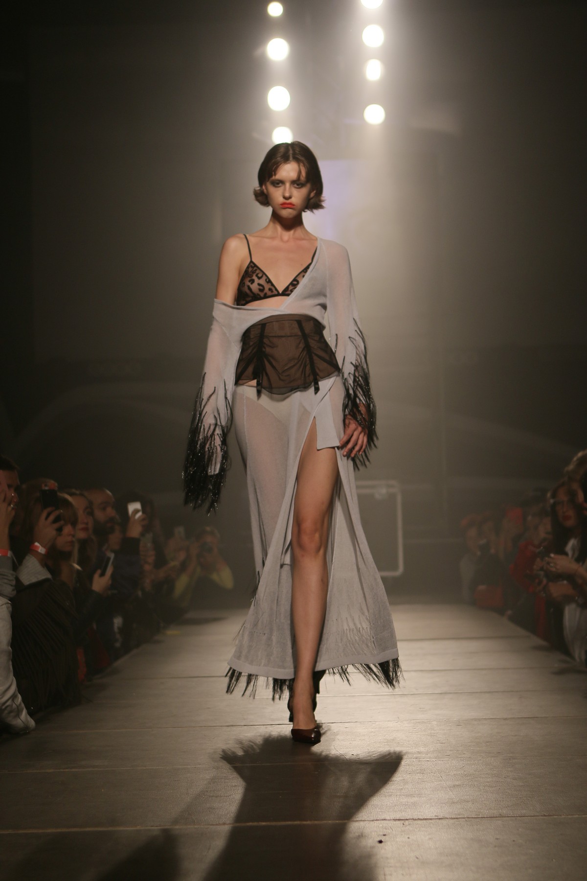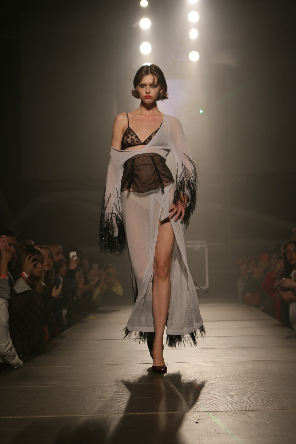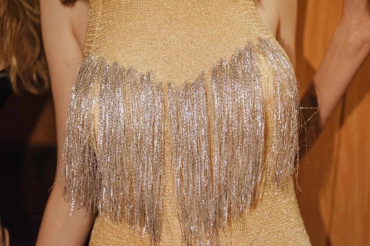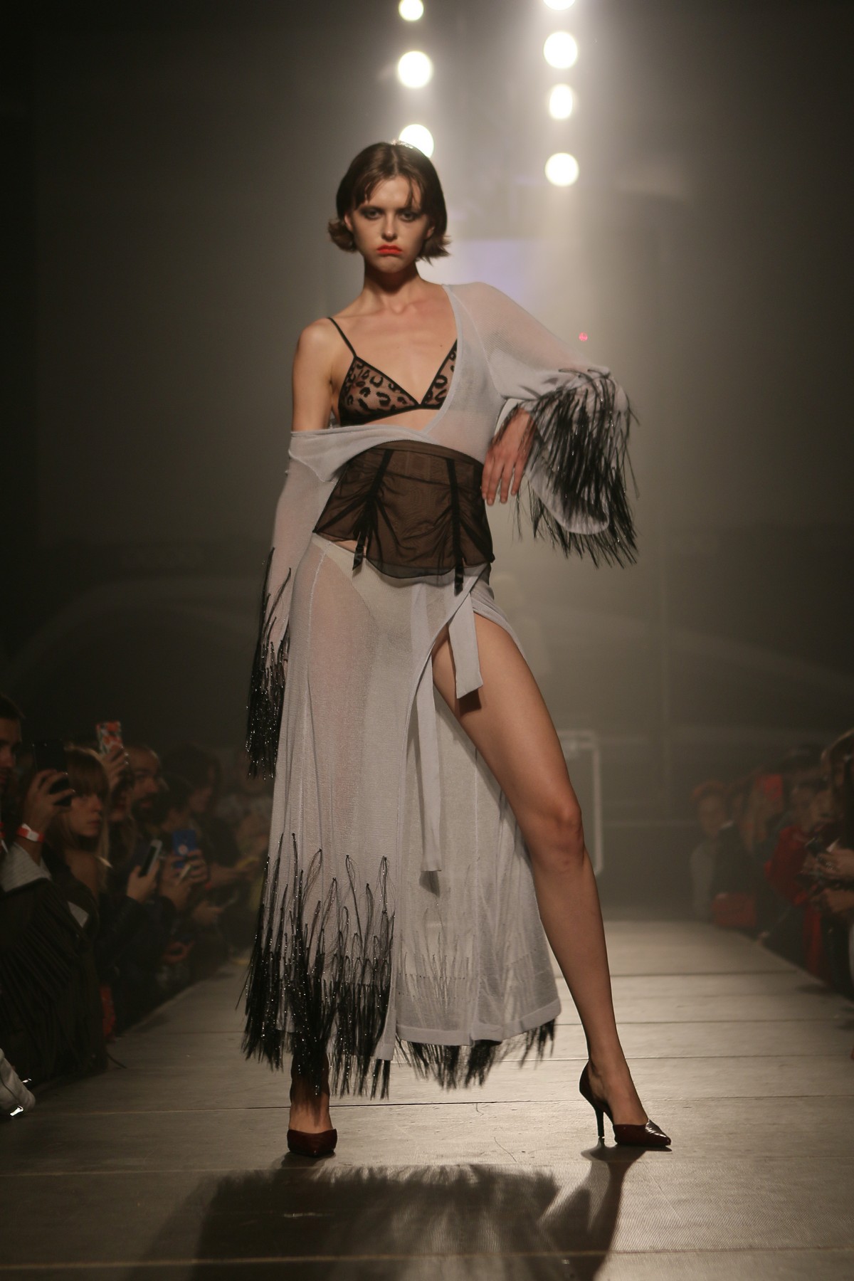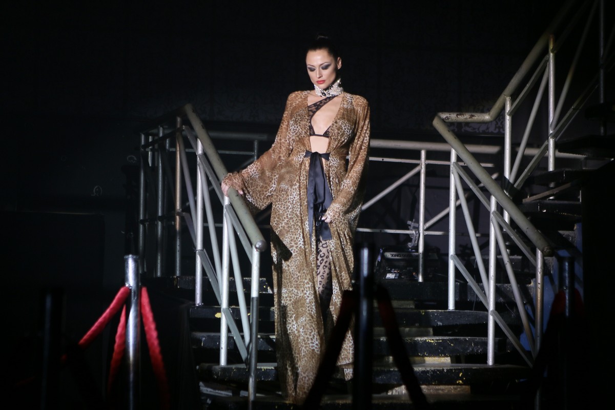 В коллекции присутствует много блеска, сочетания несочетаемых фактур, декоративных элементов, полупрозрачных текстур, леопардовый принт, кристаллы – с пайетками и глубокими V-образными декольте, бахрома – с ковбойскими сапогами и кружево – с позолоченной тканью.