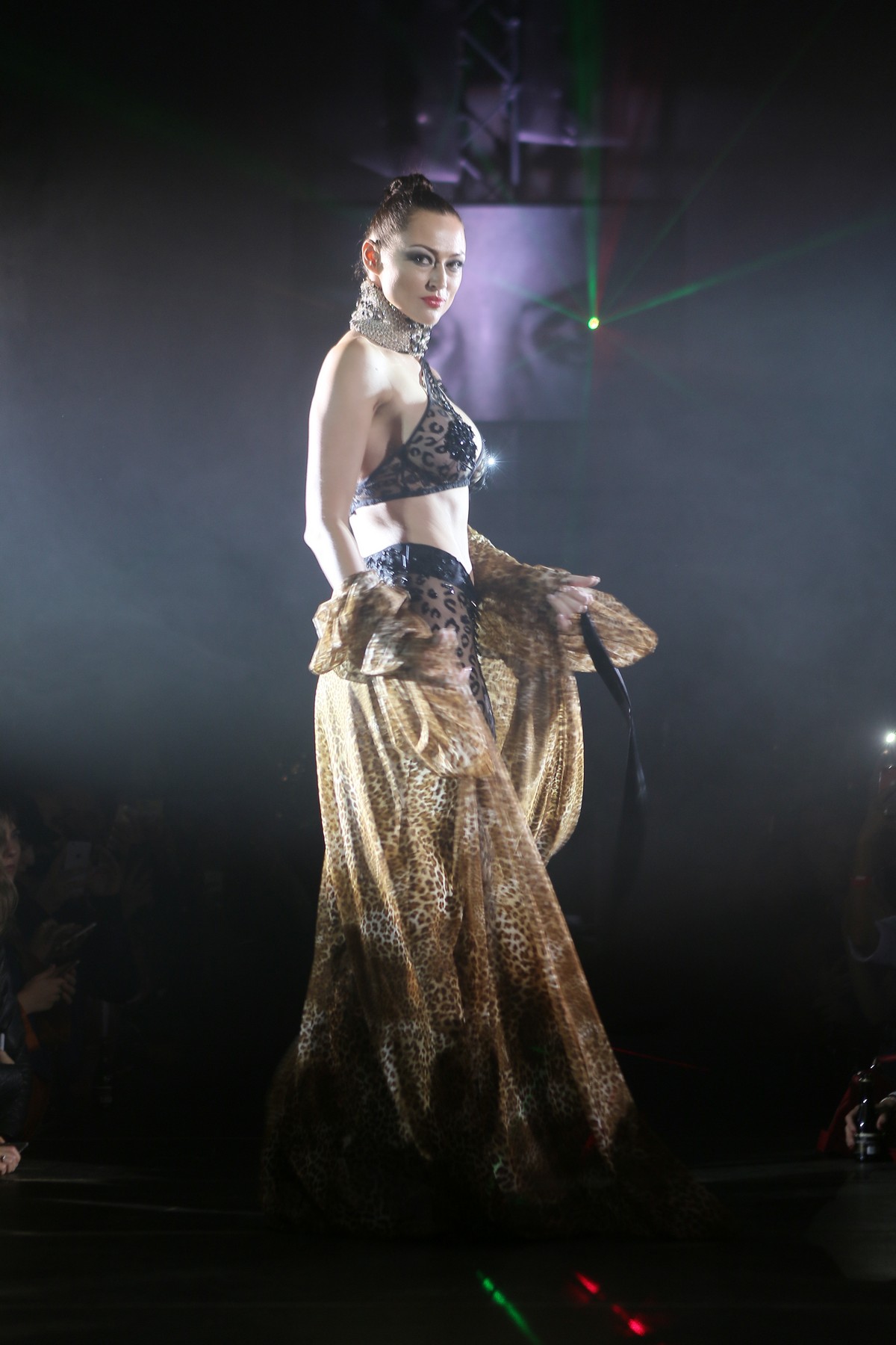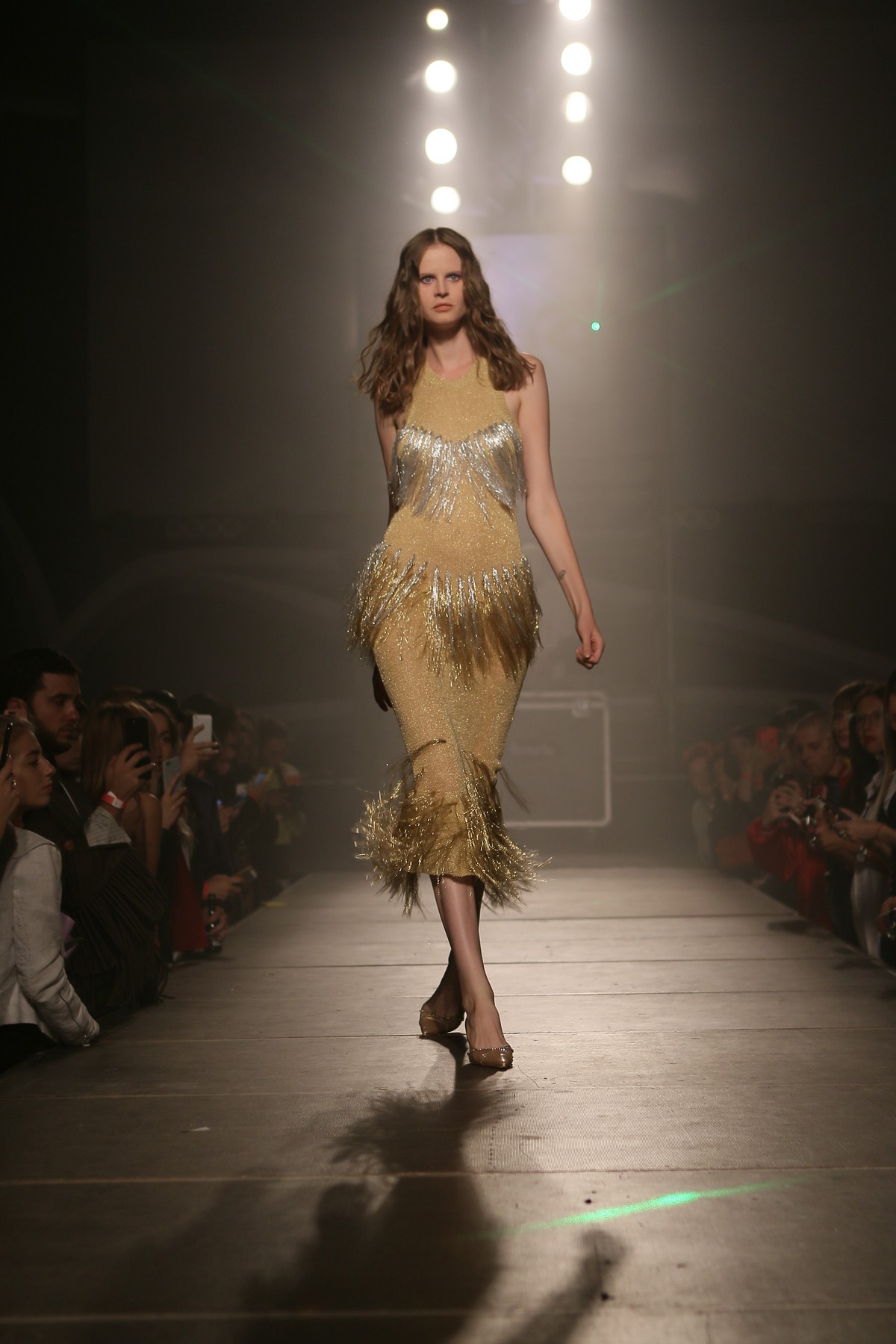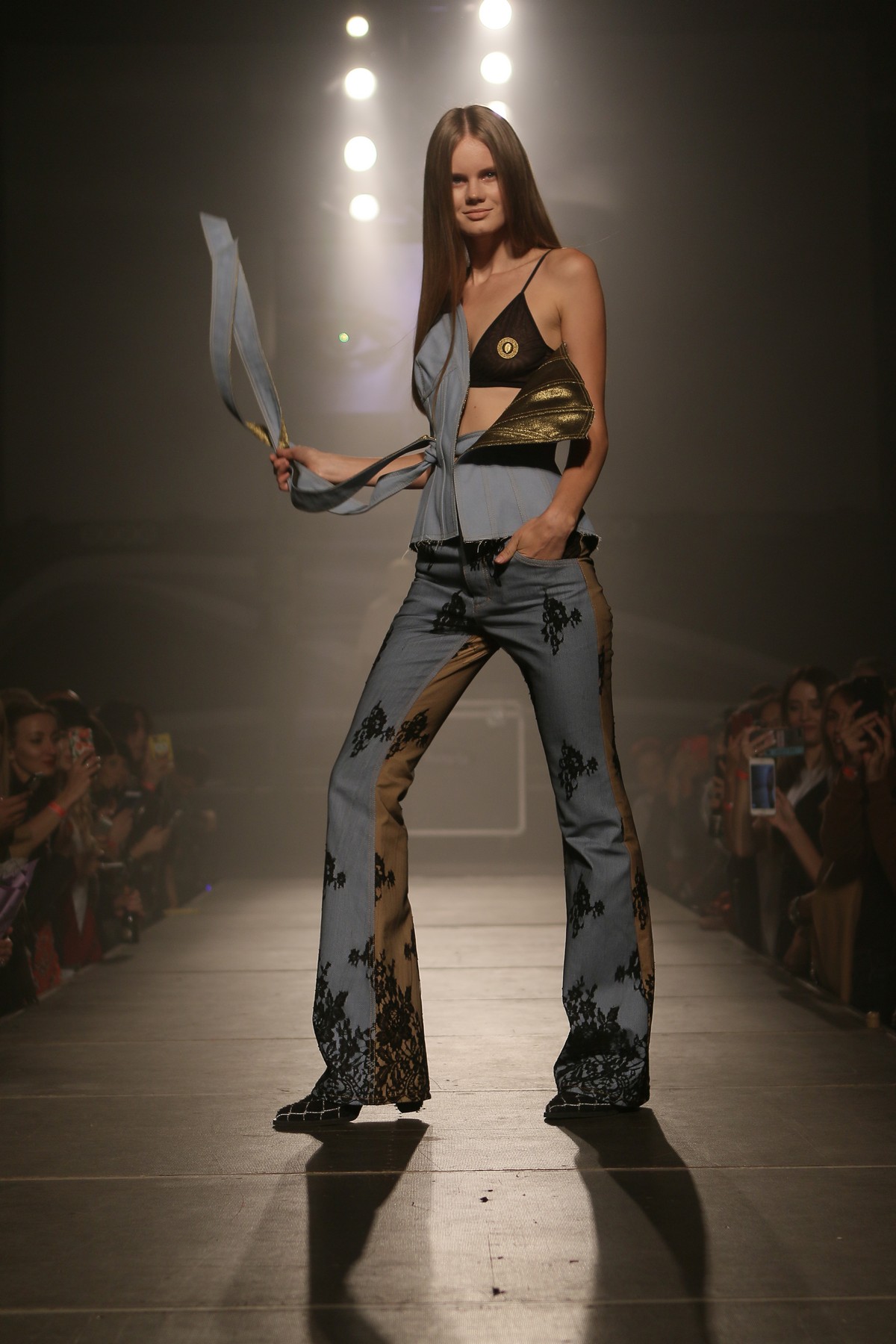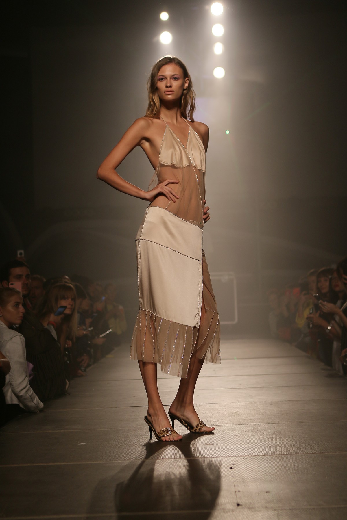 В коллекции присутствует много блеска, сочетания несочетаемых фактур, декоративных элементов, полупрозрачных текстур, леопардовый принт, кристаллы – с пайетками и глубокими V-образными декольте, бахрома – с ковбойскими сапогами и кружево – с позолоченной тканью.