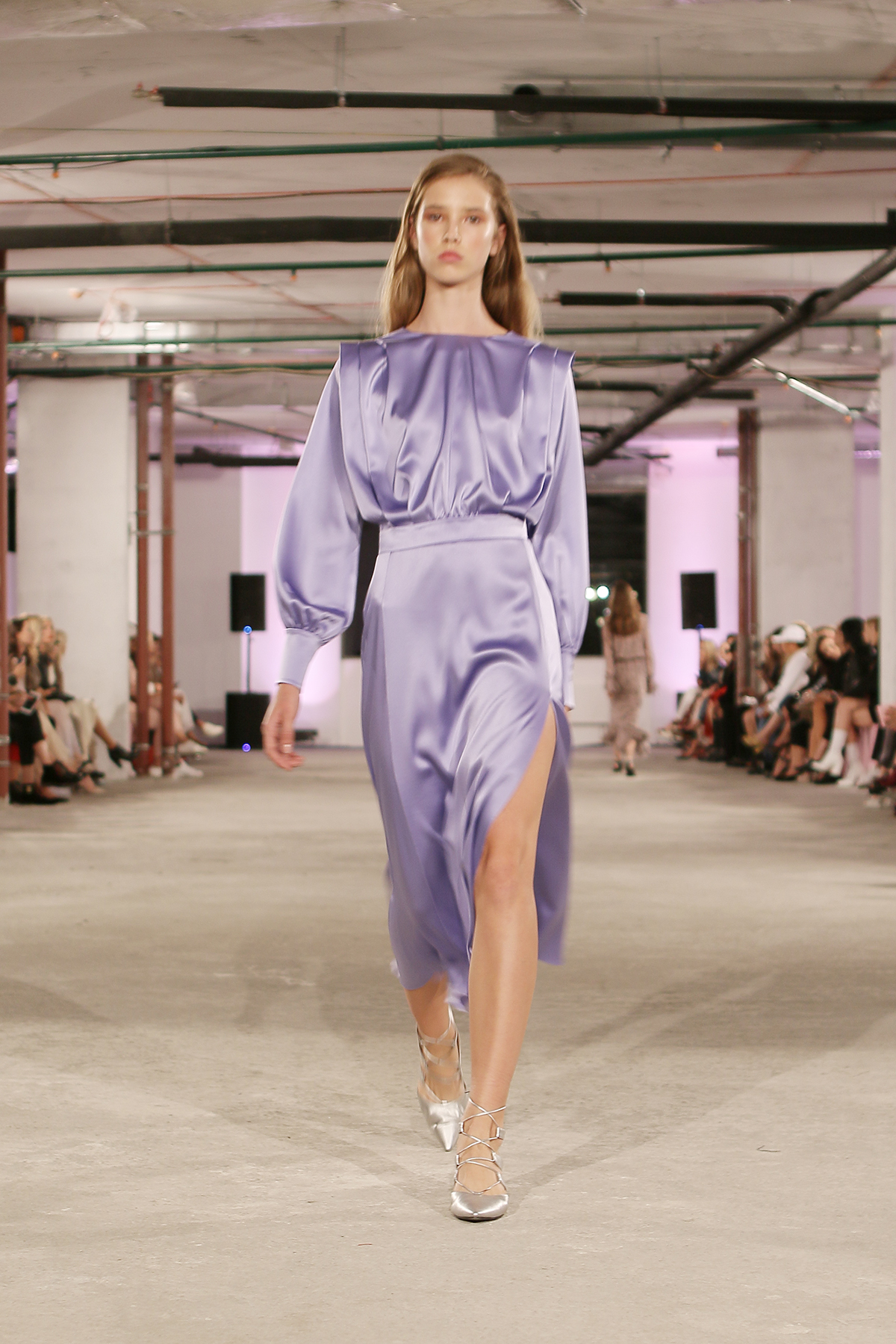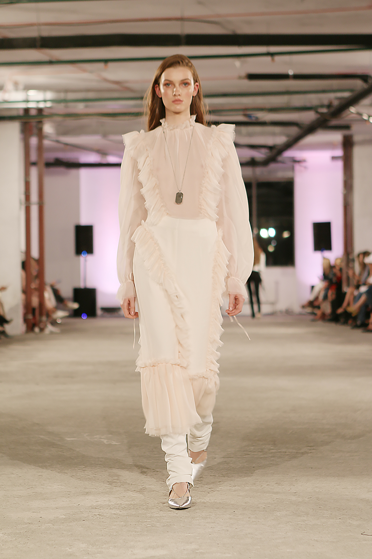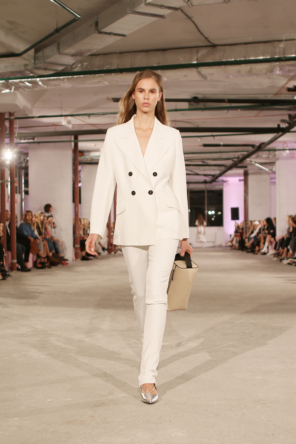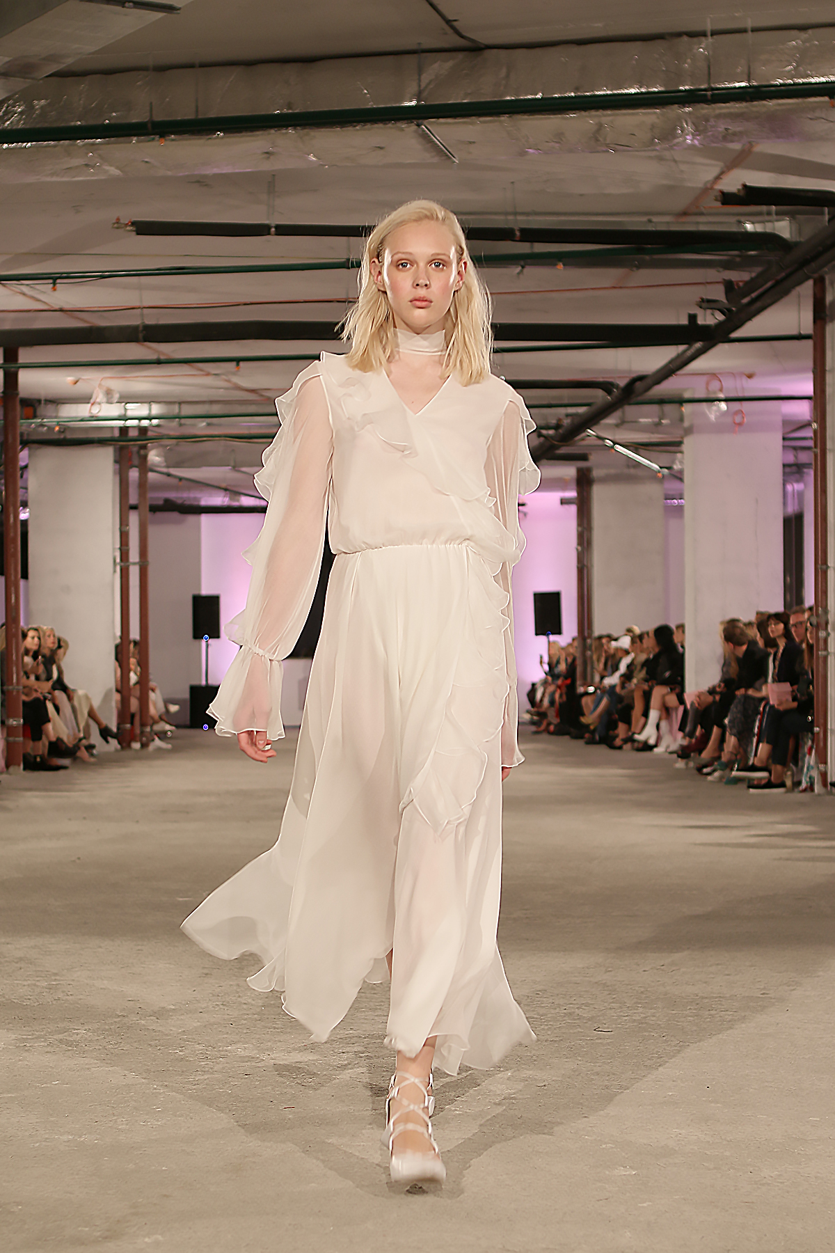 Летящие платья длины миди из шелка и шифона, чистые цвета, белый и персиковый крем, корсеты, воланы и шелковые контрастные ленты – аллюзия на эстетику картины Уира. Романтичную сторону коллекции уравновешивают свободные жакеты и зауженные брюки из тонкой шерсти, тренчи и знаковые для бренда платья-бюстье.