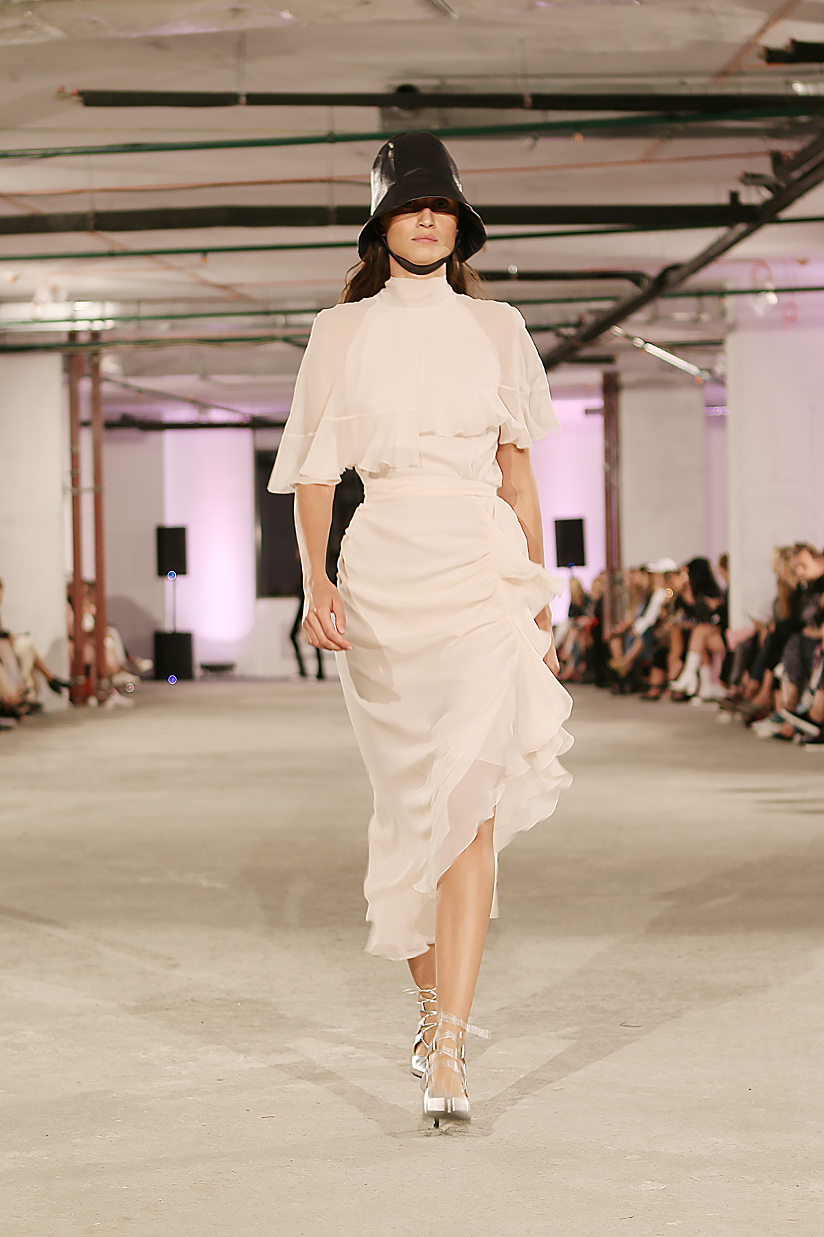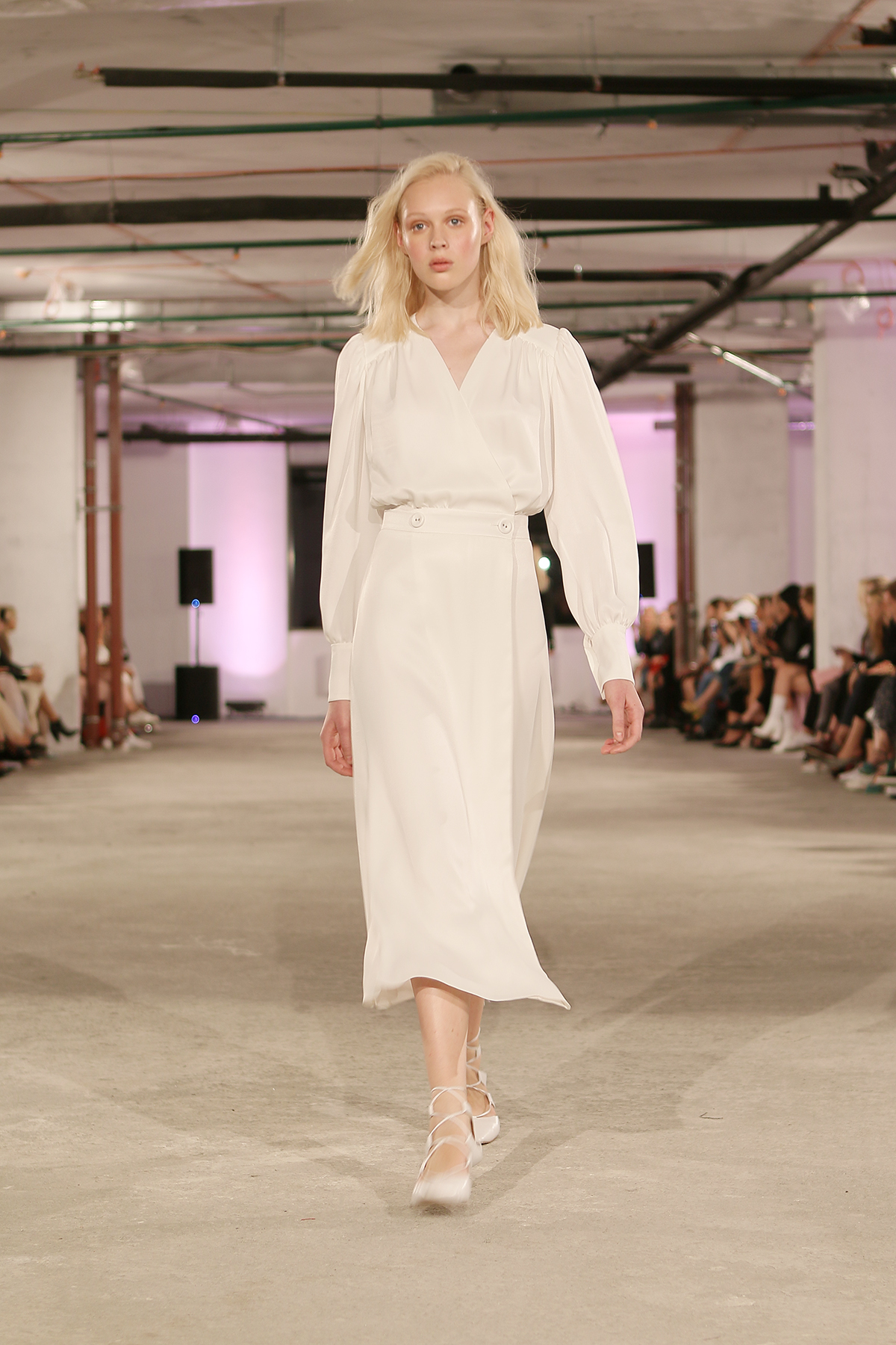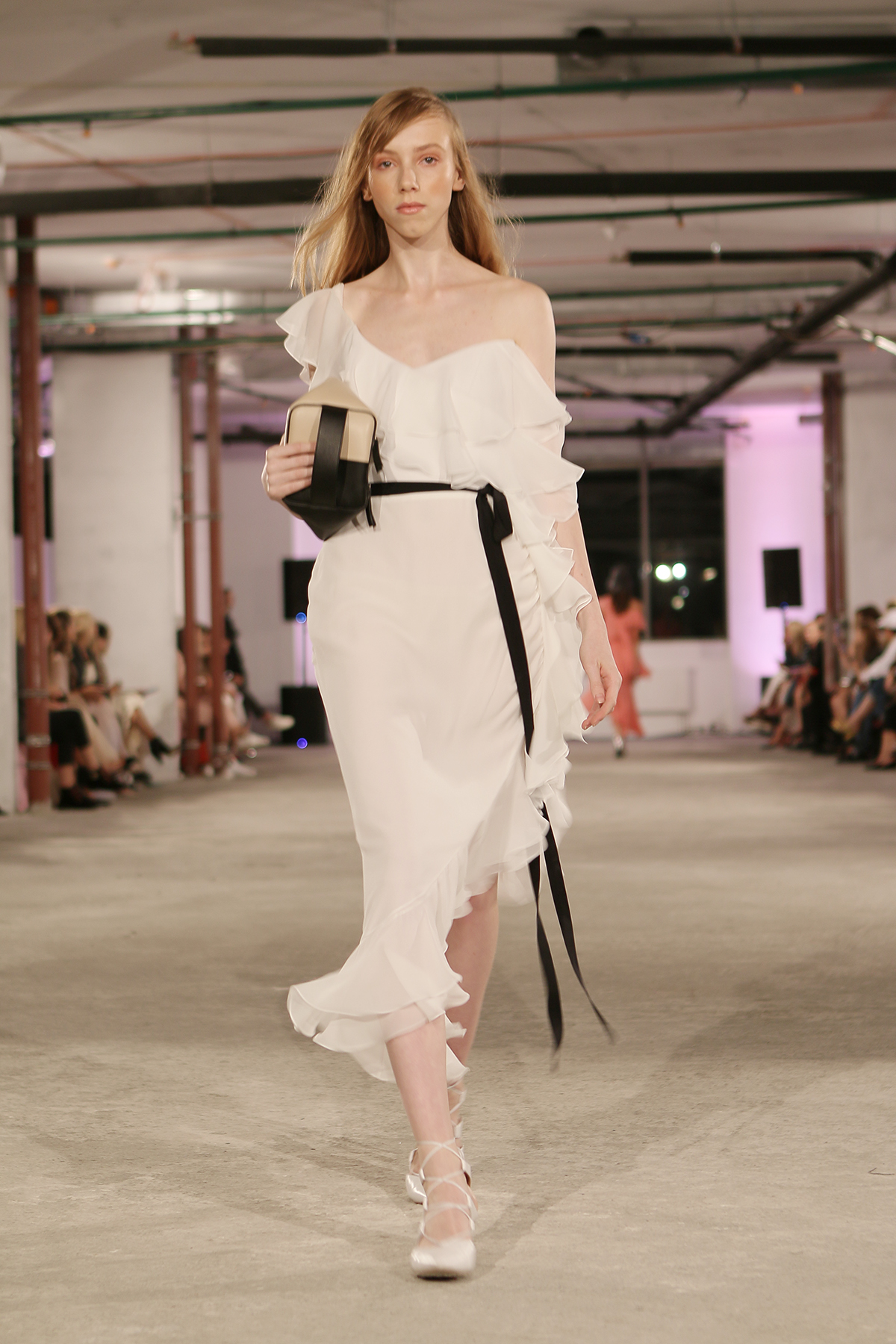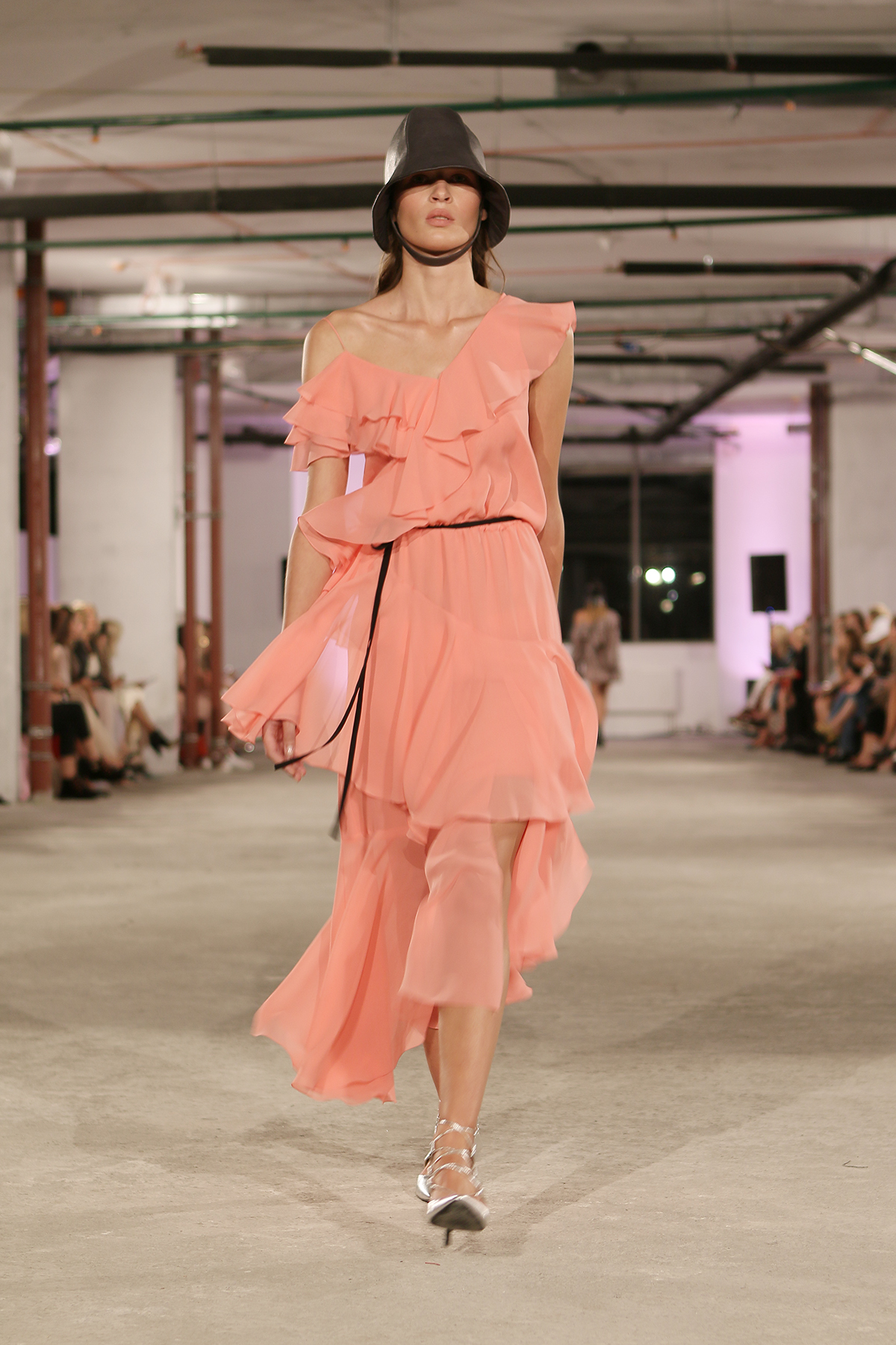 Летящие платья длины миди из шелка и шифона, чистые цвета, белый и персиковый крем, корсеты, воланы и шелковые контрастные ленты – аллюзия на эстетику картины Уира. Романтичную сторону коллекции уравновешивают свободные жакеты и зауженные брюки из тонкой шерсти, тренчи и знаковые для бренда платья-бюстье.