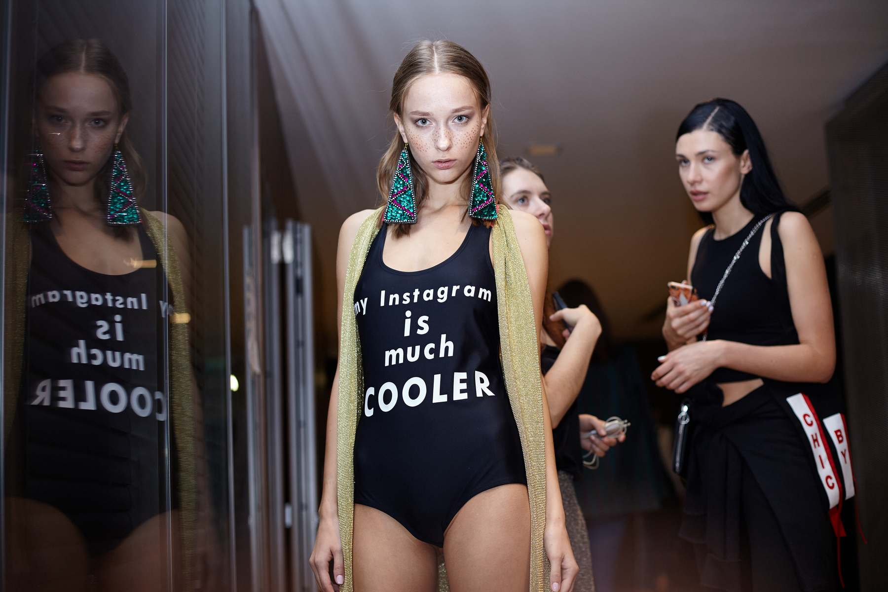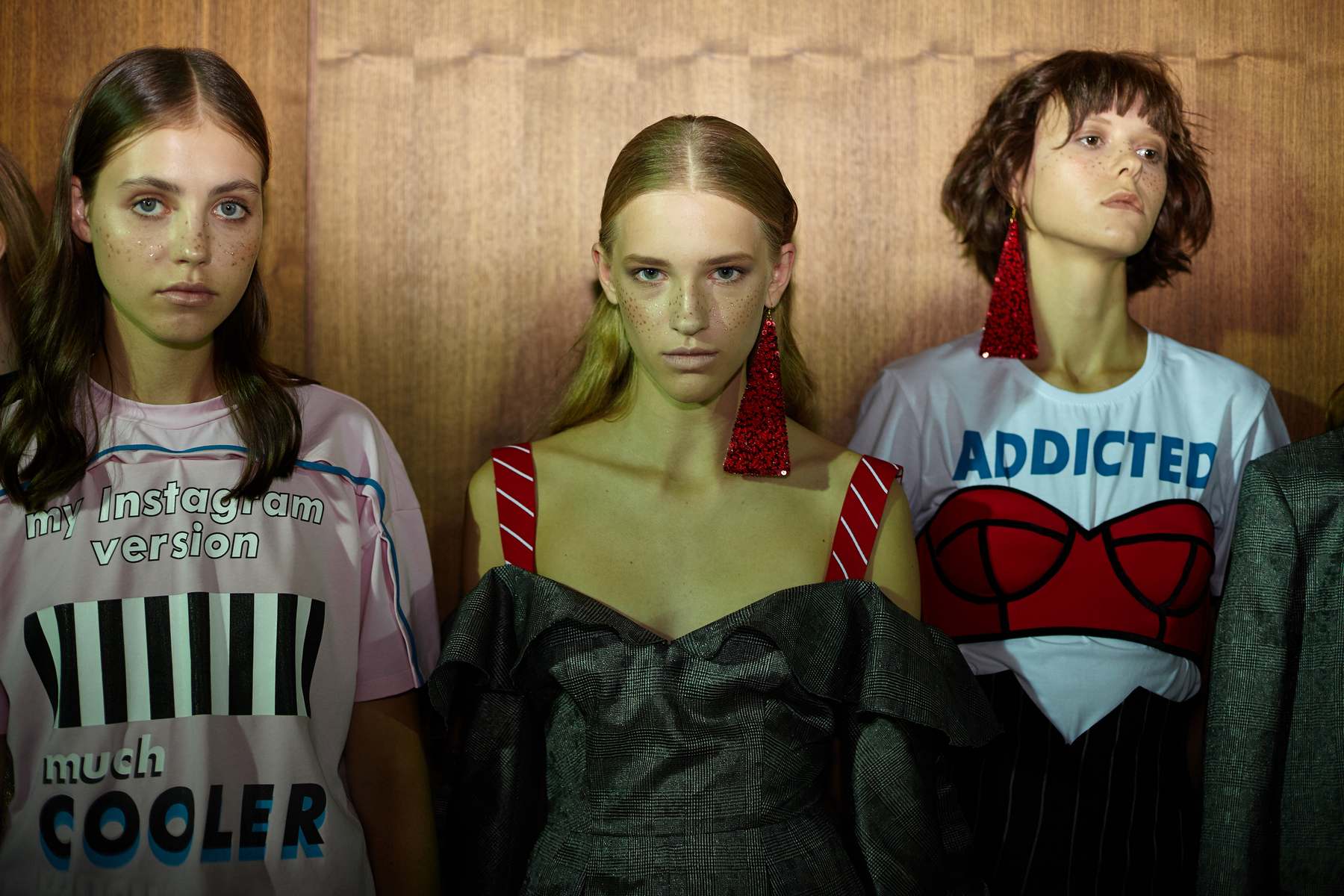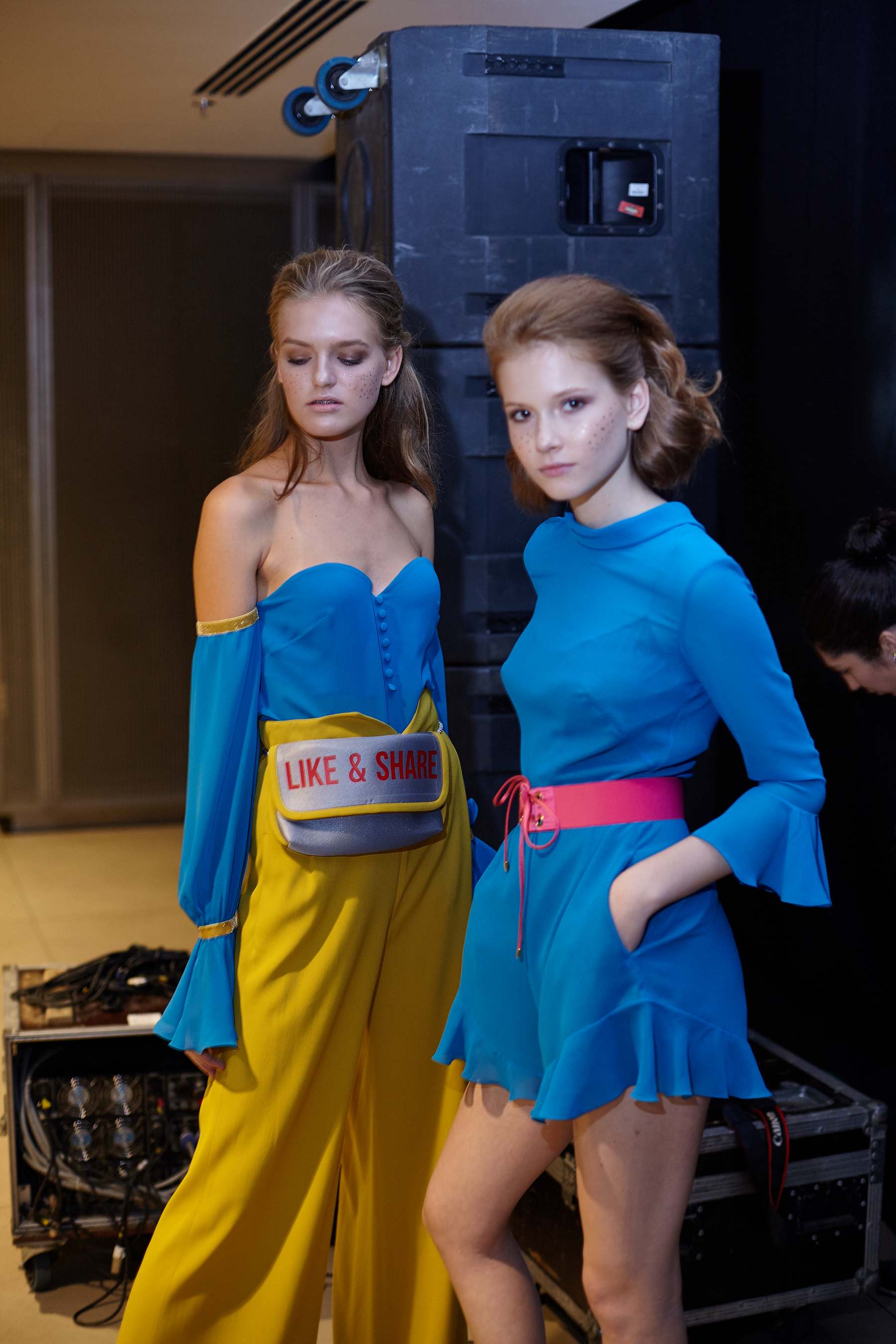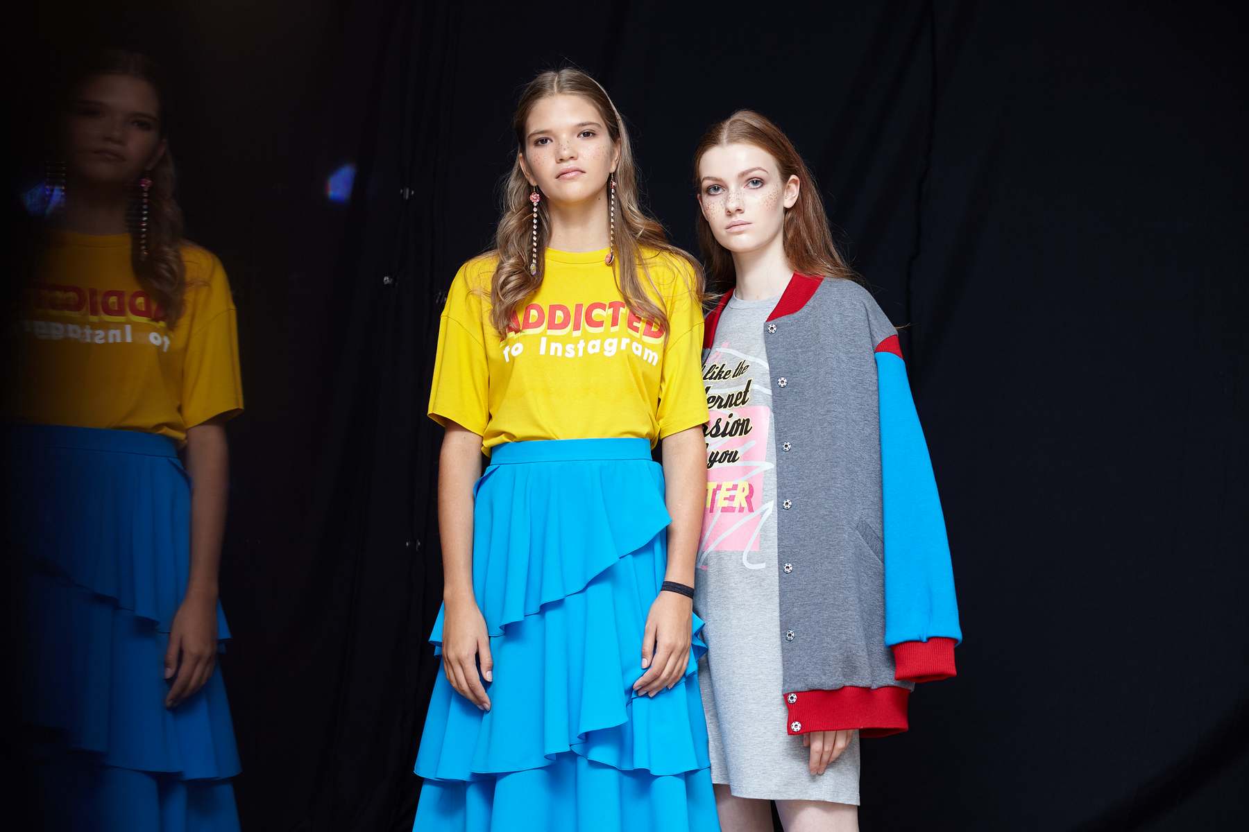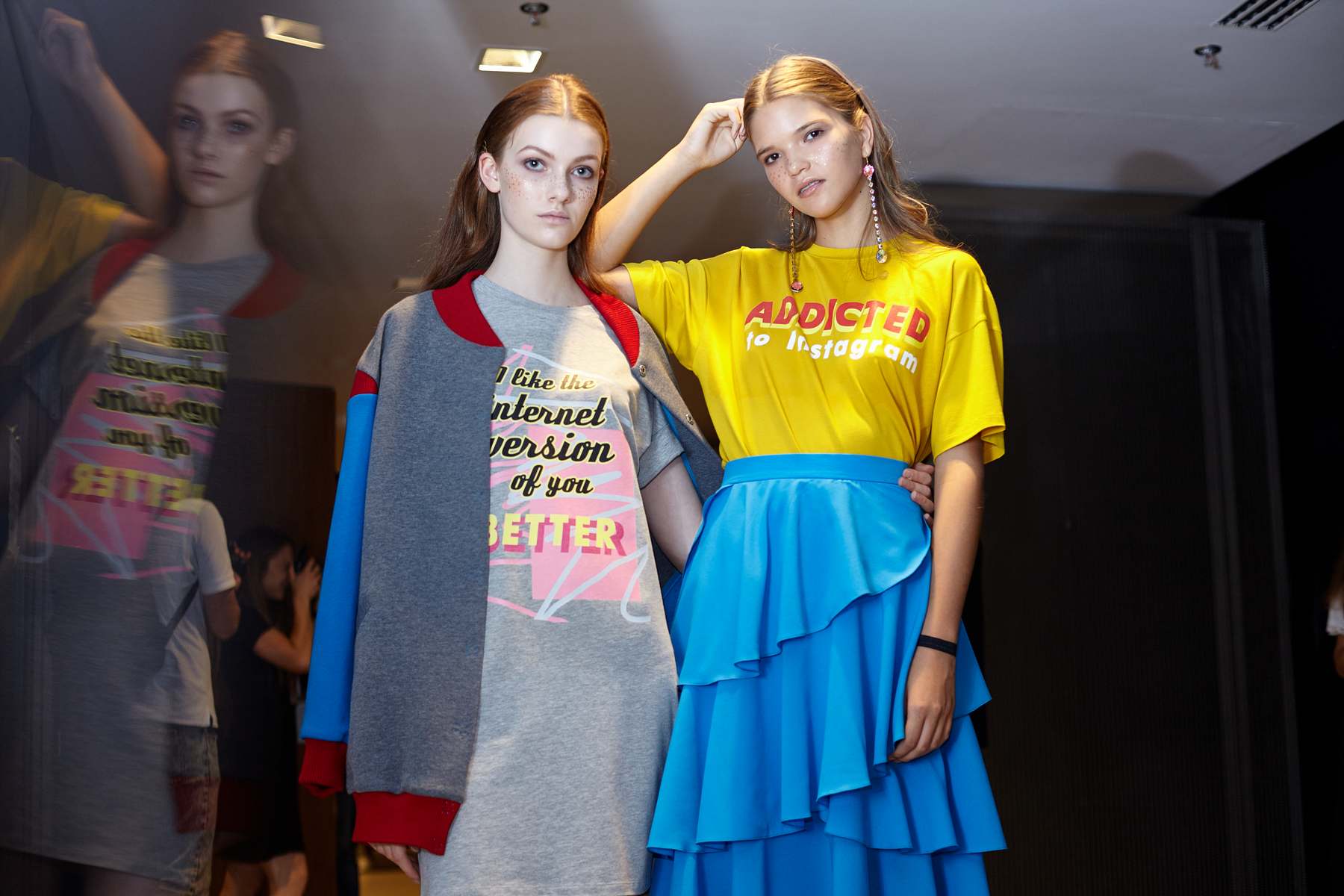 Знаковым аксессуаром коллекции стал клатч Like & Share, а самым запоминающимся образом - белая футболка с надписью Addicted to Instagram, с завышенными штанами классического кроя и бюстье приглушенно-красного цвета. Цветовая палитра варьируется от черно-белой гаммы до оттенков фуксии, красного, желтого, золотого, молочного и синего.