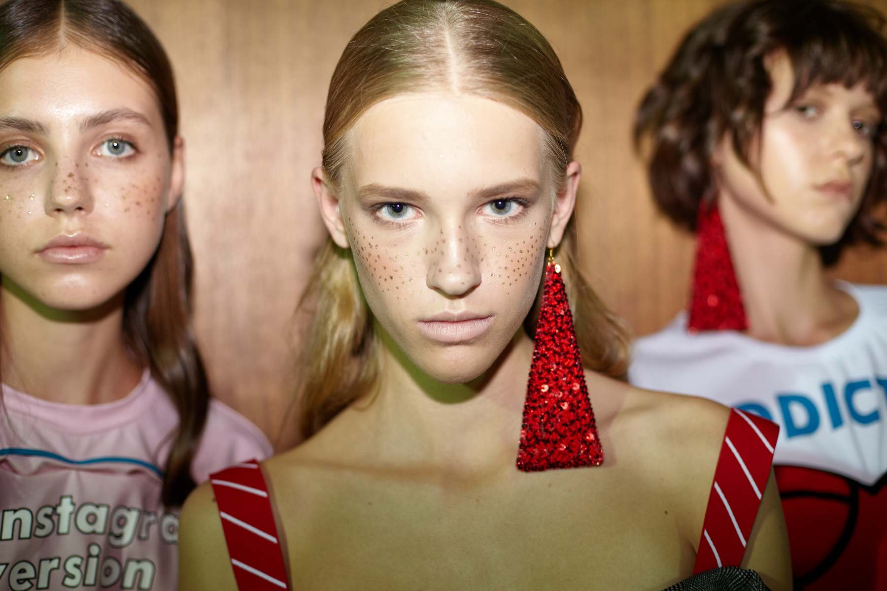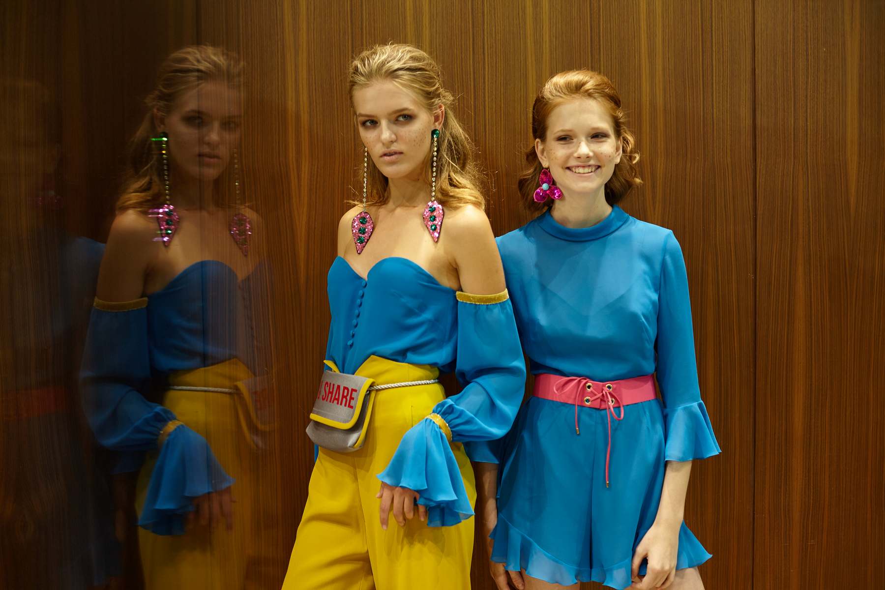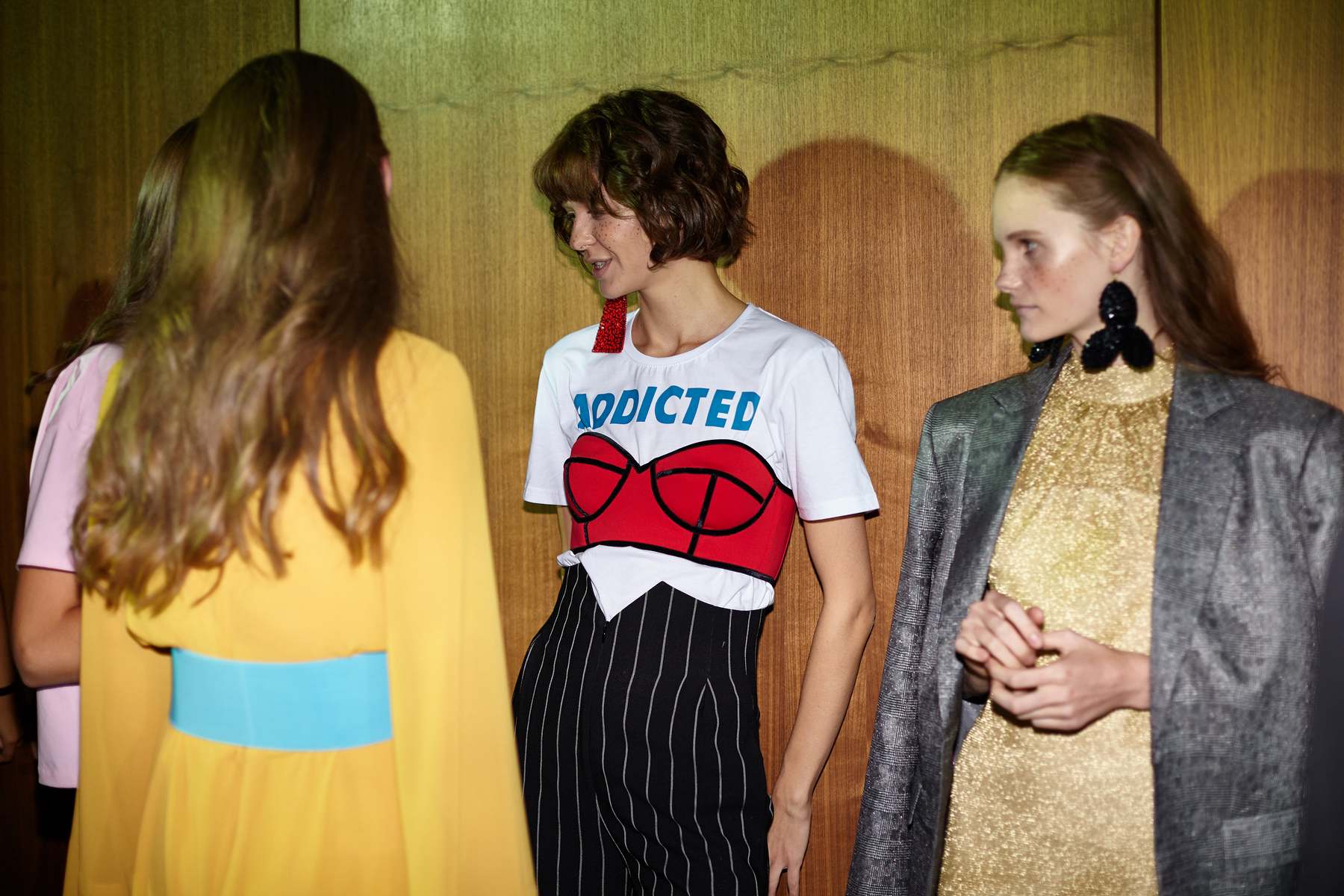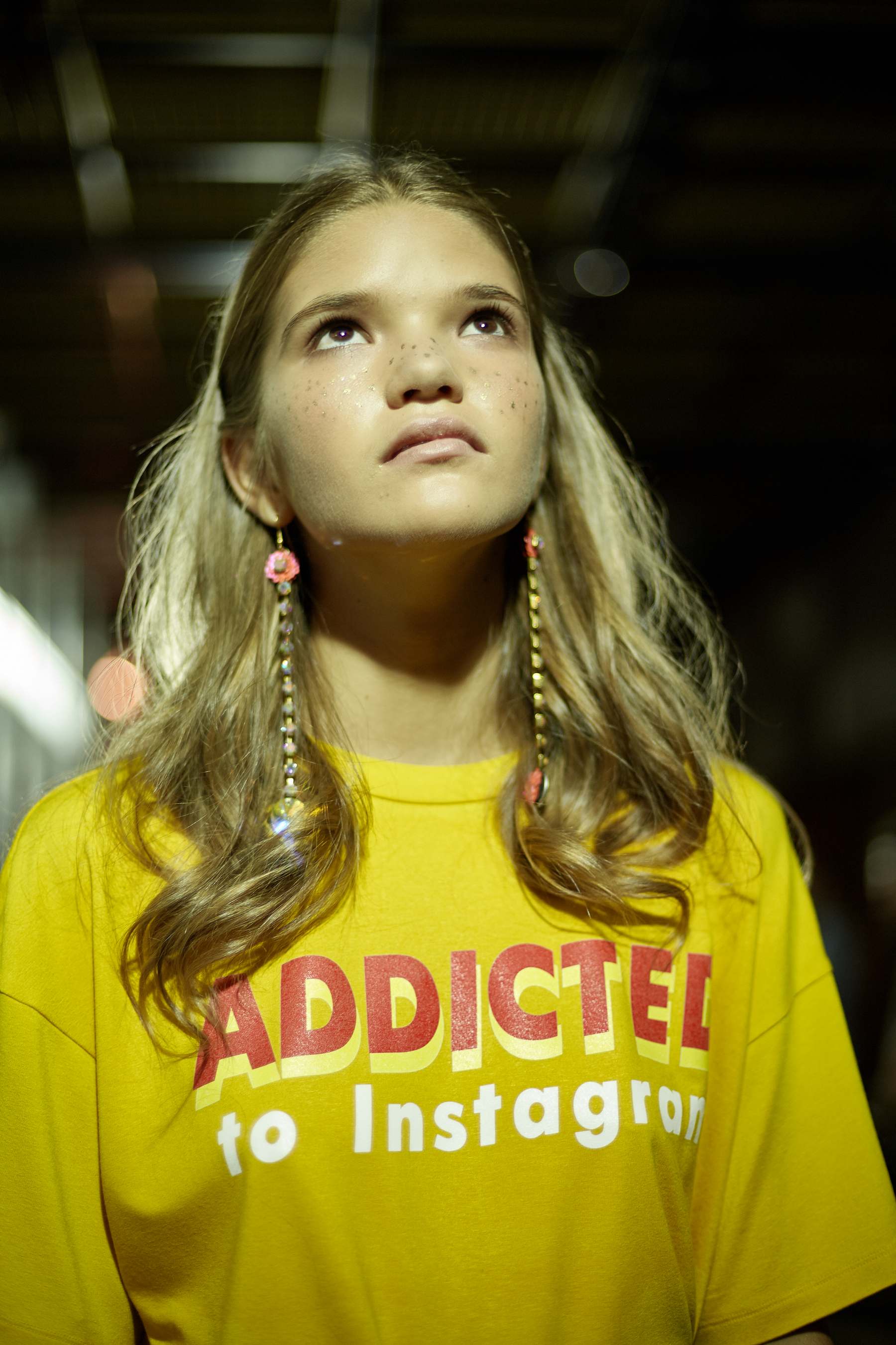 Знаковым аксессуаром коллекции стал клатч Like & Share, а самым запоминающимся образом - белая футболка с надписью Addicted to Instagram, с завышенными штанами классического кроя и бюстье приглушенно-красного цвета. Цветовая палитра варьируется от черно-белой гаммы до оттенков фуксии, красного, желтого, золотого, молочного и синего.