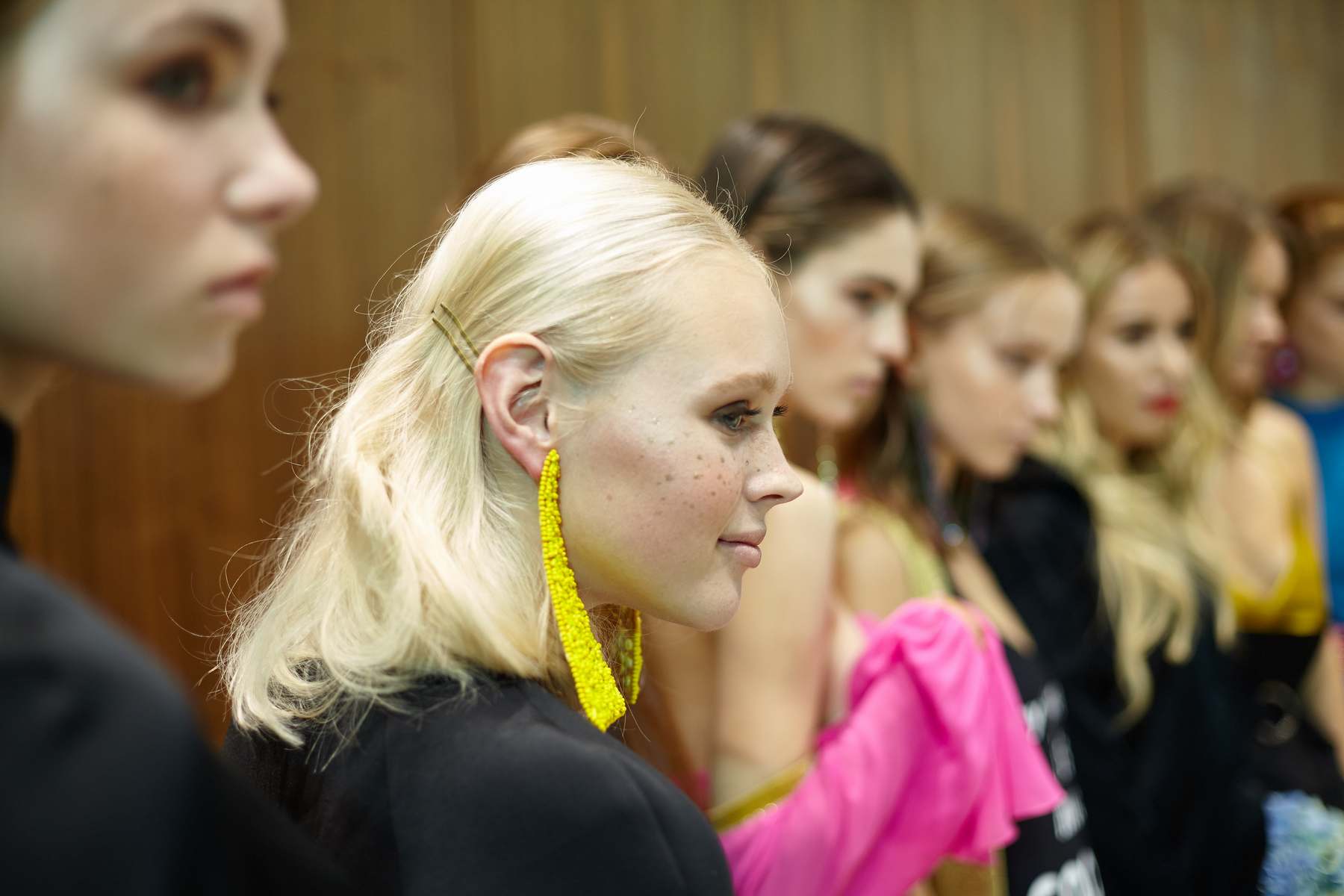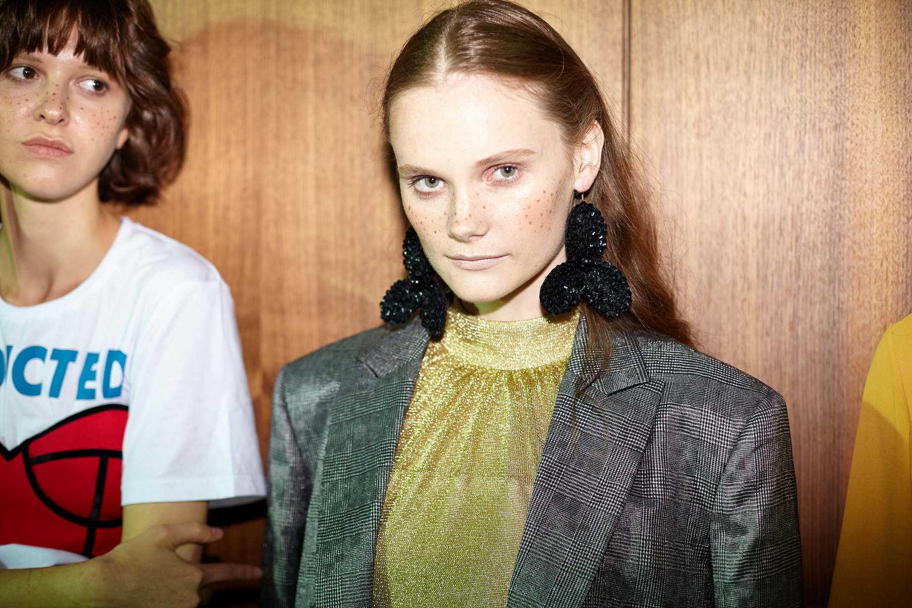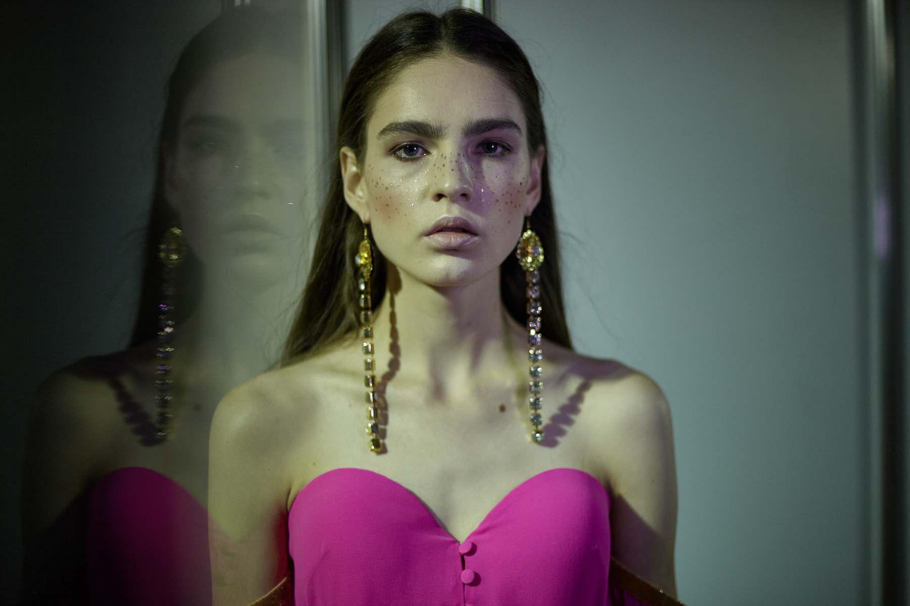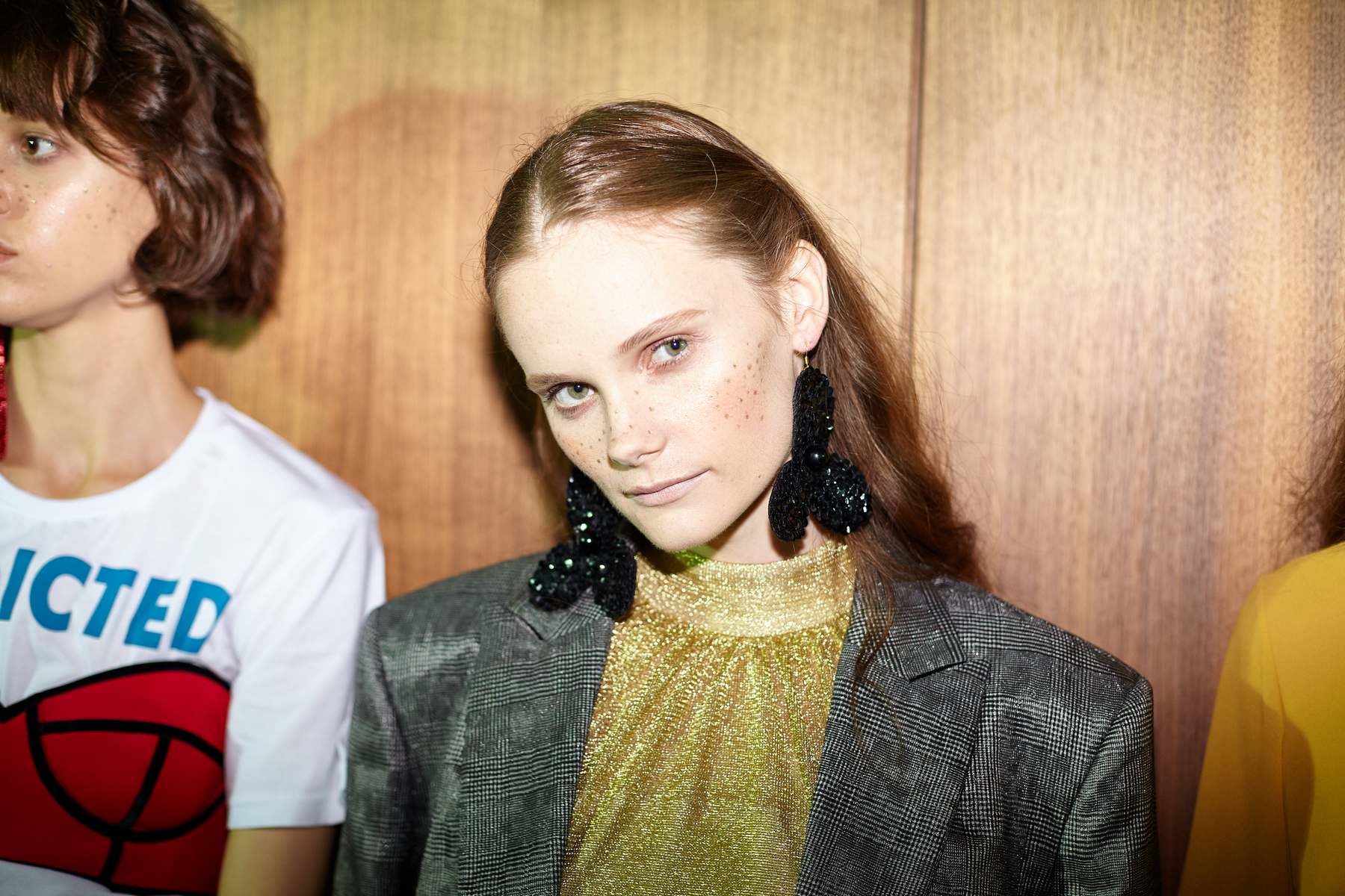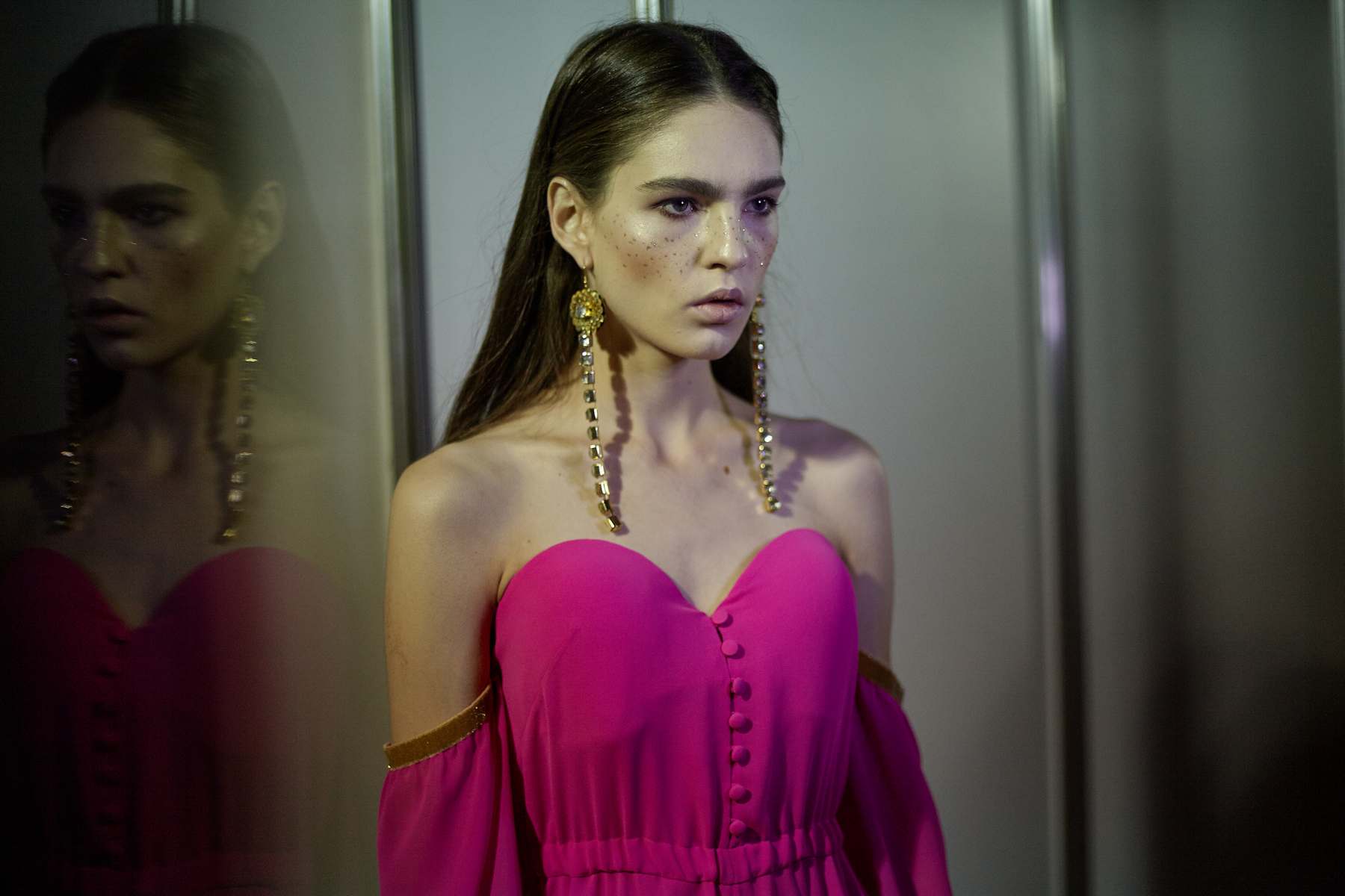 Знаковым аксессуаром коллекции стал клатч Like & Share, а самым запоминающимся образом - белая футболка с надписью Addicted to Instagram, с завышенными штанами классического кроя и бюстье приглушенно-красного цвета. Цветовая палитра варьируется от черно-белой гаммы до оттенков фуксии, красного, желтого, золотого, молочного и синего.
