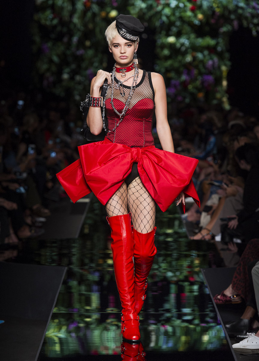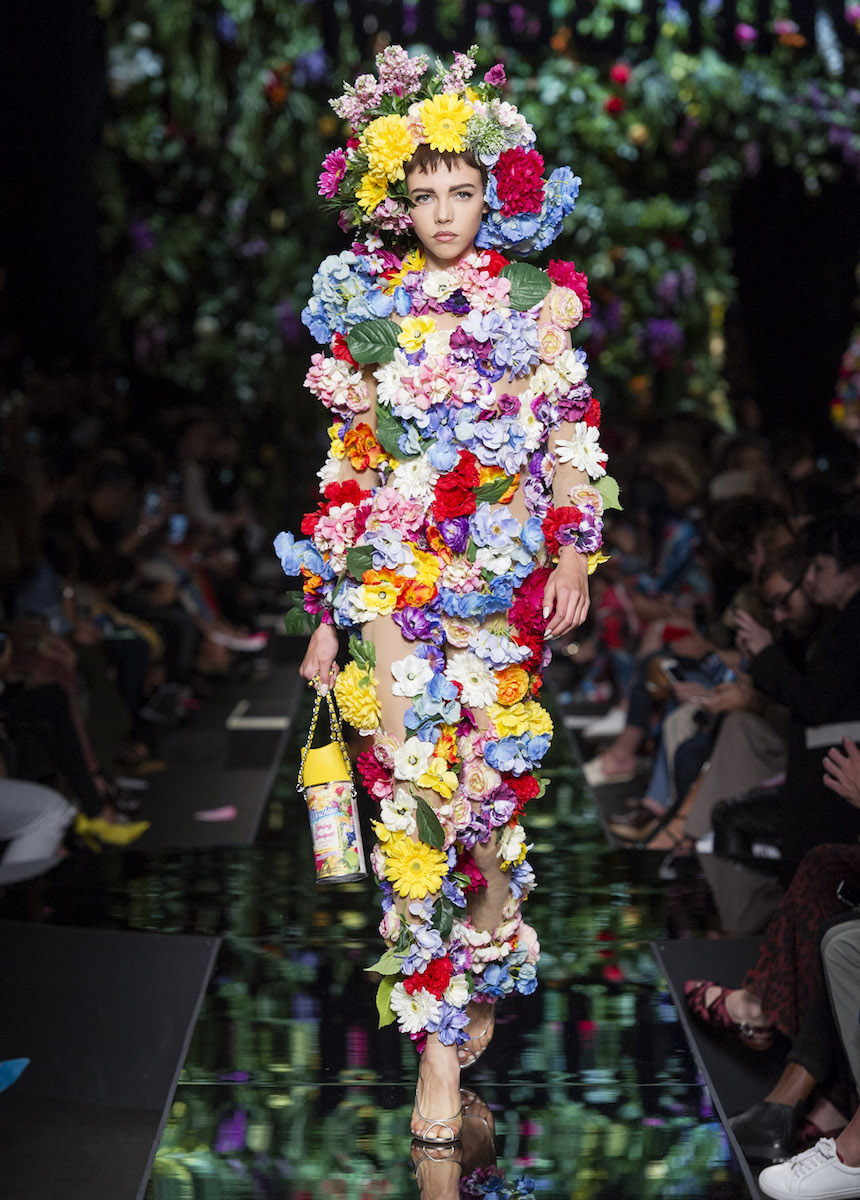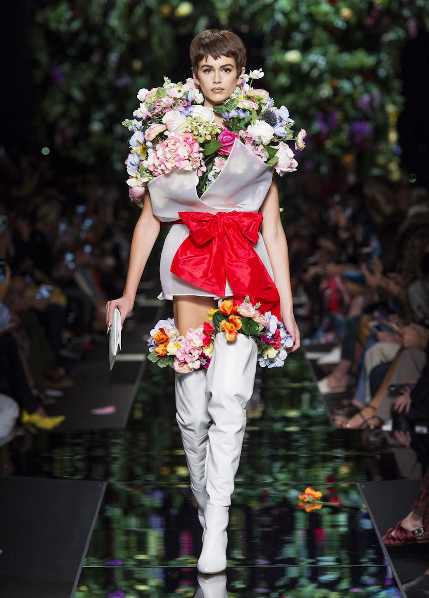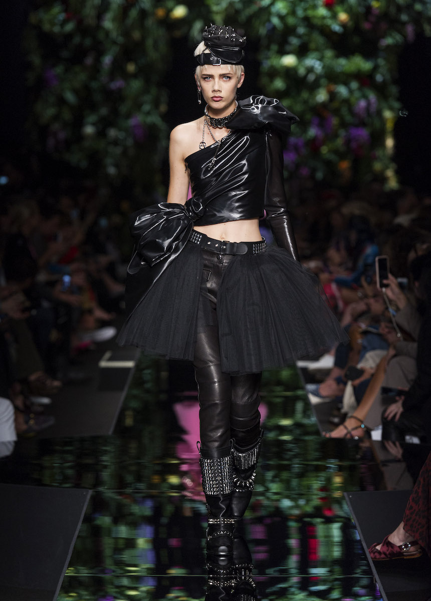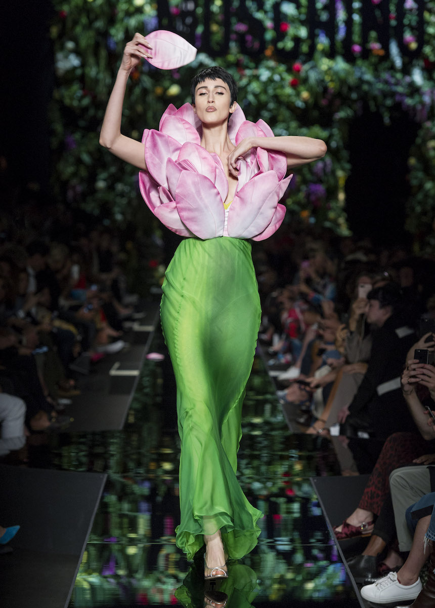 Мир Moschino, под лозунгом "Всё или ничего", снова предлагает нам яркие смелые образы без полутонов. Во второй части коллекции Джереми Скотт решил одеть своих моделей в платья в виде цветов: ирисов, лилий, орхидей и пионов. Основными материалами коллекции стали органза, кожа, шелк и трикотаж. Знаковый образ продемонстрировала Адвоа Абоа в розовой пачке и черной косухе.