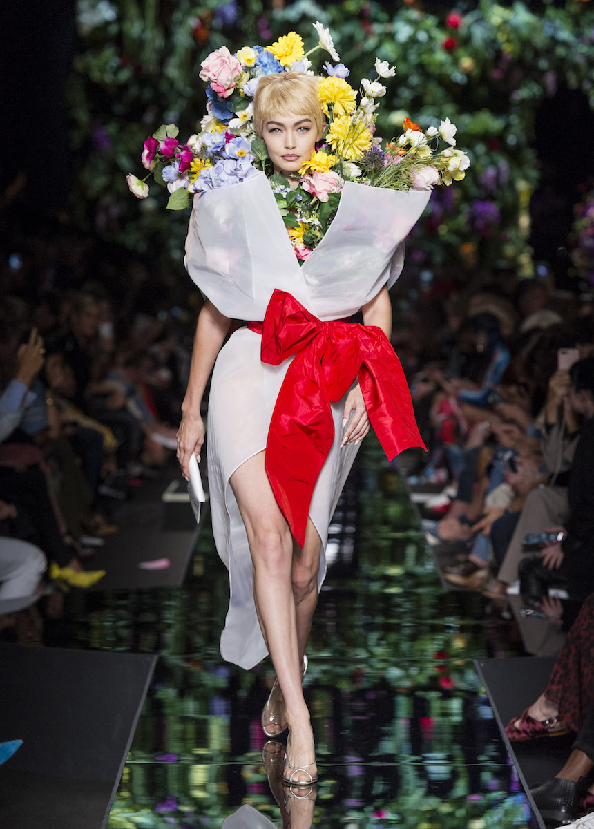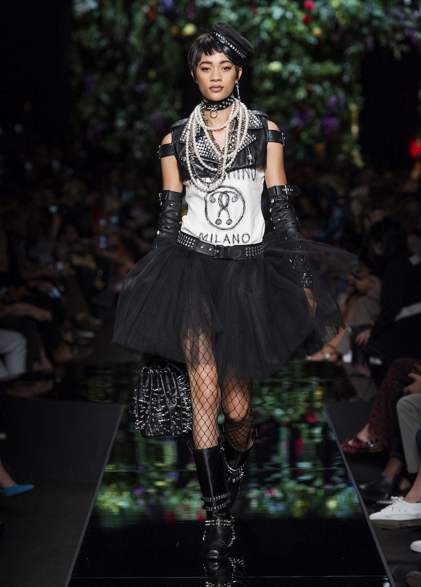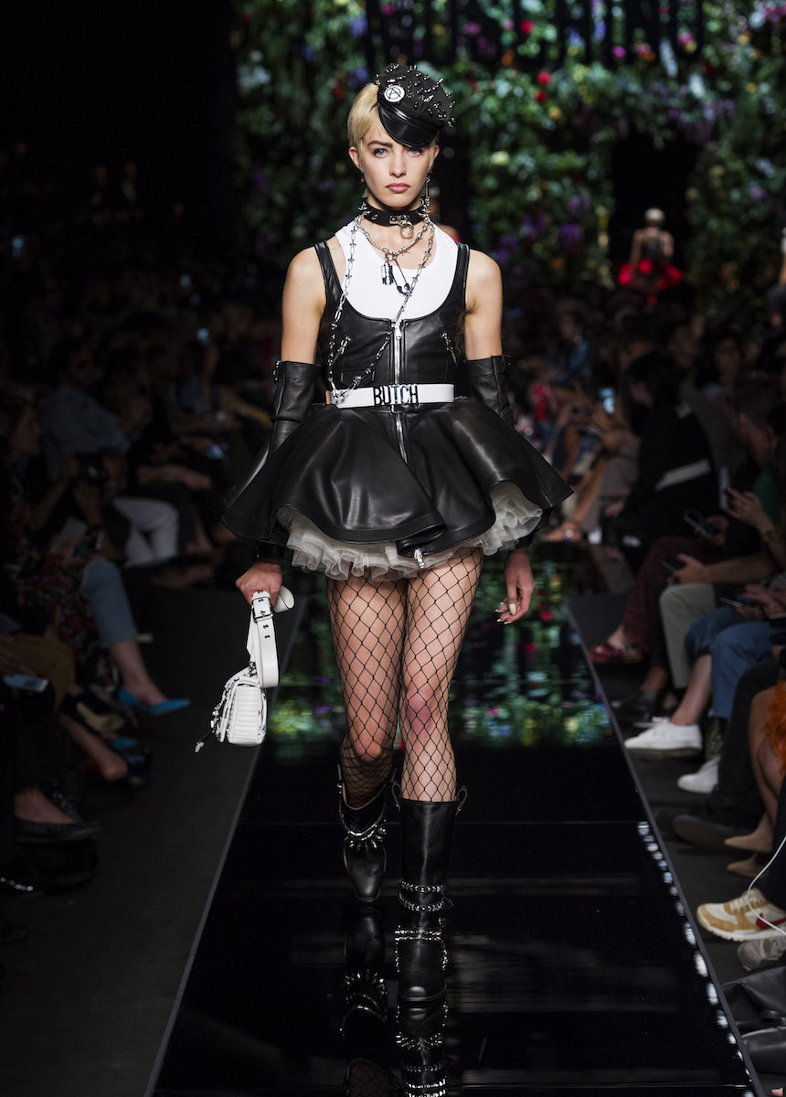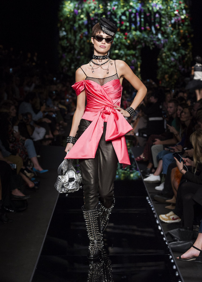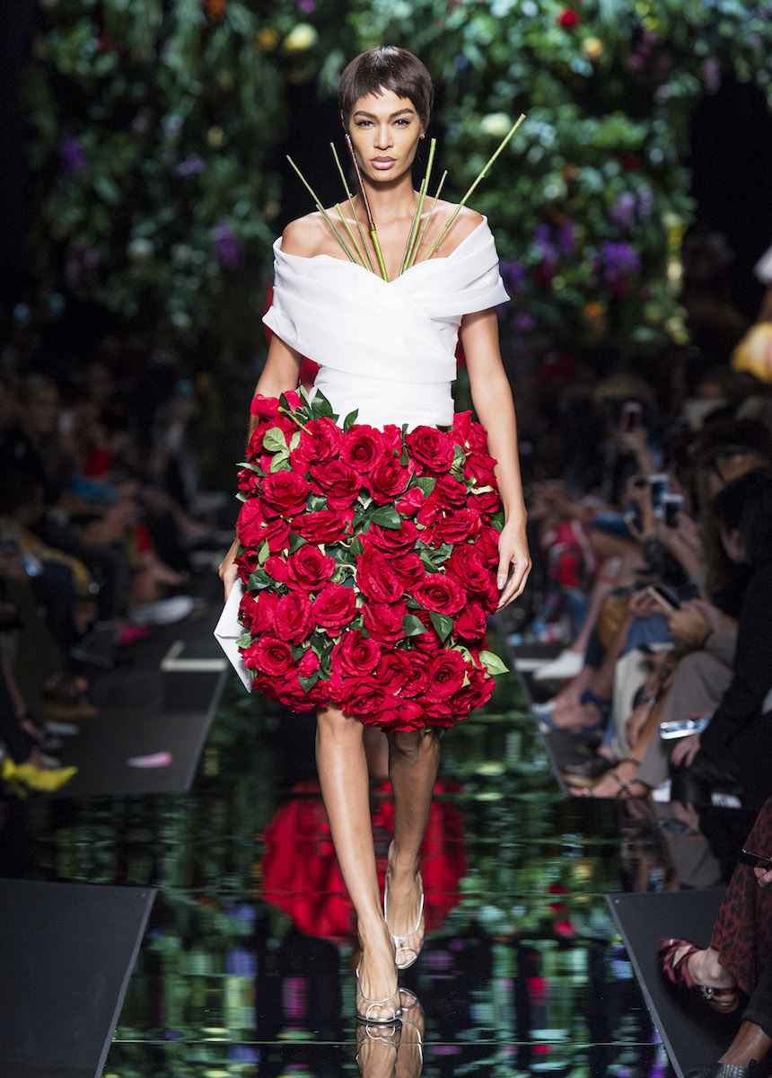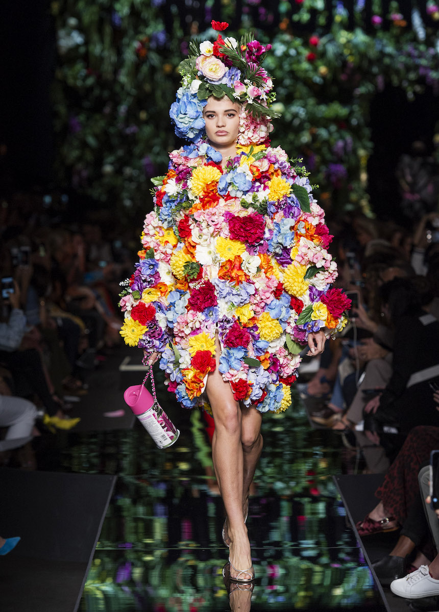 Мир Moschino, под лозунгом "Всё или ничего", снова предлагает нам яркие смелые образы без полутонов. Во второй части коллекции Джереми Скотт решил одеть своих моделей в платья в виде цветов: ирисов, лилий, орхидей и пионов. Основными материалами коллекции стали органза, кожа, шелк и трикотаж. Знаковый образ продемонстрировала Адвоа Абоа в розовой пачке и черной косухе.