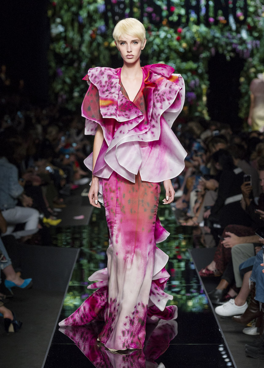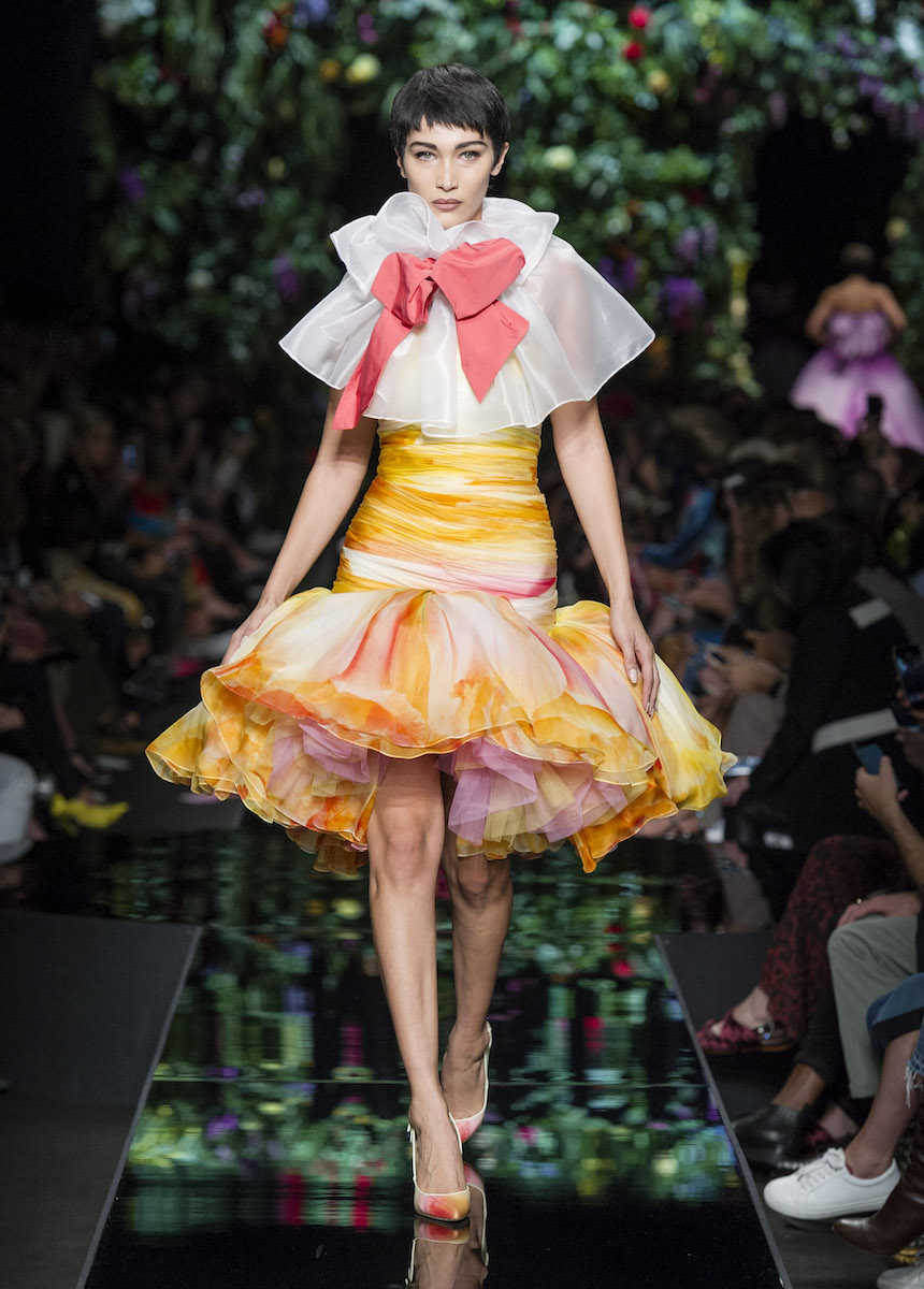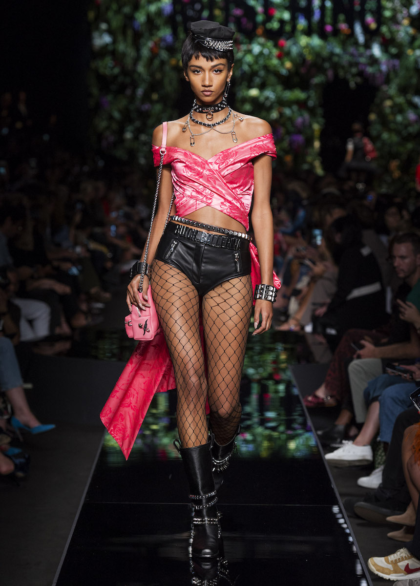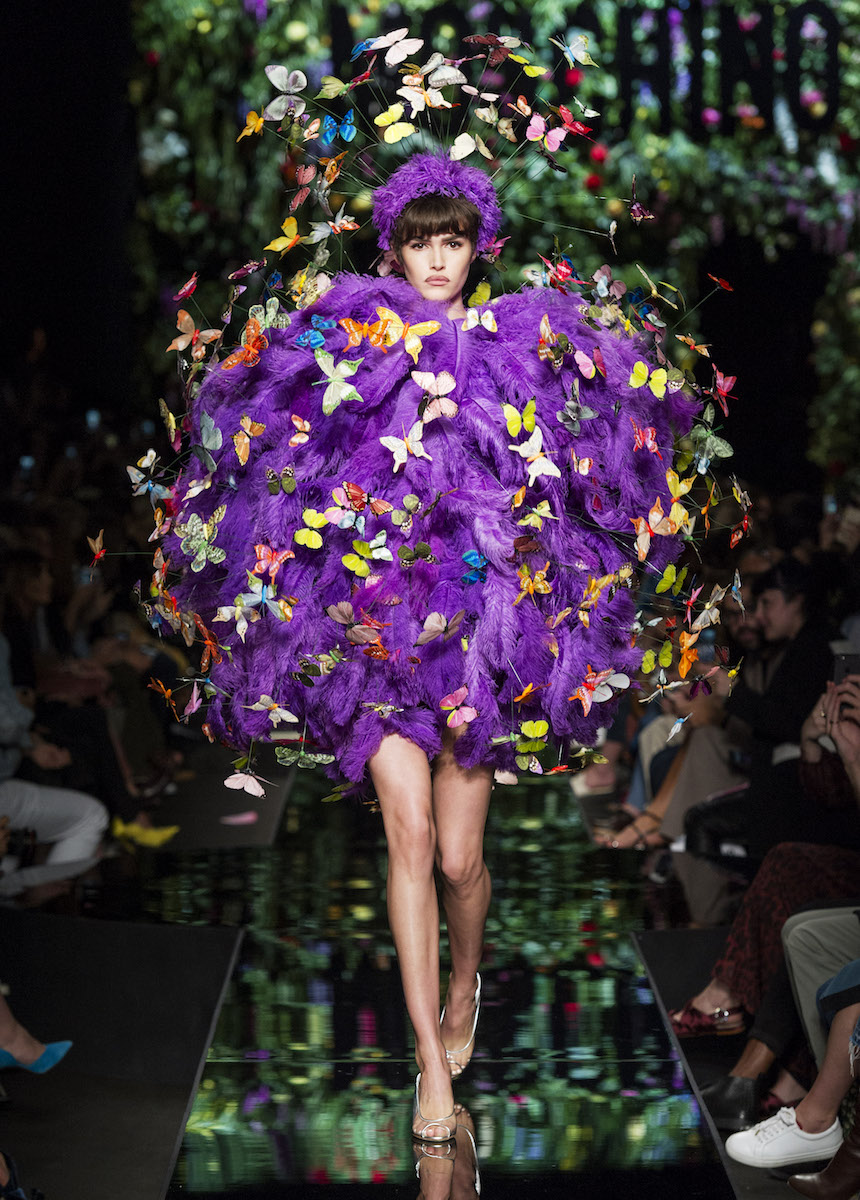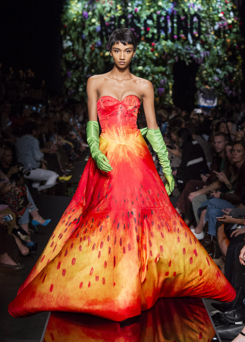Мир Moschino, под лозунгом "Всё или ничего", снова предлагает нам яркие смелые образы без полутонов. Во второй части коллекции Джереми Скотт решил одеть своих моделей в платья в виде цветов: ирисов, лилий, орхидей и пионов. Основными материалами коллекции стали органза, кожа, шелк и трикотаж. Знаковый образ продемонстрировала Адвоа Абоа в розовой пачке и черной косухе.