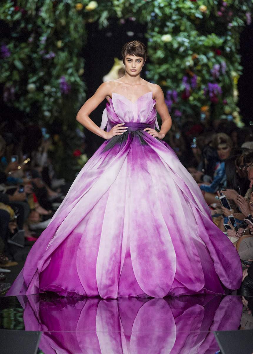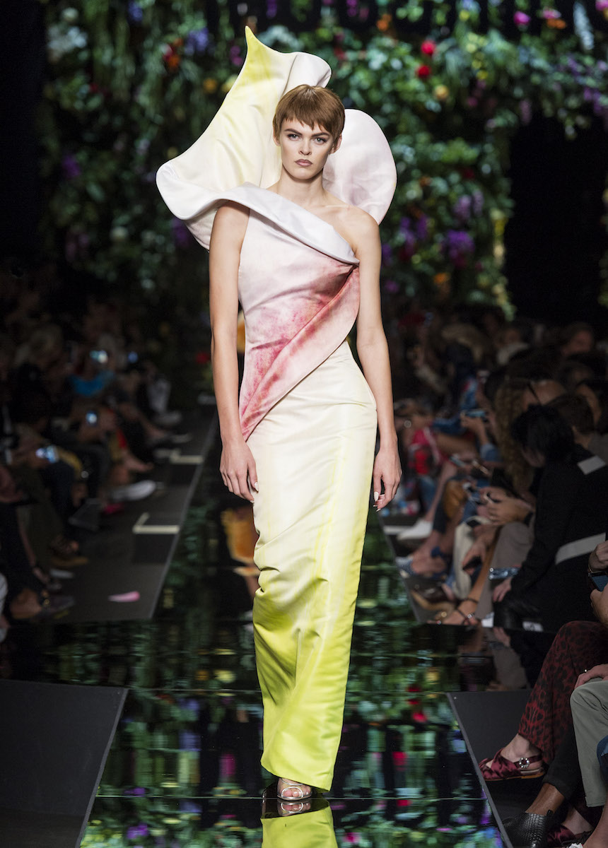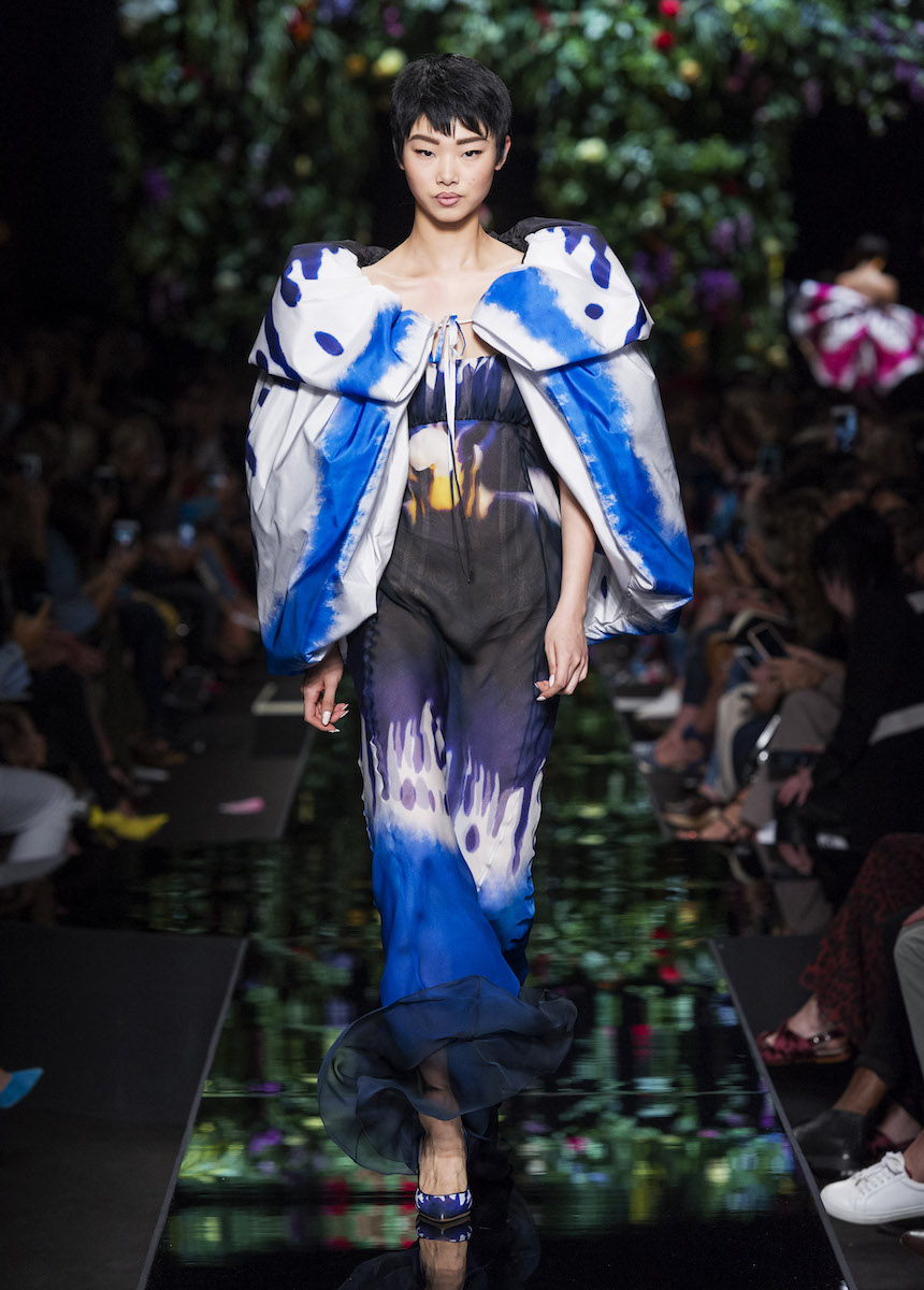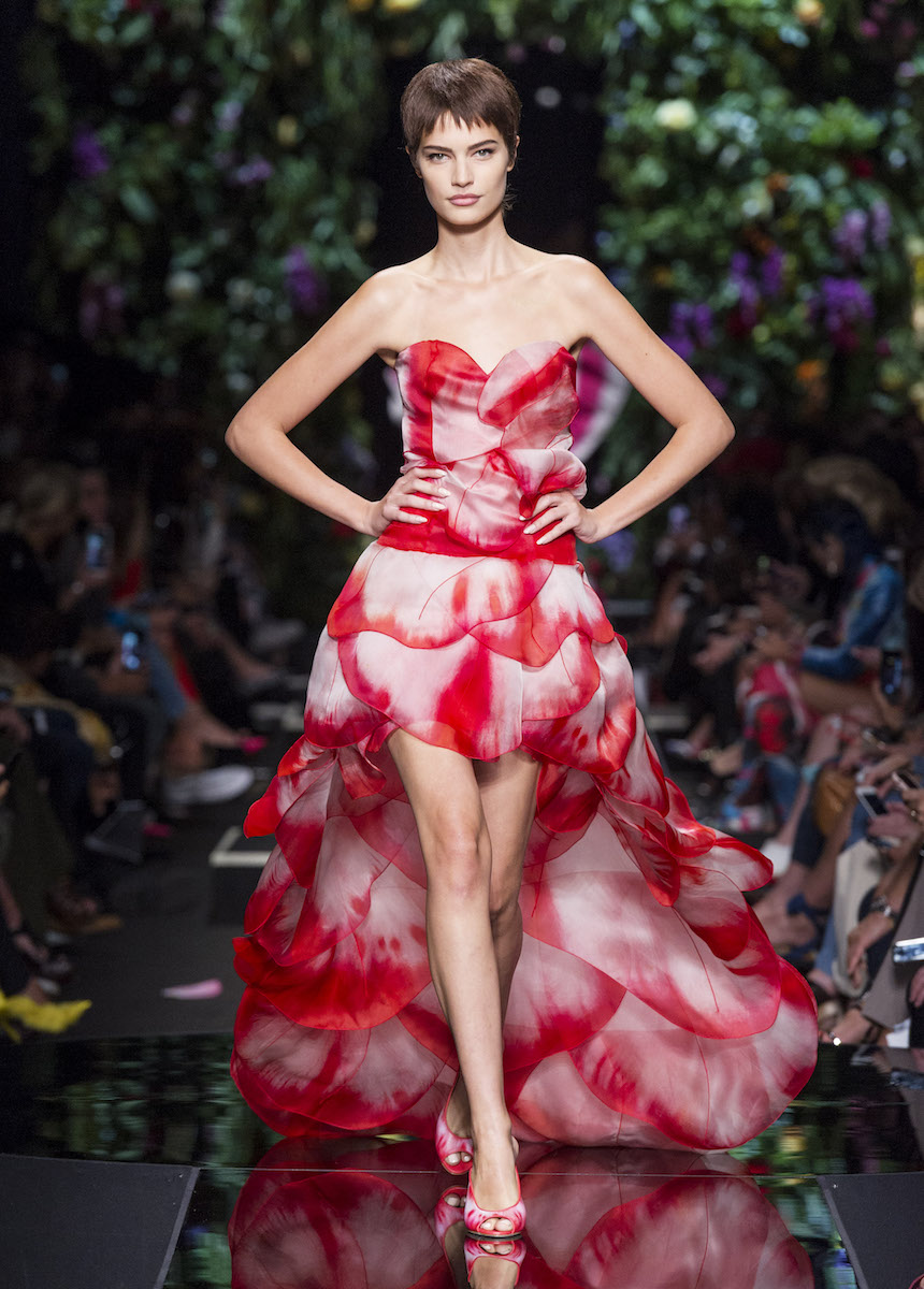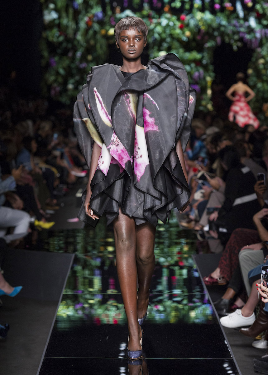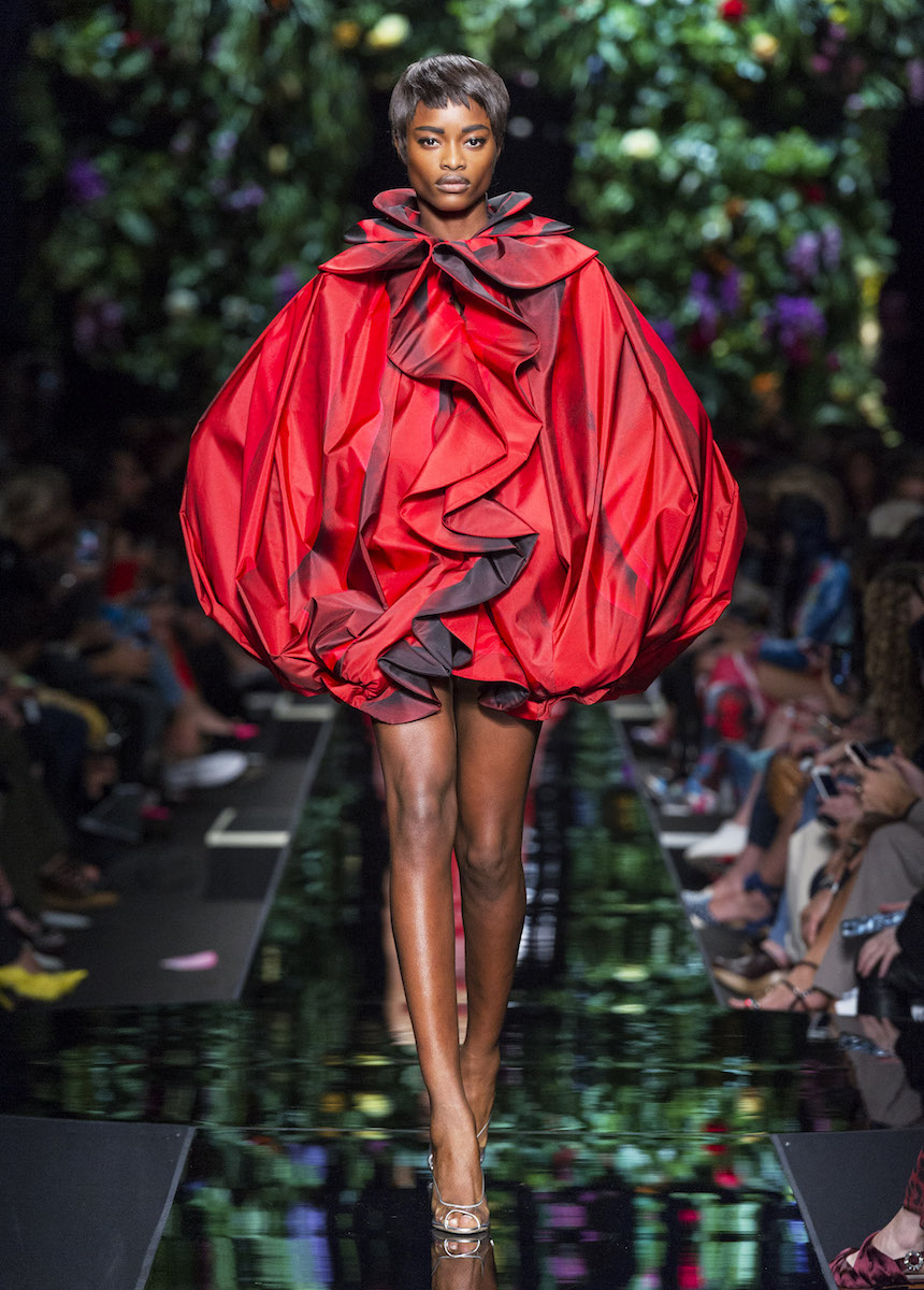 Мир Moschino, под лозунгом "Всё или ничего", снова предлагает нам яркие смелые образы без полутонов. Во второй части коллекции Джереми Скотт решил одеть своих моделей в платья в виде цветов: ирисов, лилий, орхидей и пионов. Основными материалами коллекции стали органза, кожа, шелк и трикотаж. Знаковый образ продемонстрировала Адвоа Абоа в розовой пачке и черной косухе.