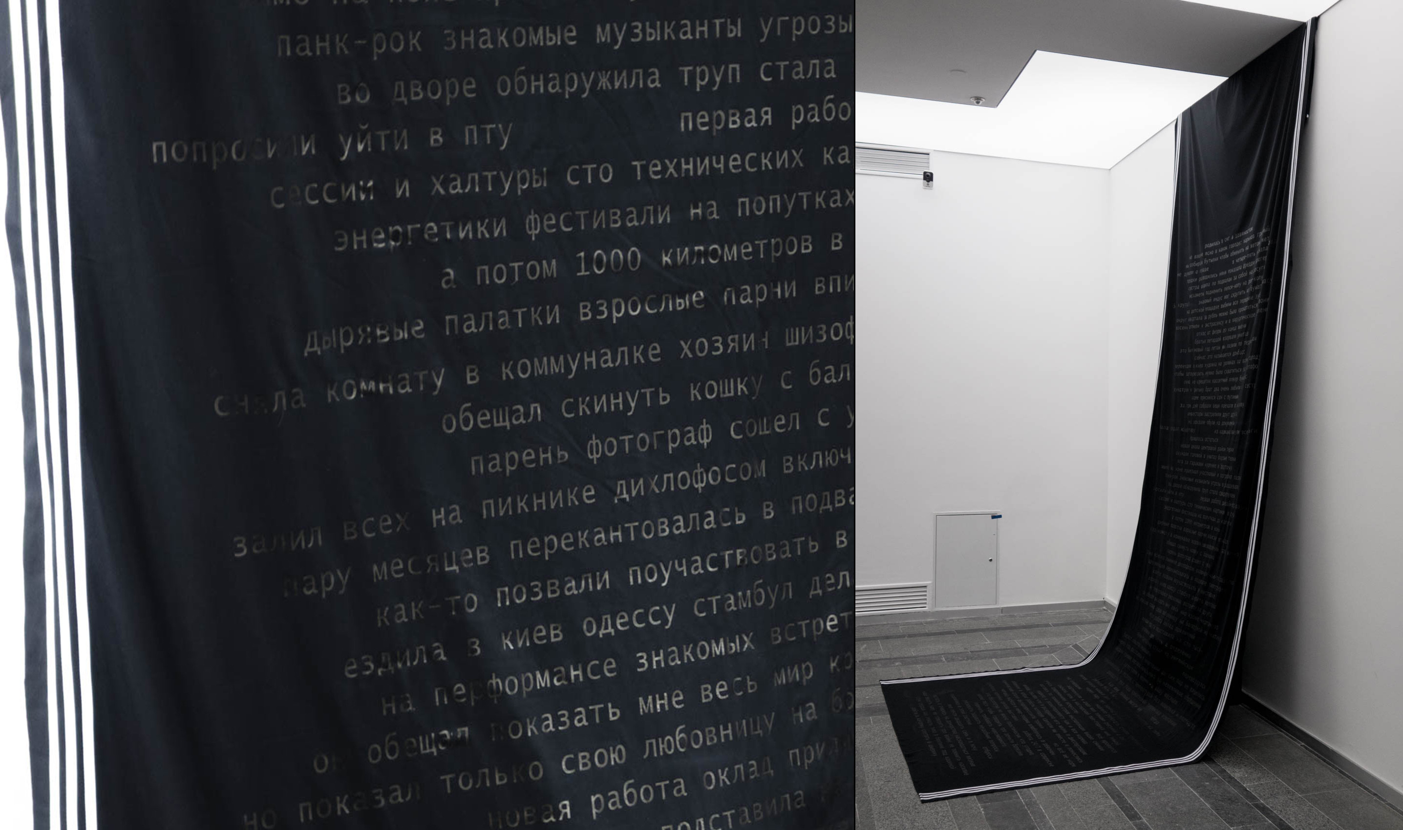 А. Р.: Это был рискованный в приятном смысле эксперимент. Меня очень раздражала тема раздвоения личности художника, которую мы с ребятами и мастером обсуждали. В контексте подготовки данной выставки чувствовался политический запашок: Россия или Украина, женщина или мужчина? Было множество идей. Я пришла к выводу, что художник — это живой механизм взвешивания, весы Фемиды, versus. Его личная жизнь, как и отдельные объекты искусства, манипулируют зрителем, оставаясь всего лишь слепками процесса. Мой рушник — это сброшенная шкура. Не нужно было ничего придумывать. Файл с текстом-оммажем нашелся на рабочем столе компьютера, форма родилась сразу, я сидела на табуретке в спортивных штанах.