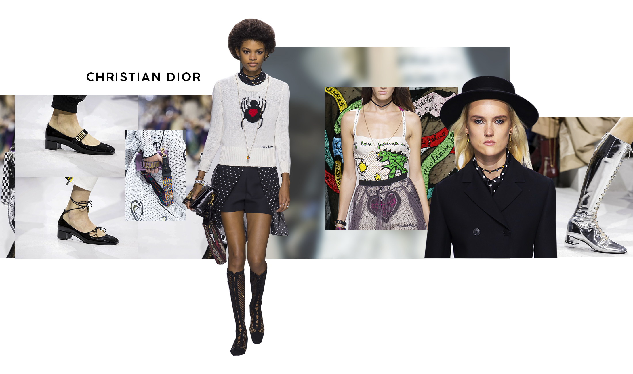 Мария Грация-Кьюри вдохновилась творчеством художницы Ники де Сен-Фалль; а также, памятуя о репутации Диора как защитника женственности в нарядах, она добавила в коллекцию подчеркнуто девичьи детали — черные вуалетки в мелкий горошек, береты, органзу и логотипы Dior на туфлях Мэри джейн и сумках.